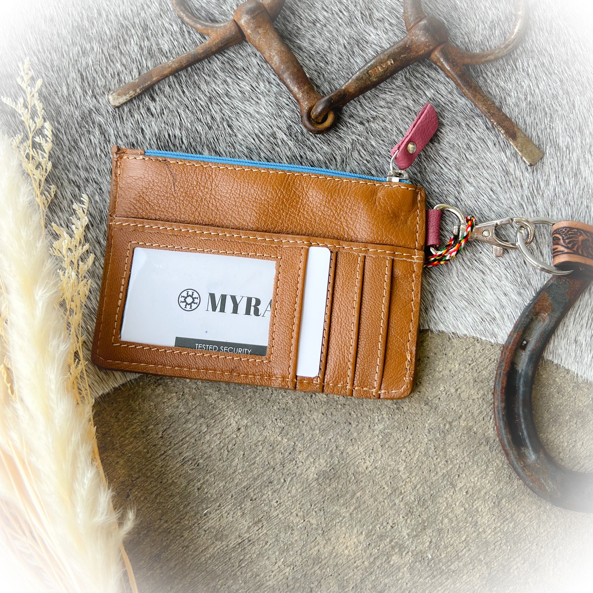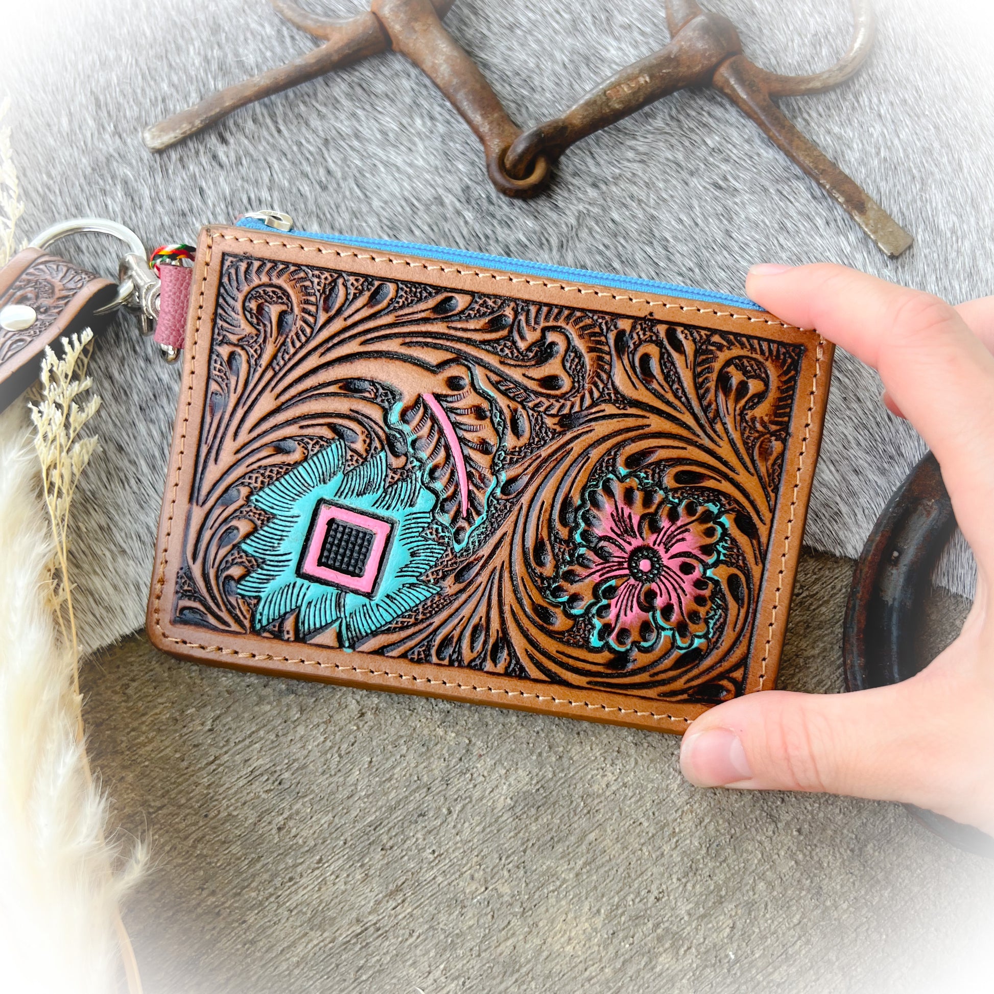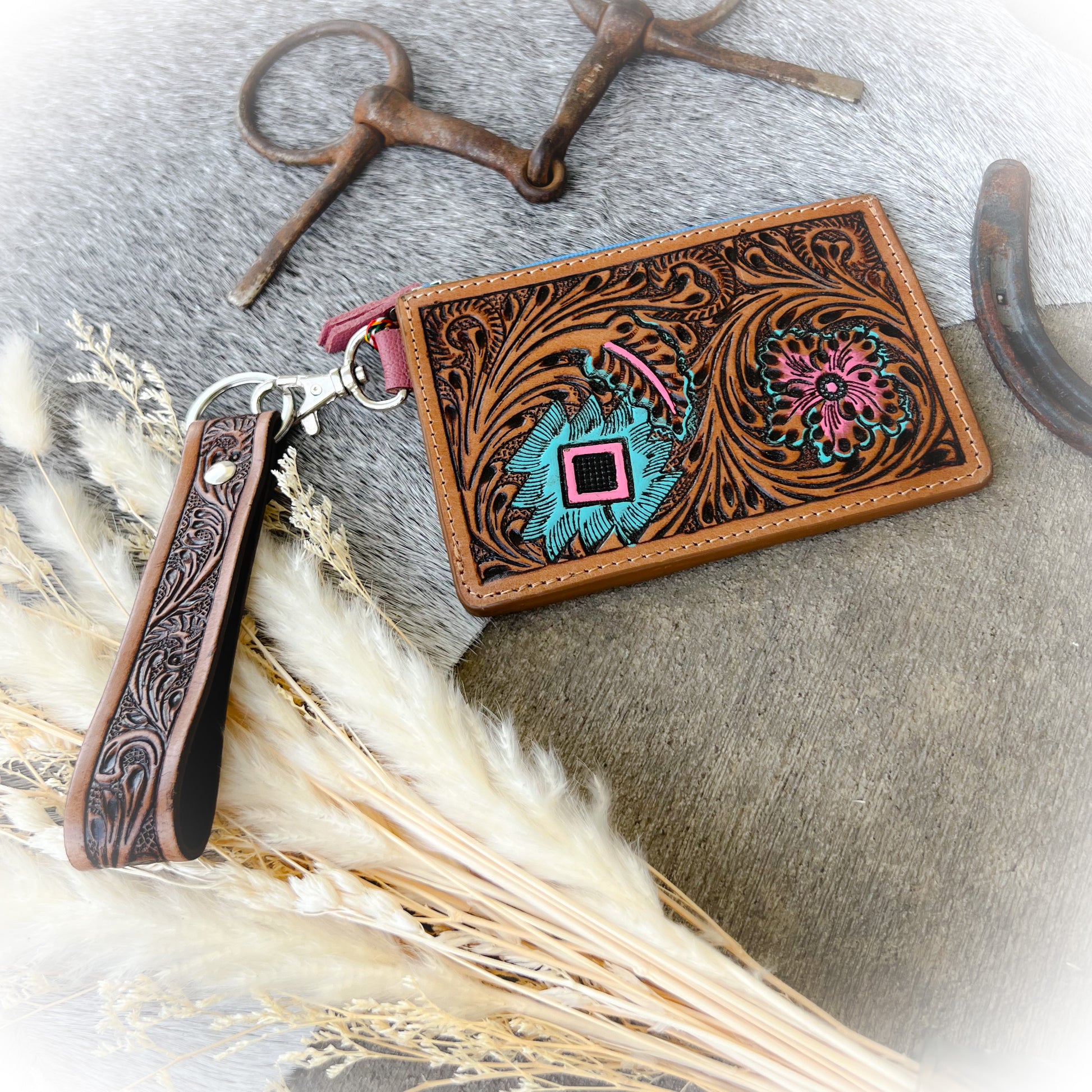 Keep your essentials secure in true western style with this Western Tooled Leather Card Holder with Removable Wristlet Strap. Crafted from genuine leather, this compact yet functional wallet features a hand-tooled floral scroll design with a central flower and Aztec symbol, giving it a timeless, authentic look. Designed for both style and convenience, it includes multiple card slots, a zipper coin pocket, and an ID window for quick access. The removable 4-inch leather wristlet strap makes it easy to carry on its own or clip inside your bag. Perfect for rodeo nights, festivals, and everyday adventures.