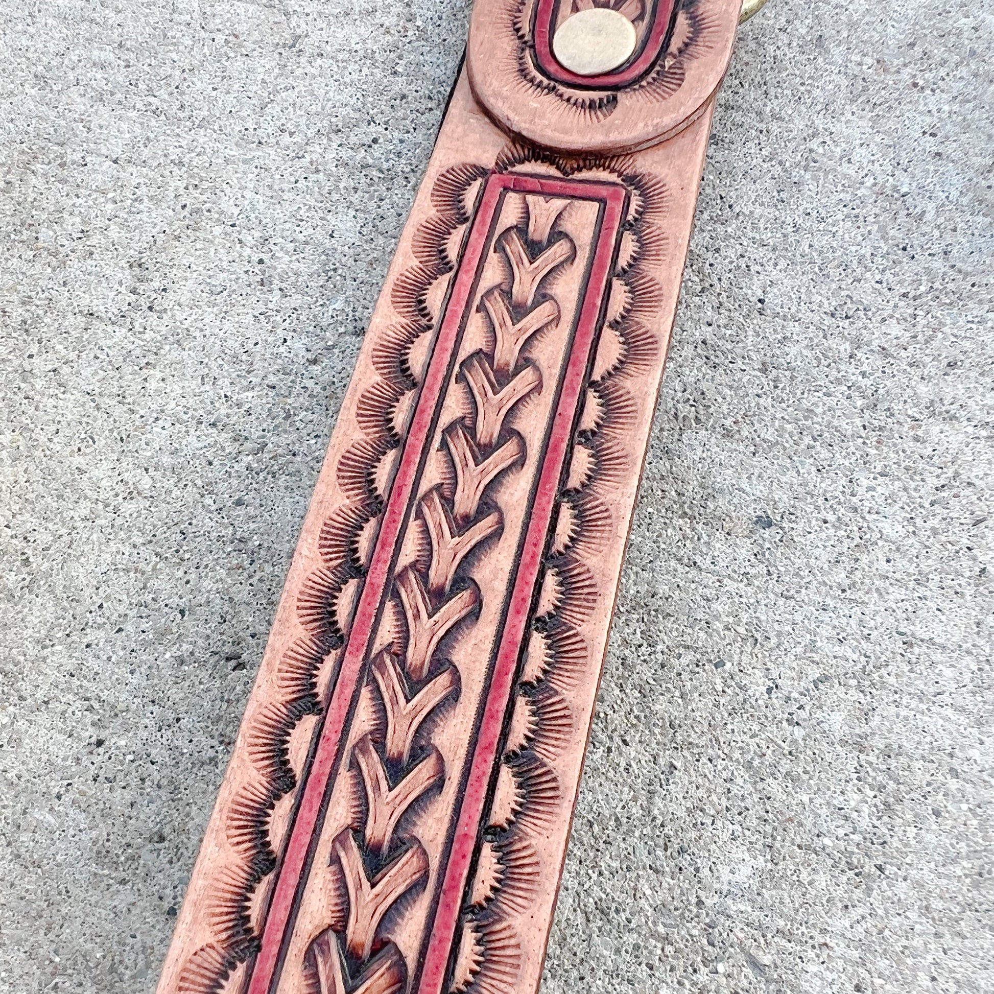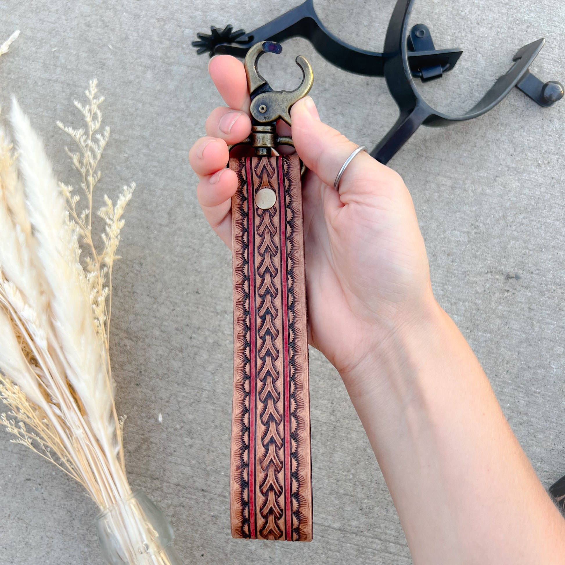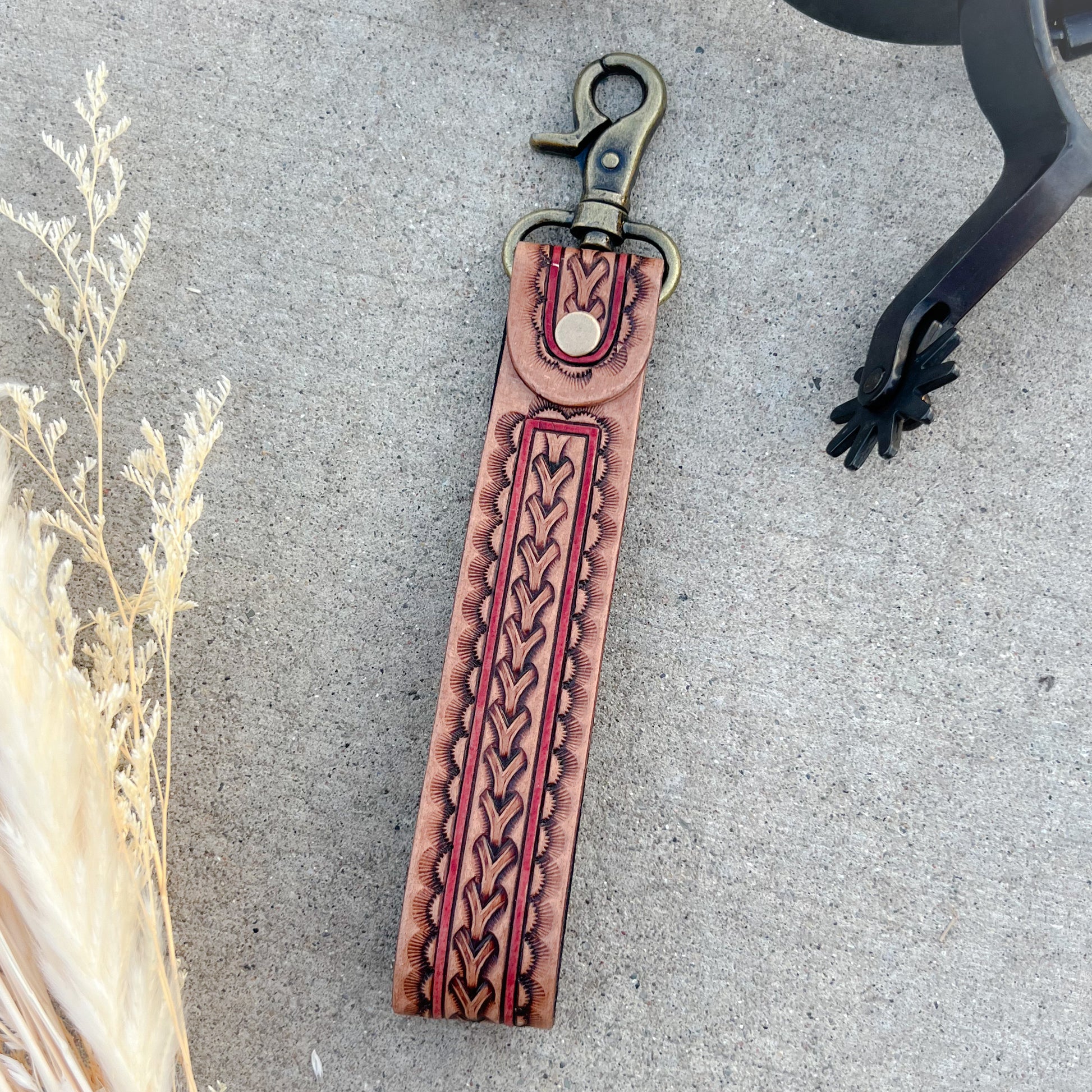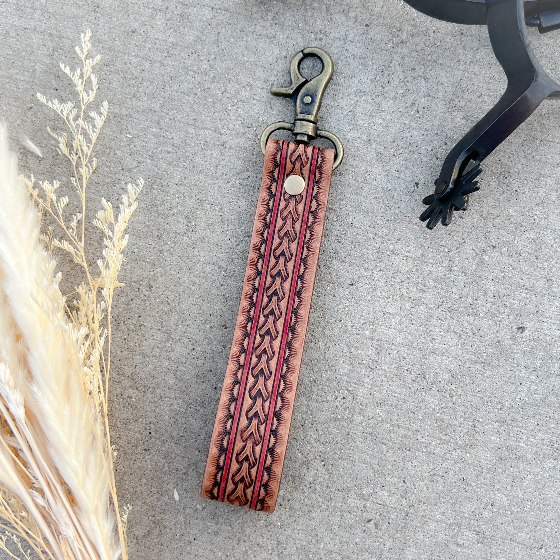 Elevate your everyday essentials with this bold and rugged Western Tooled Leather Keychain, featuring rich natural brown leather and vibrant red stripe accents on each side. The detailed tooled pattern brings that authentic western feel, while the pop of red adds a modern, eye-catching twist.