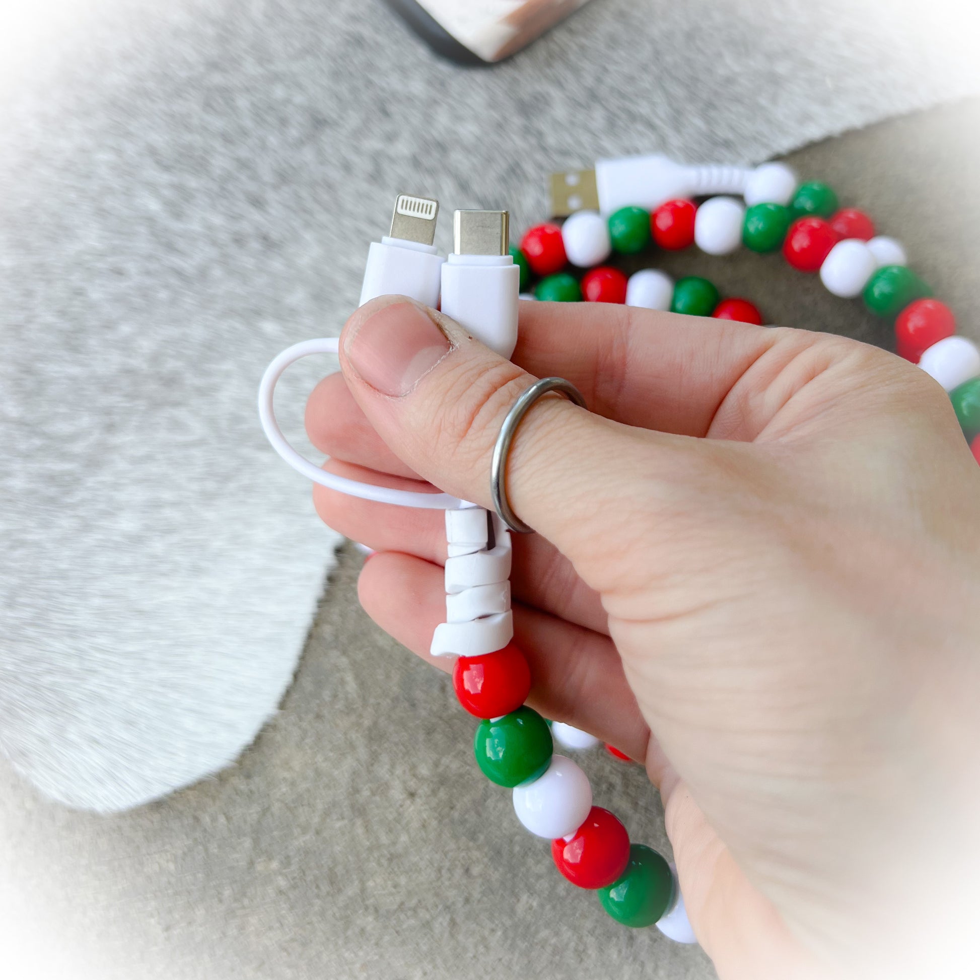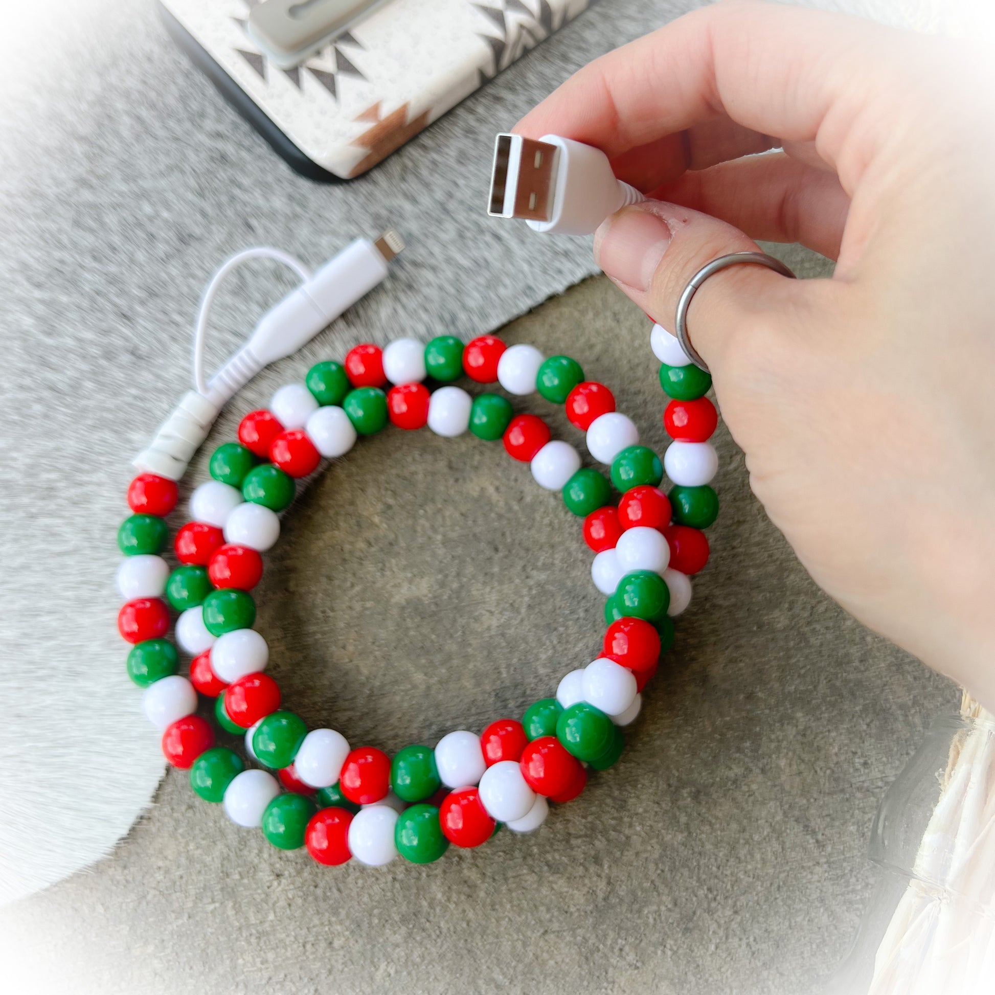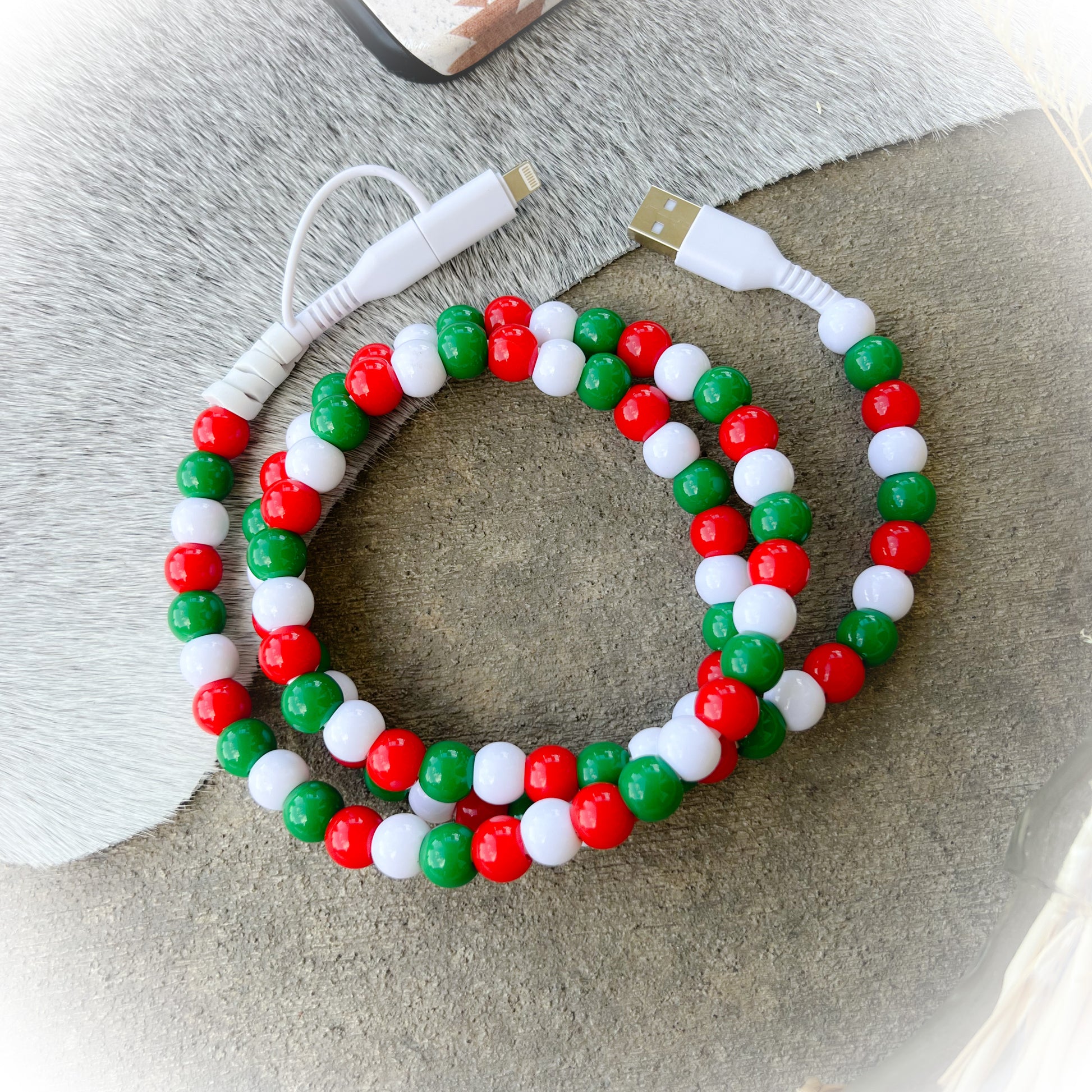 Charge in style with this christmas glam twist on a tech essential! This 3-foot long christmas color themed pearl beaded charger is the perfect mix of function and fashion. Designed to look like a statement accessory.