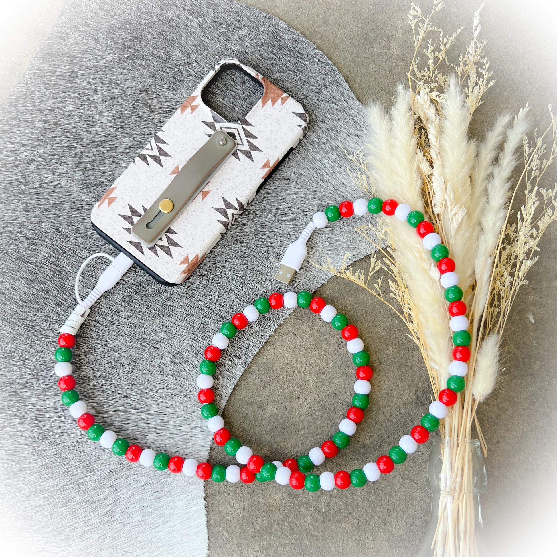 Red, White, & Green Christmas Pearl Beaded 3-in-1 Phone Charger