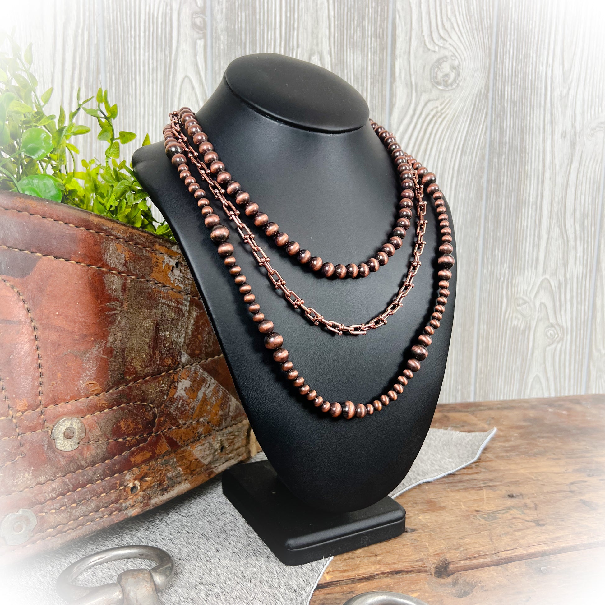 Bold, dimensional, and full of western attitude—the Crazy Sorrel Western Layered Necklace – Bronze is a statement piece made to stand out. Featuring three perfectly layered strands of faux Navajo-style pearls in a warm bronze finish, this necklace delivers effortless western style in one easy-to-wear piece.