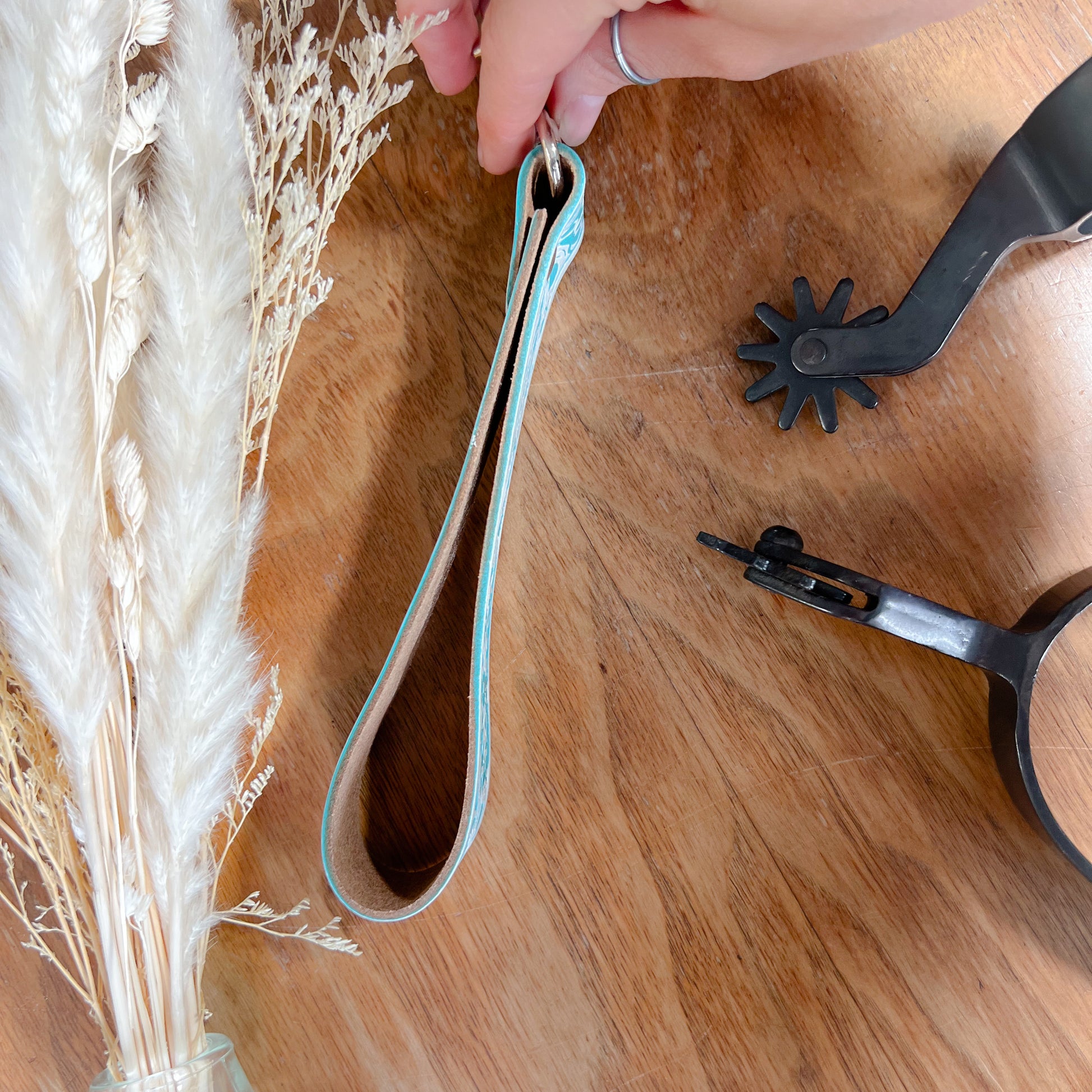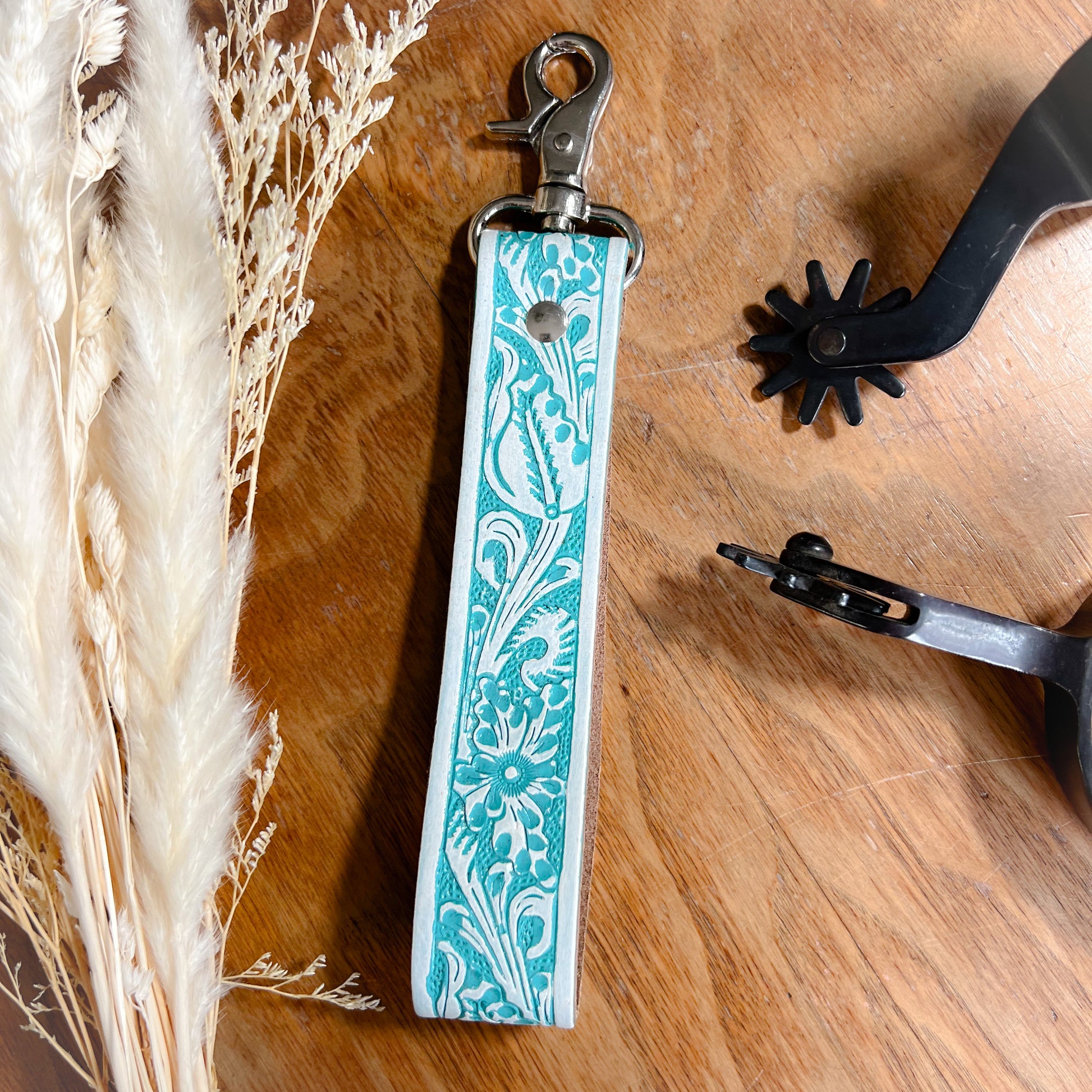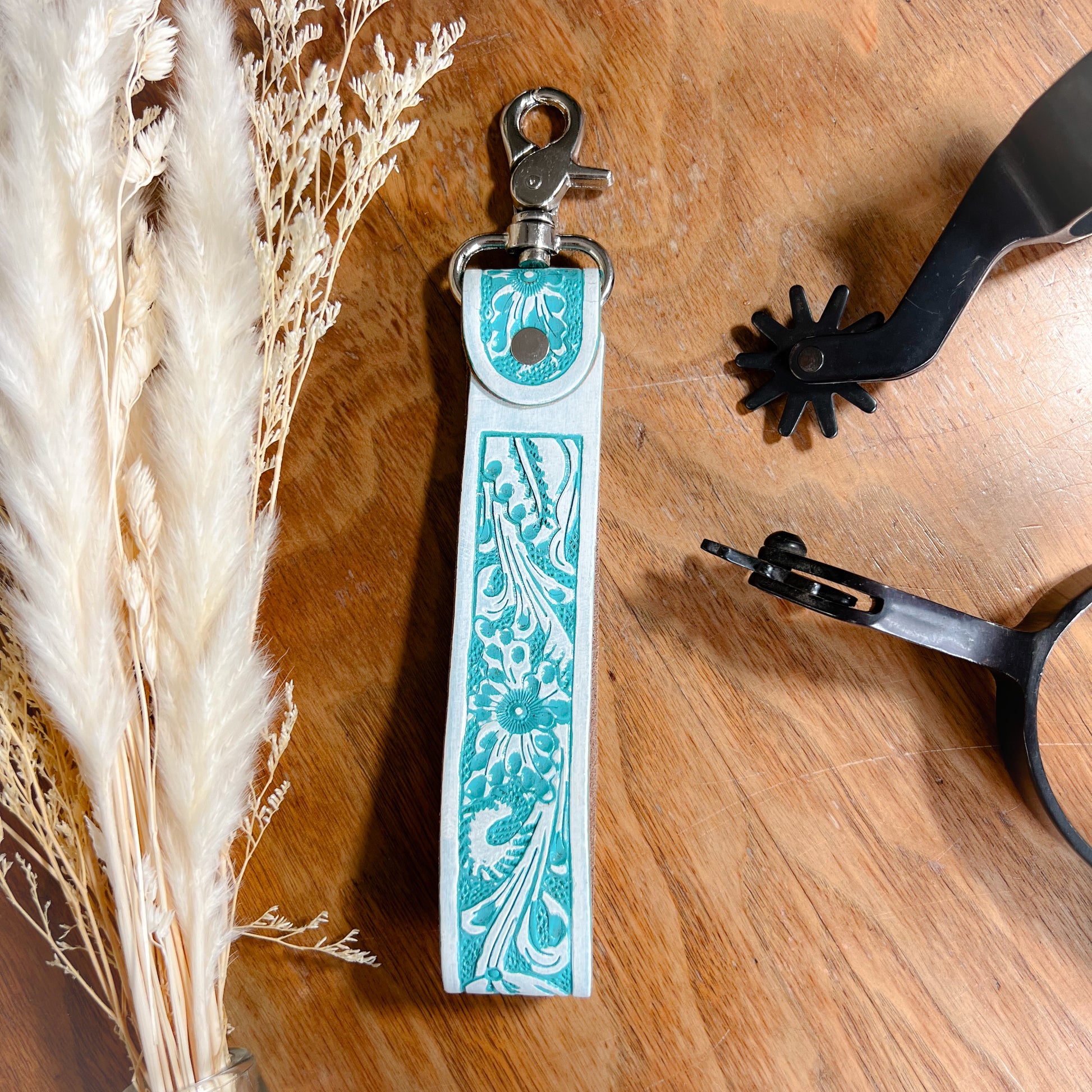Bold, beautiful, and built for everyday use the Desert Sky Tooled Leather Keychain is a must-have for western style lovers. Crafted from genuine leather, this piece features an intricate floral tooling pattern in white and turquoise that feels fresh, feminine, and a little bit fierce.