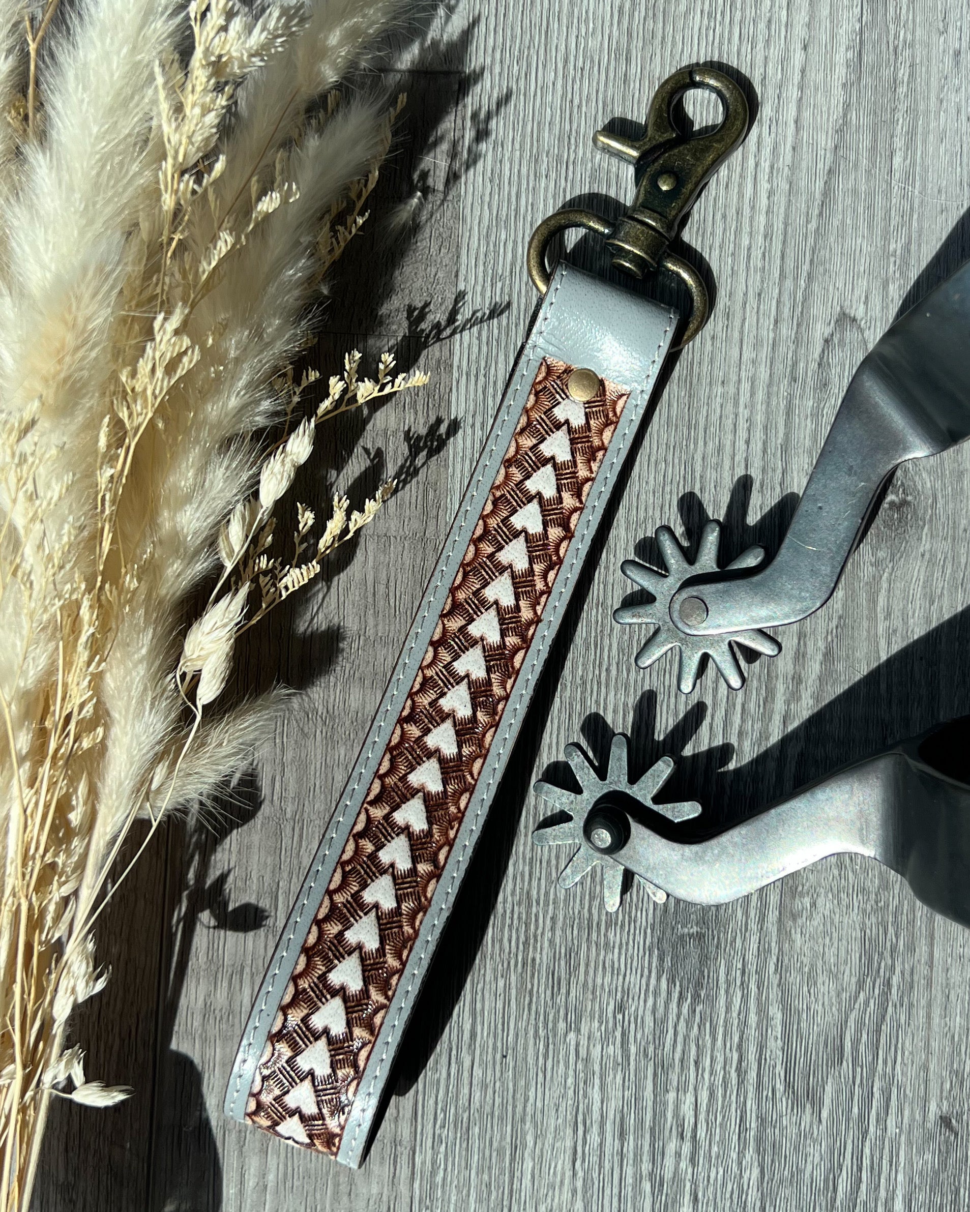 Grey & White Tooled Leather Keychain – Western Concho