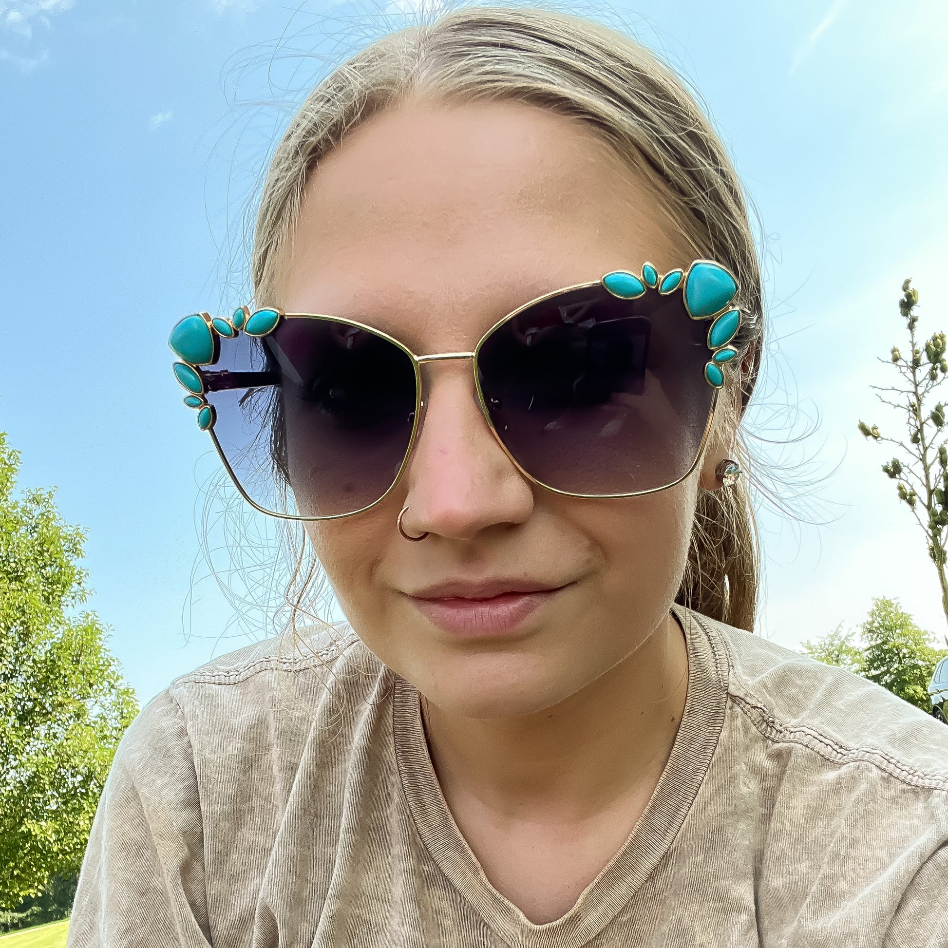 Make a bold high-class statement with these western boho cat eye sunglasses featuring oversized black lenses, a sleek gold metal frame, and stunning faux turquoise stone accents that bring serious cowgirl-meets-rich vibes.