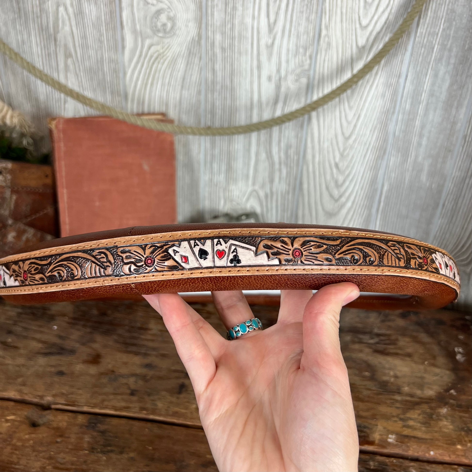 Upgrade your ride with true western style using our Western Tooled Leather Steering Wheel Cover. Designed with floral tooled leather sides featuring playing card Aces and a soft brown leather front, this cover combines comfort, grip, and cowboy flair in one.