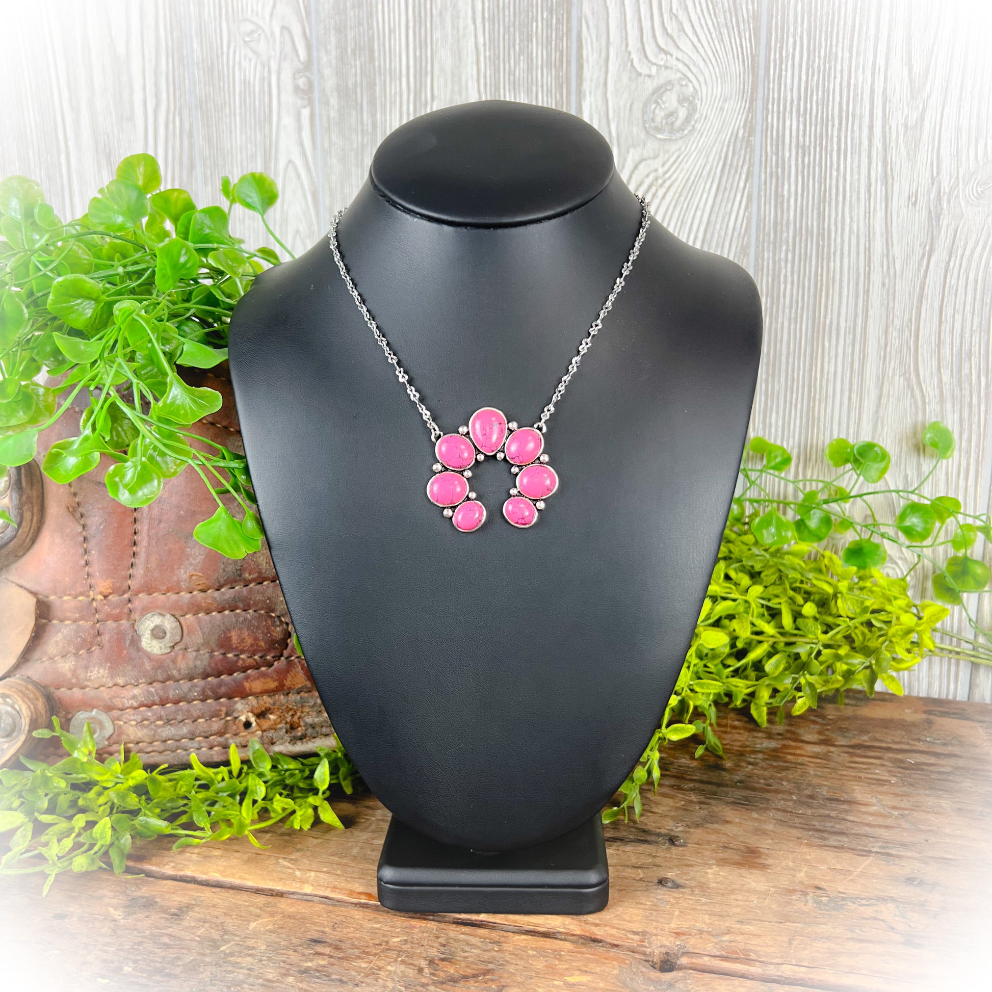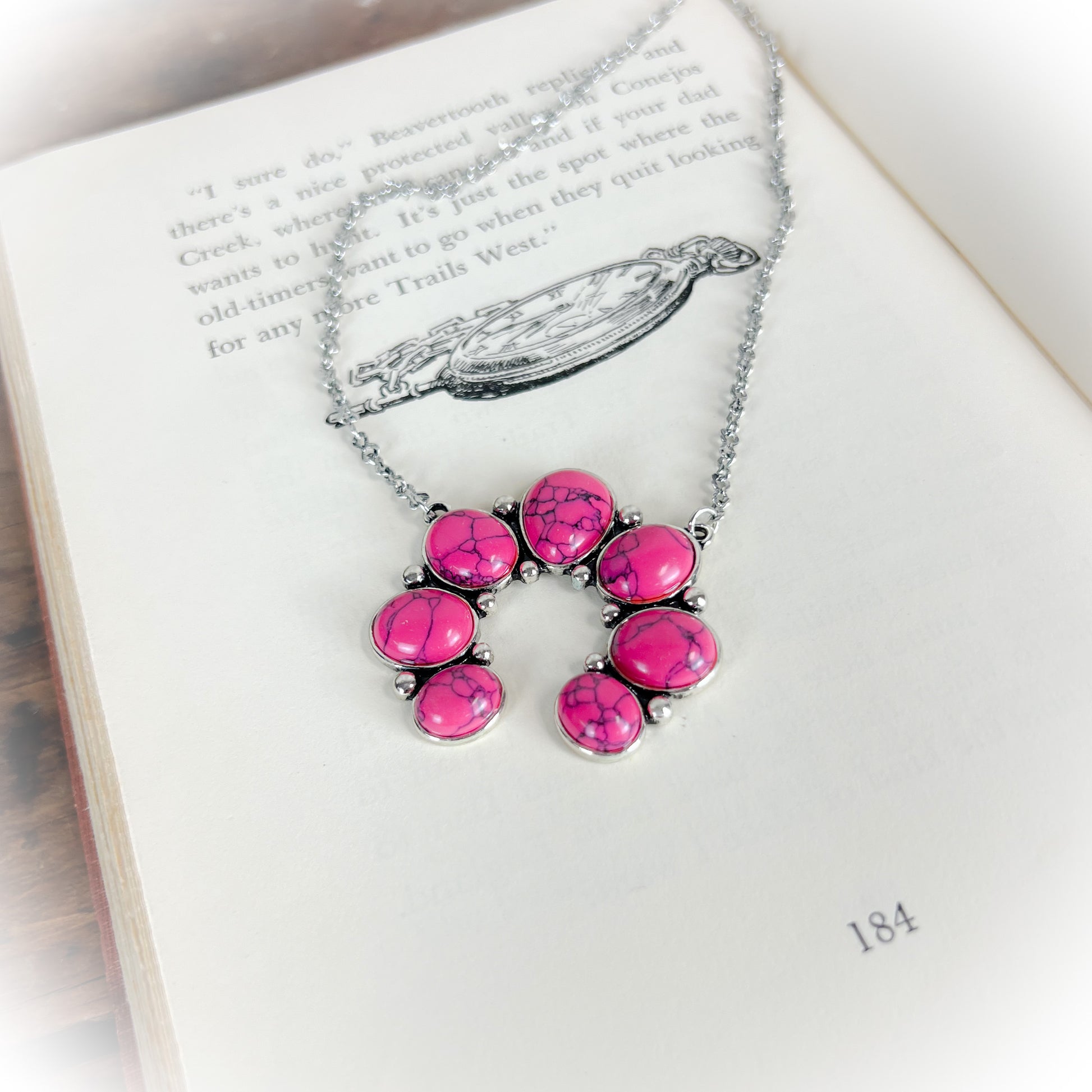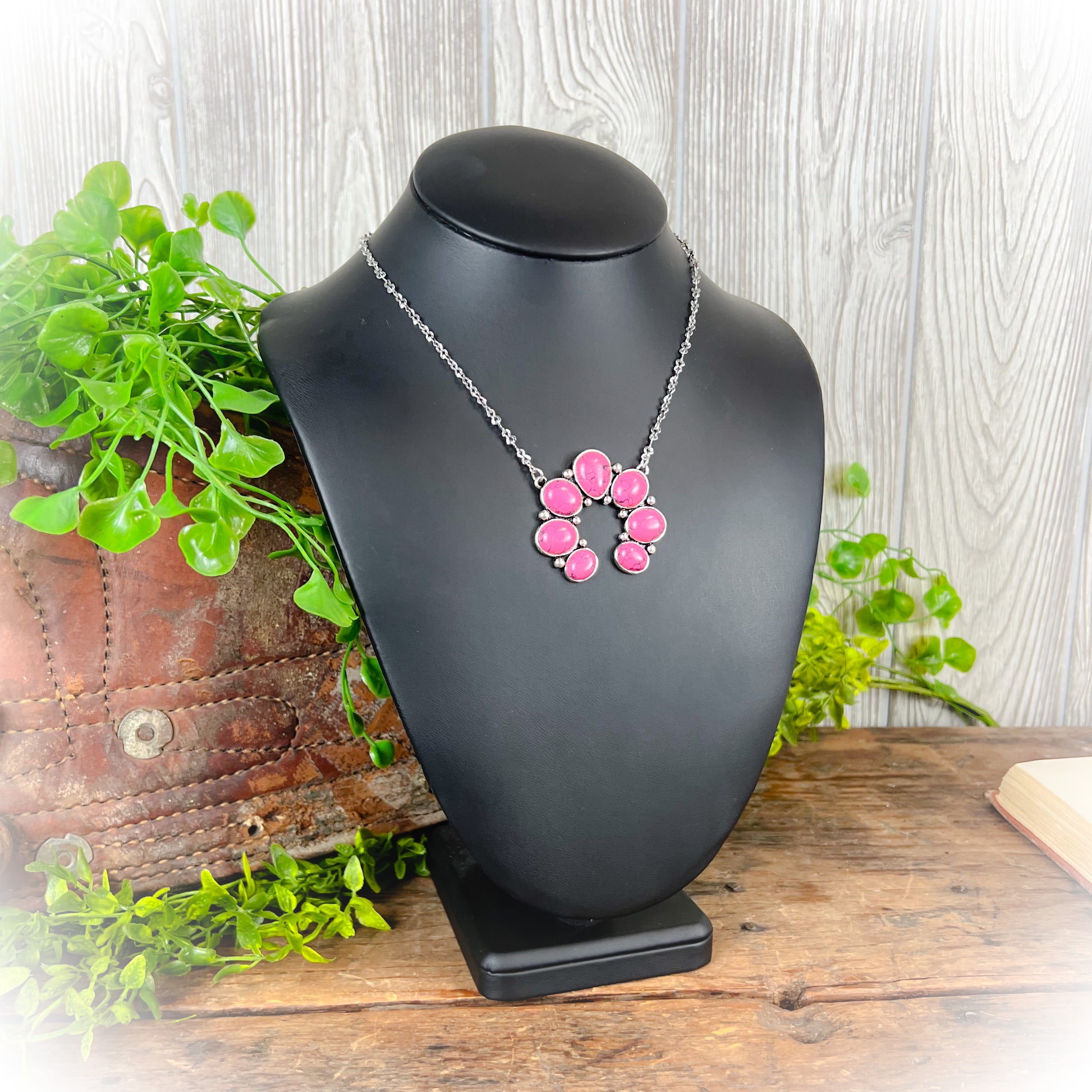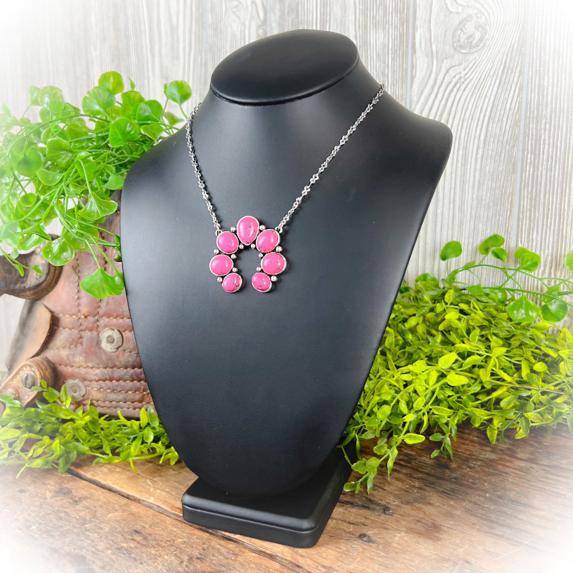 Make a bold statement with this Hot Pink Squash Blossom Pendant Necklace. Featuring a vibrant hot pink squash blossom pendant on a classic silver-tone chain, this piece blends traditional western style with a fun, modern pop of color. Lightweight yet eye-catching, it’s perfect for dressing up a rodeo outfit, adding flair to a casual tee, or turning heads at your next country concert.