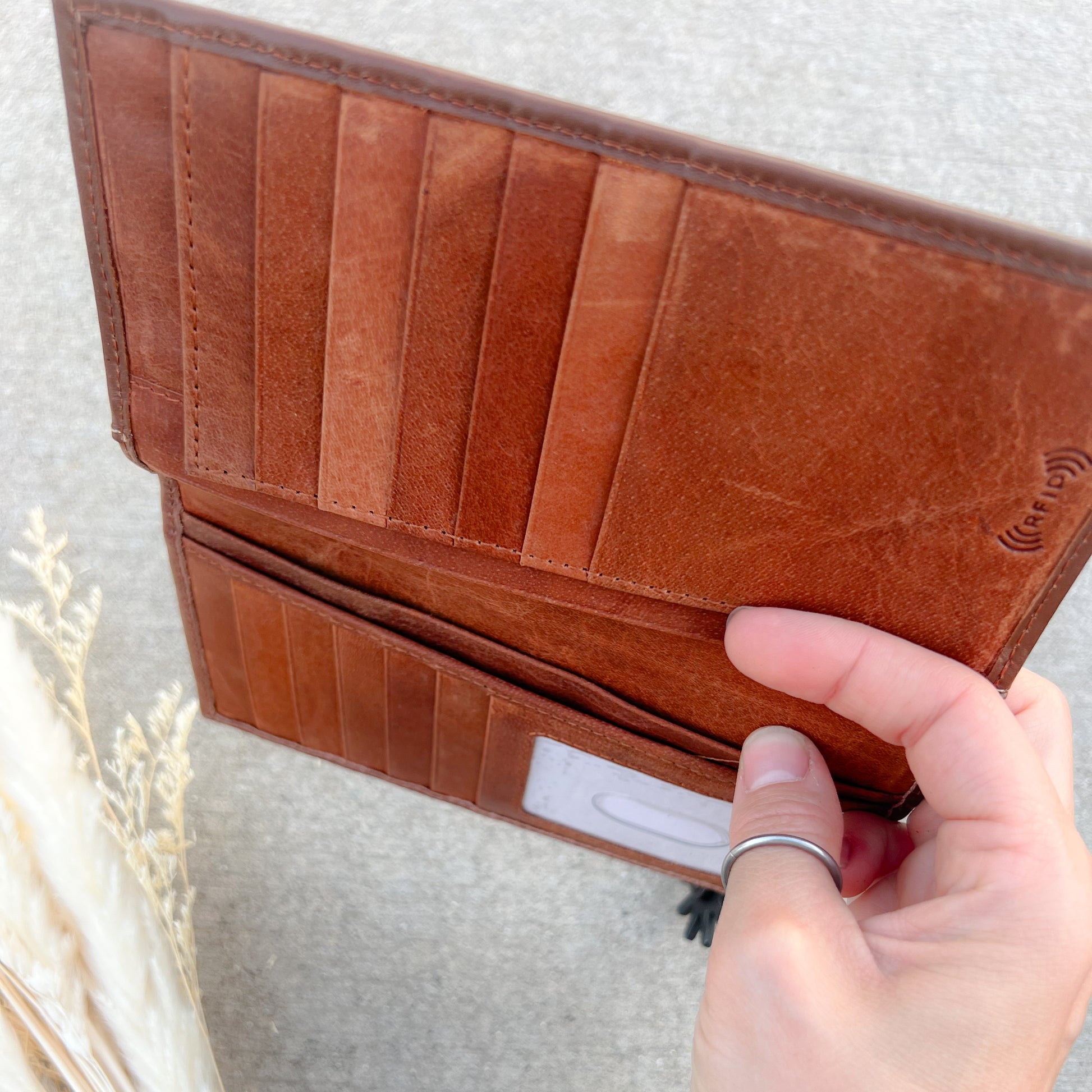 At 6.75" H x 3.7" W, it fits comfortably in most back pockets or jacket pockets while offering ample space without the bulk. The sleek inner leather finish ensures cards slide in and out easily while maintaining durability for years of wear.