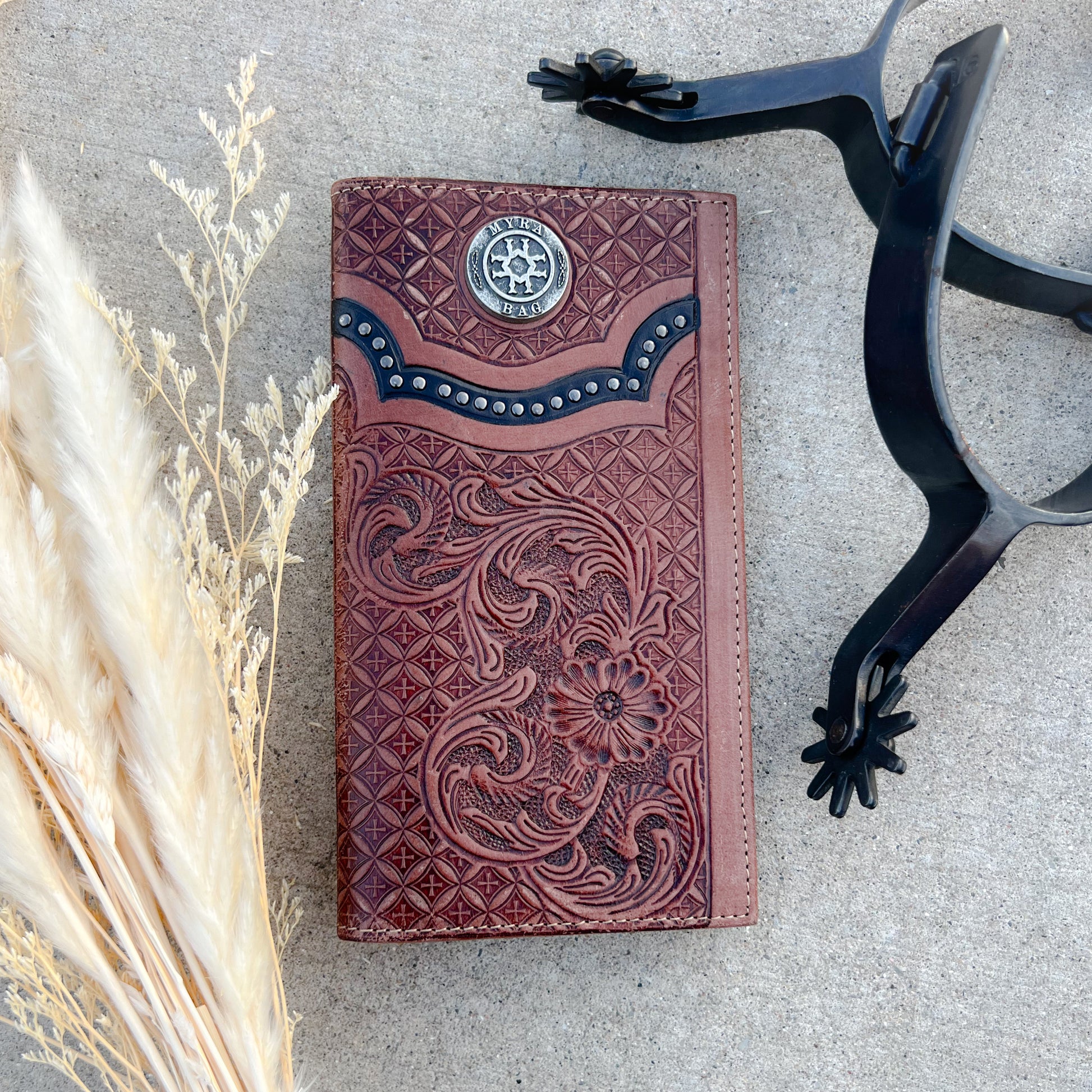Elevate your western look with our Western Tooled Leather Men’s Rodeo Wallet, where rugged cowboy style meets everyday function. Crafted from premium tooled leather, this long-style wallet features a smooth leather interior and an antique coin-style concho on the front for a classic western finish.