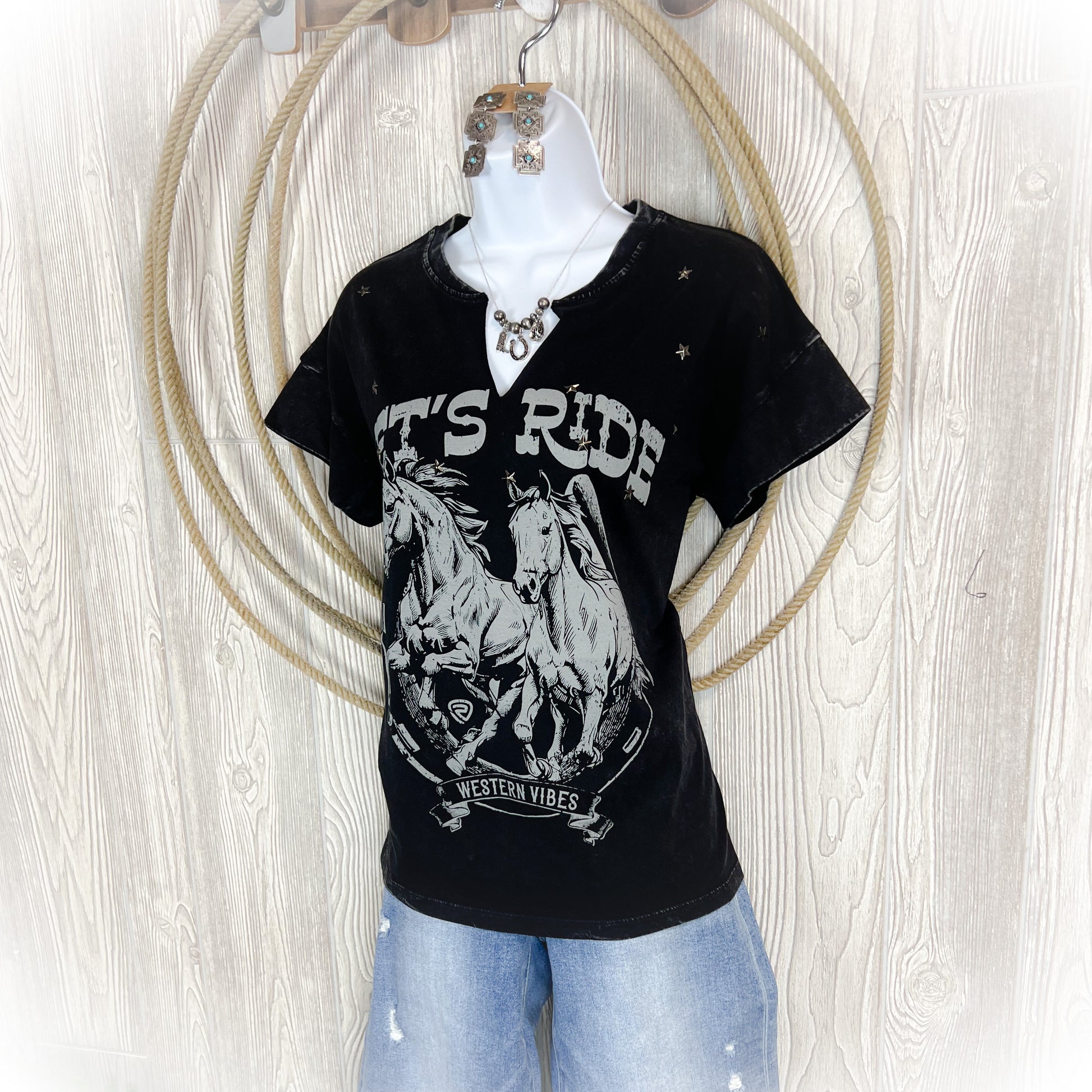 Saddle up in standout western style with the Let’s Ride Western Star Stud Graphic Tee. This tee features a bold “Let’s Ride” graphic with two running horses framed by a horseshoe, finished with subtle star stud detailing for the perfect mix of grit and glam.