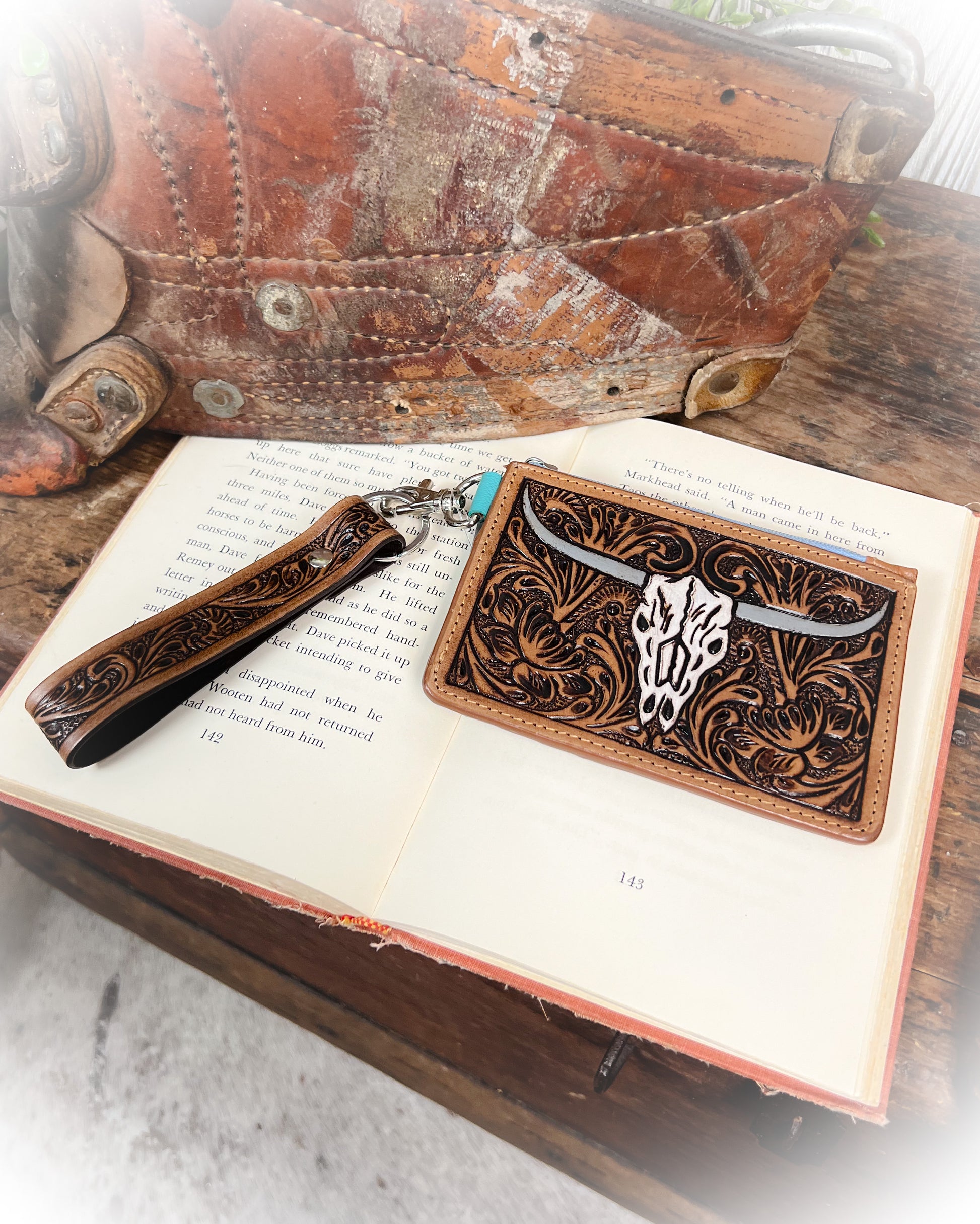 Meet your new go-to: the Tooled Leather Bull Skull Card Holder. Crafted from genuine leather with intricate western tooling and a bold longhorn skull design, this compact beauty blends rugged charm with real-world function.