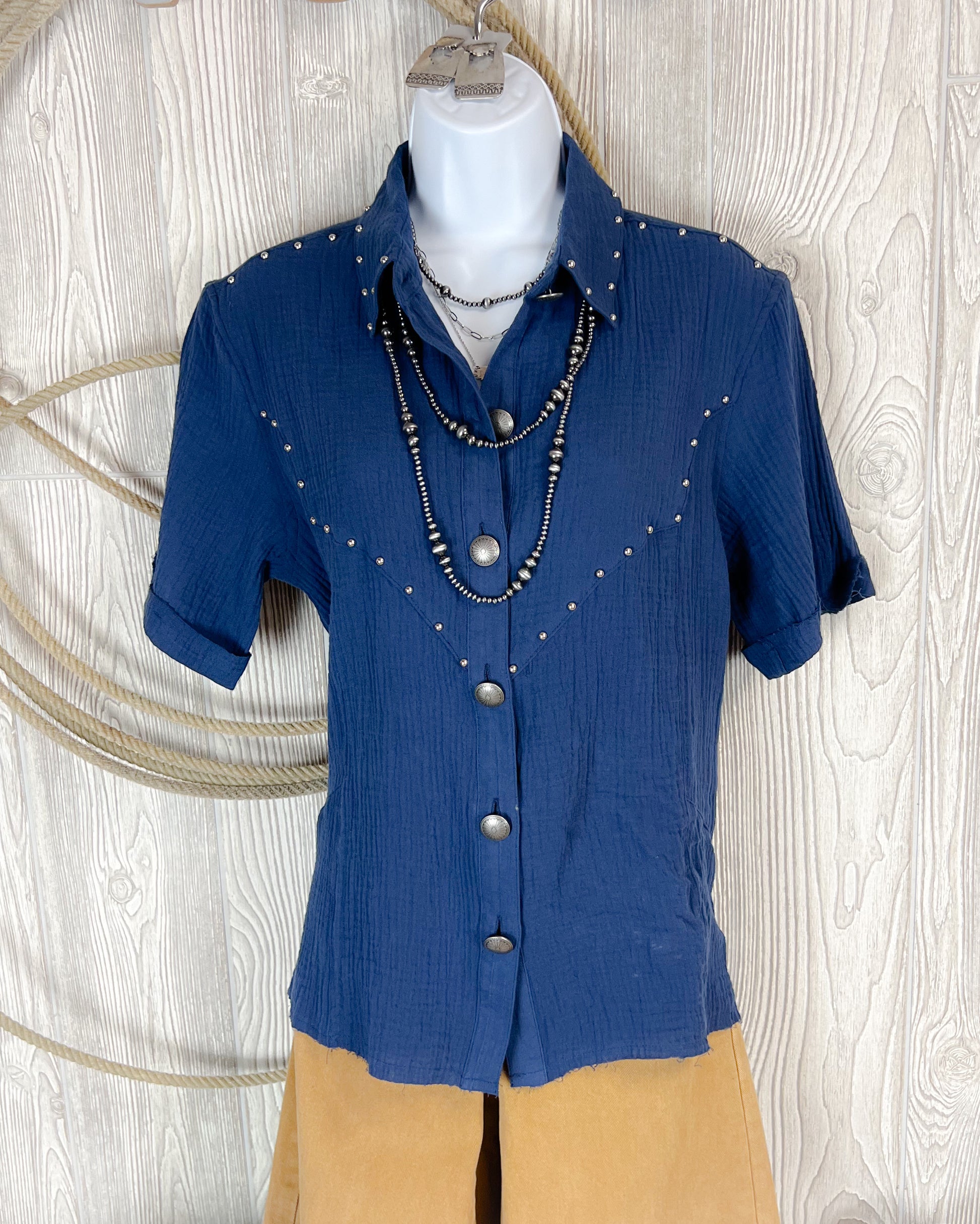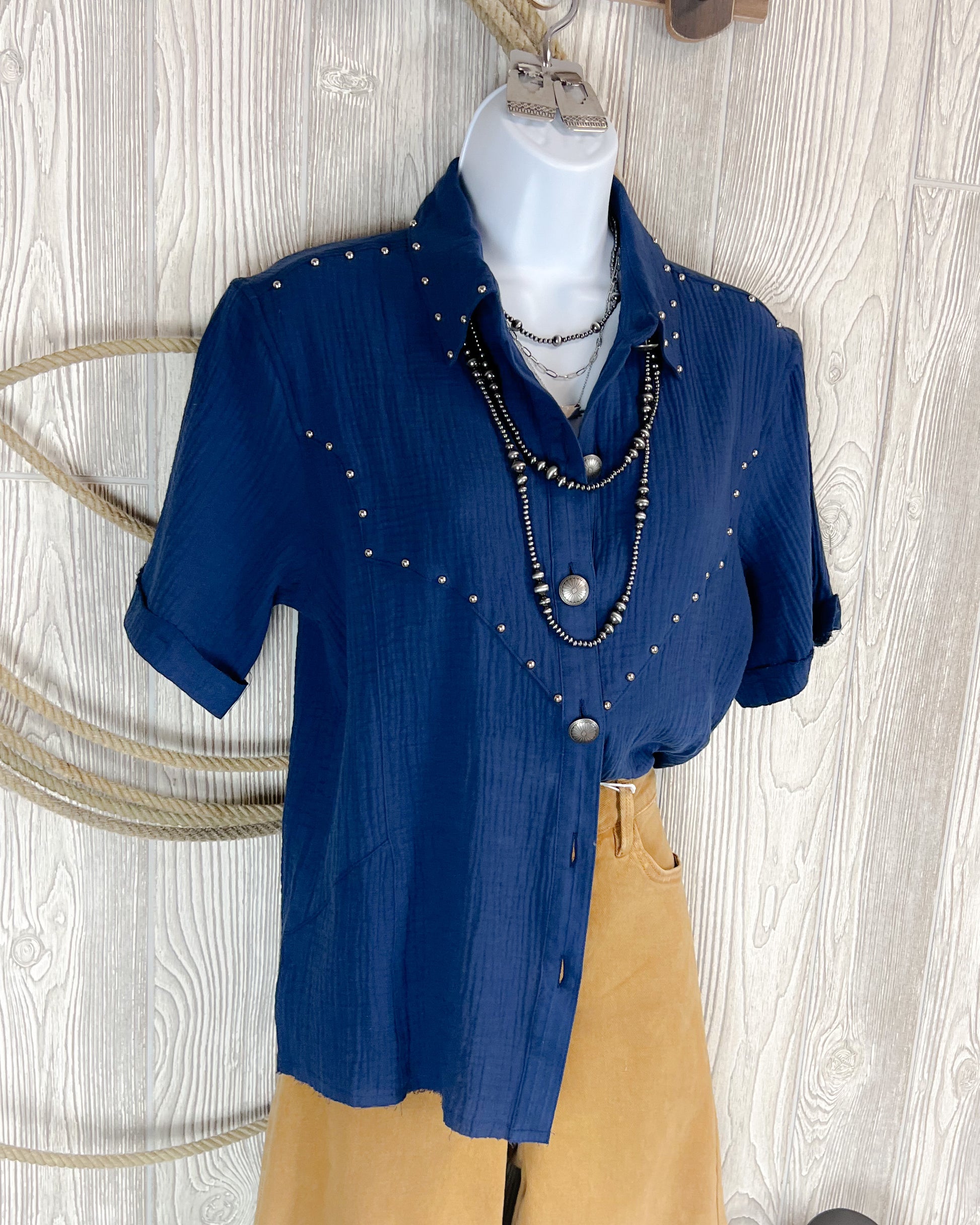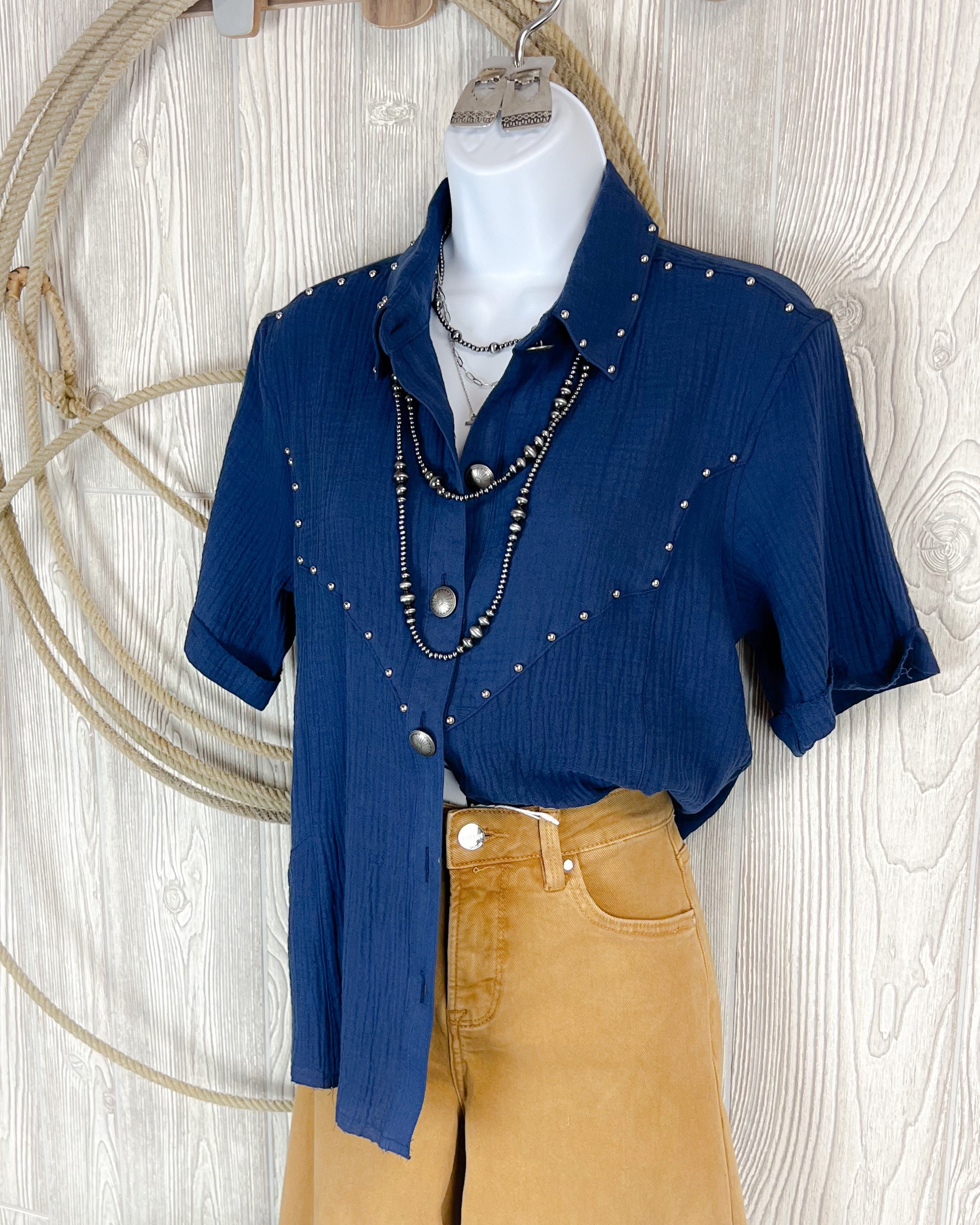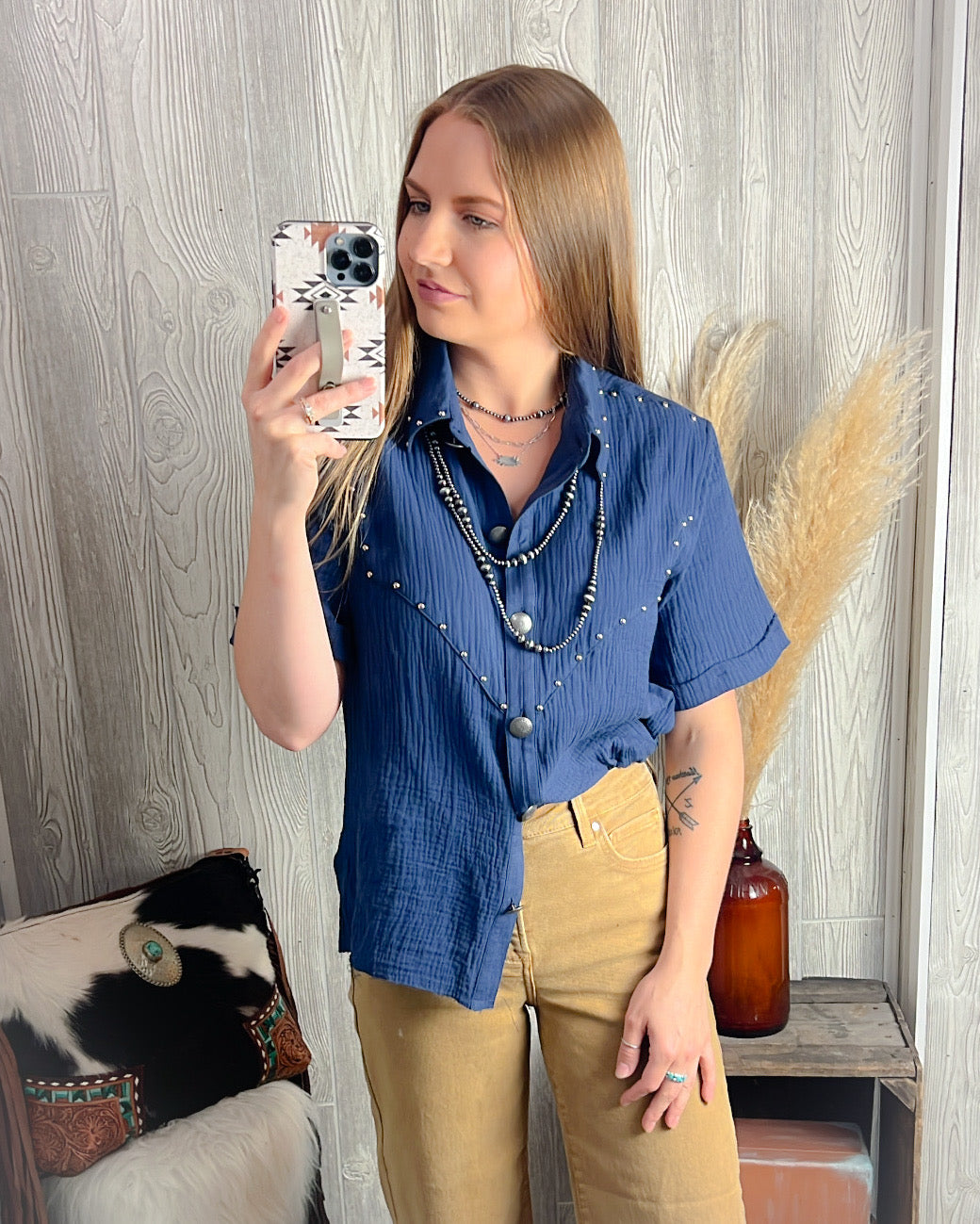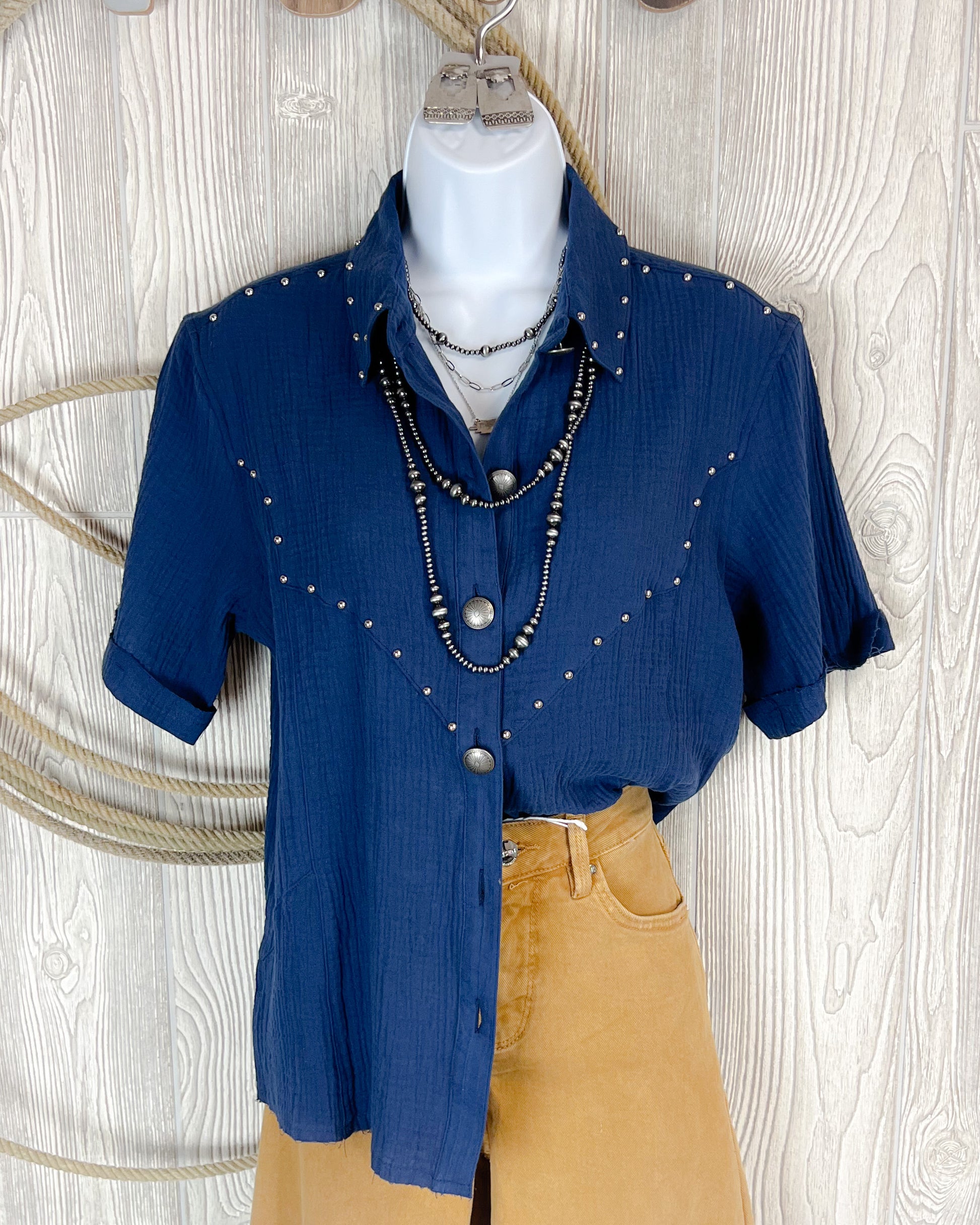 Bring the bold spirit of the wild west into your everyday look with the Midnight Rodeo Studded Button Top in a rich navy hue. This western style beauty features antique silver concho-style buttons down the front and stud detailing that adds just the right amount of edge without sacrificing comfort.