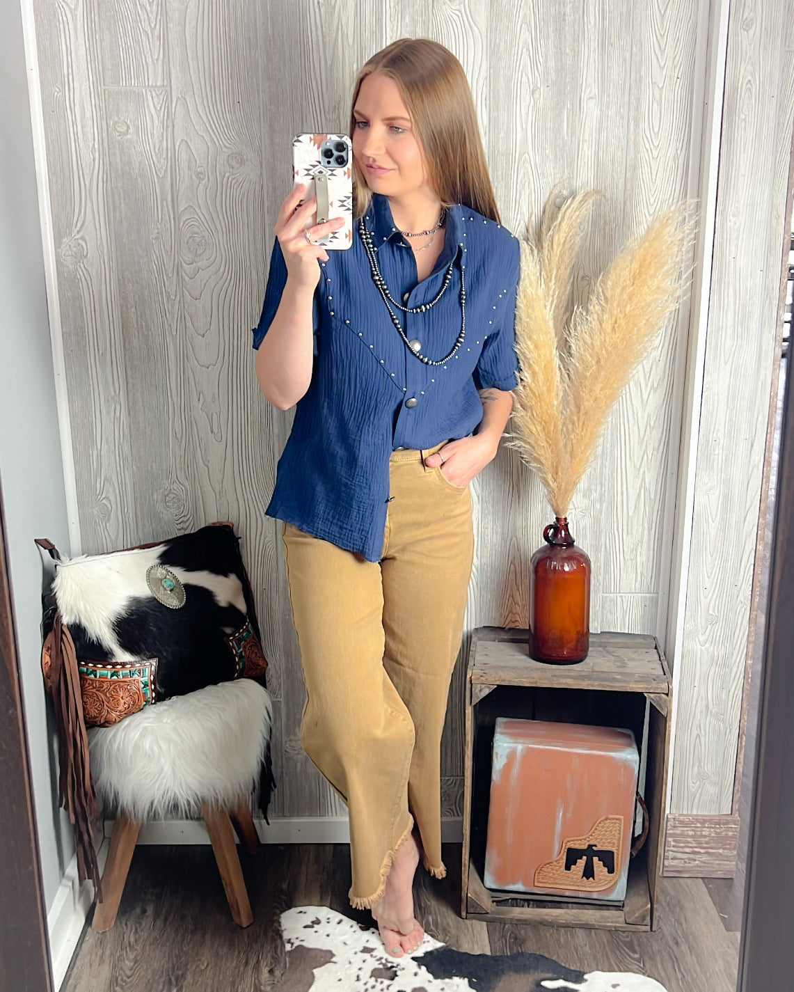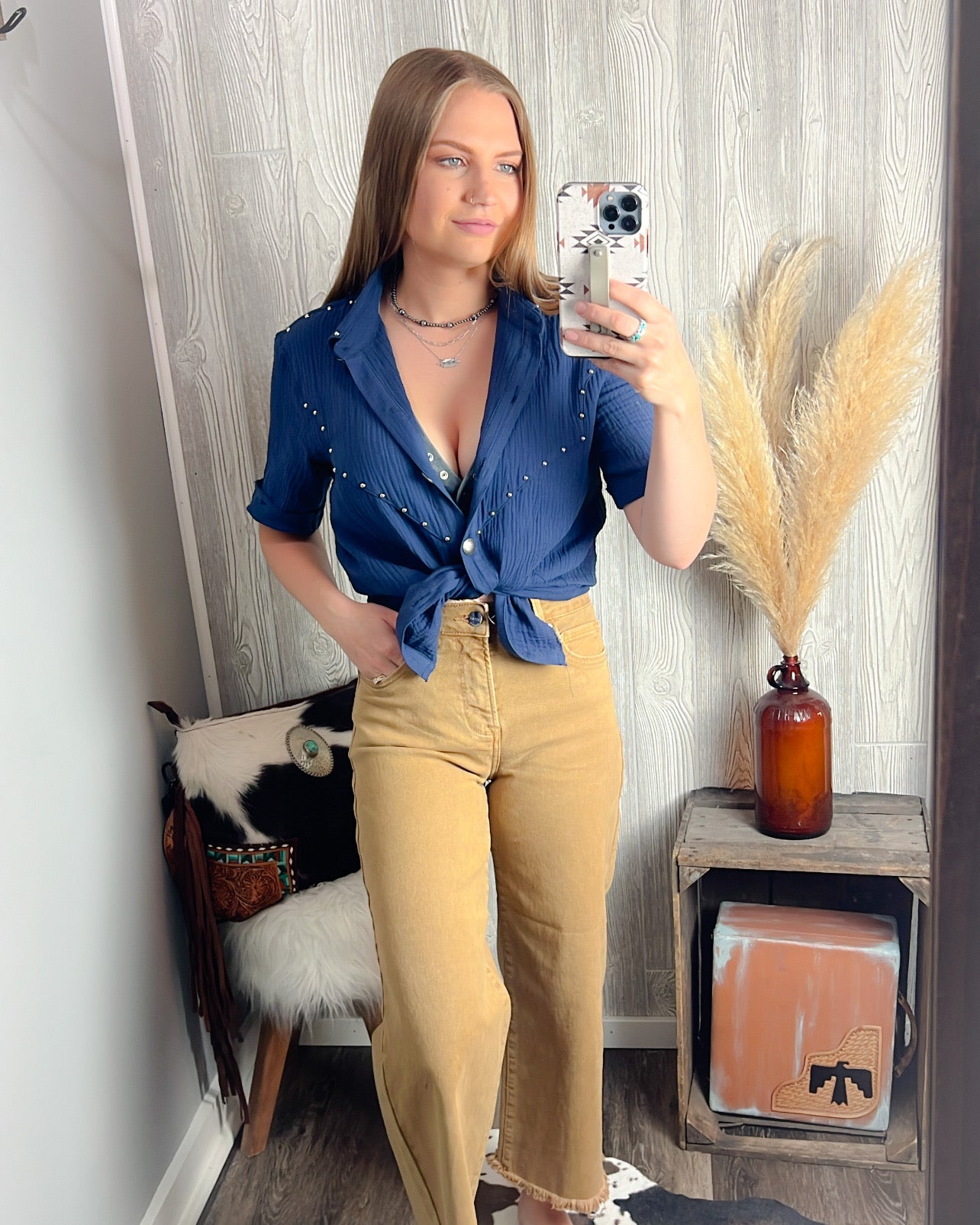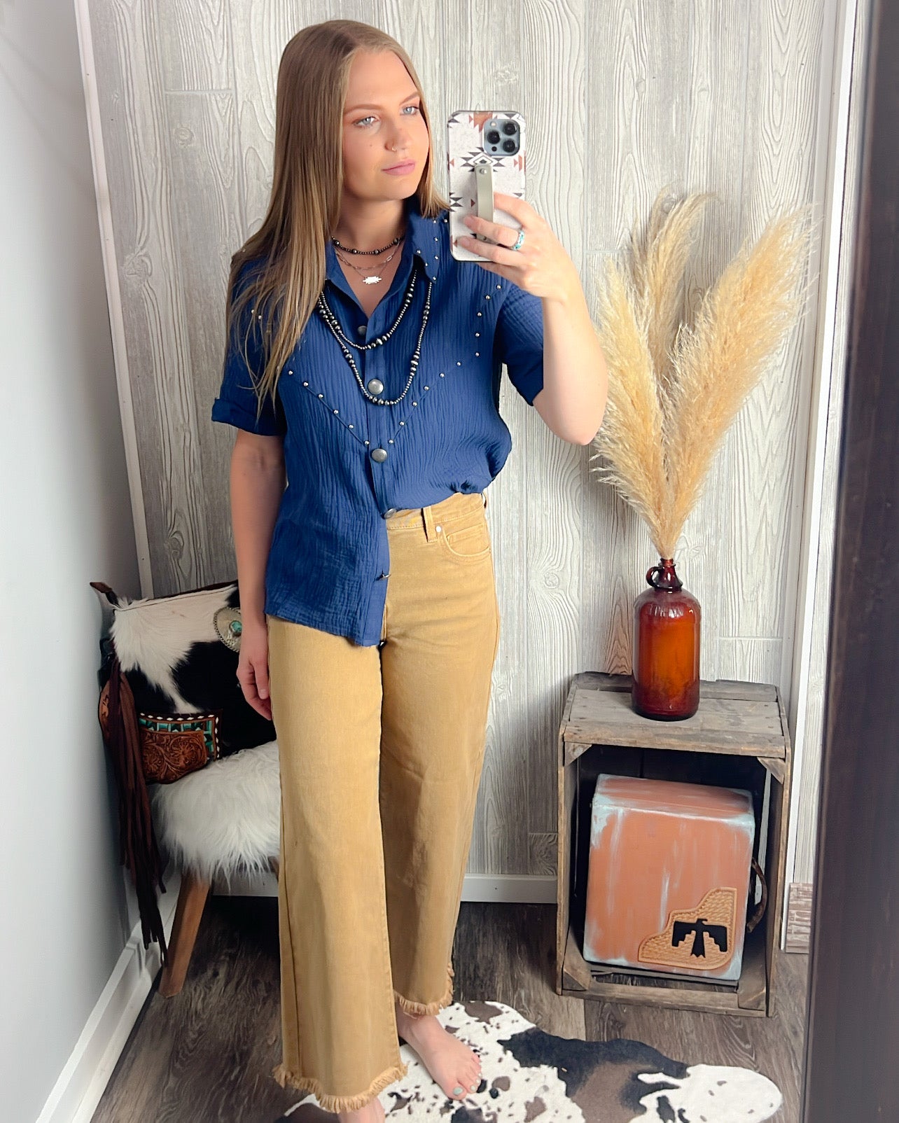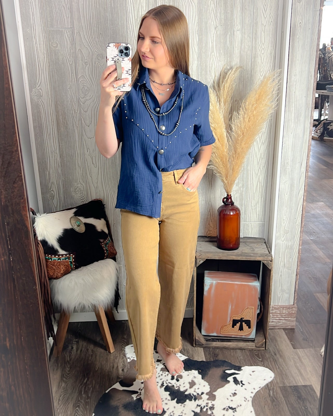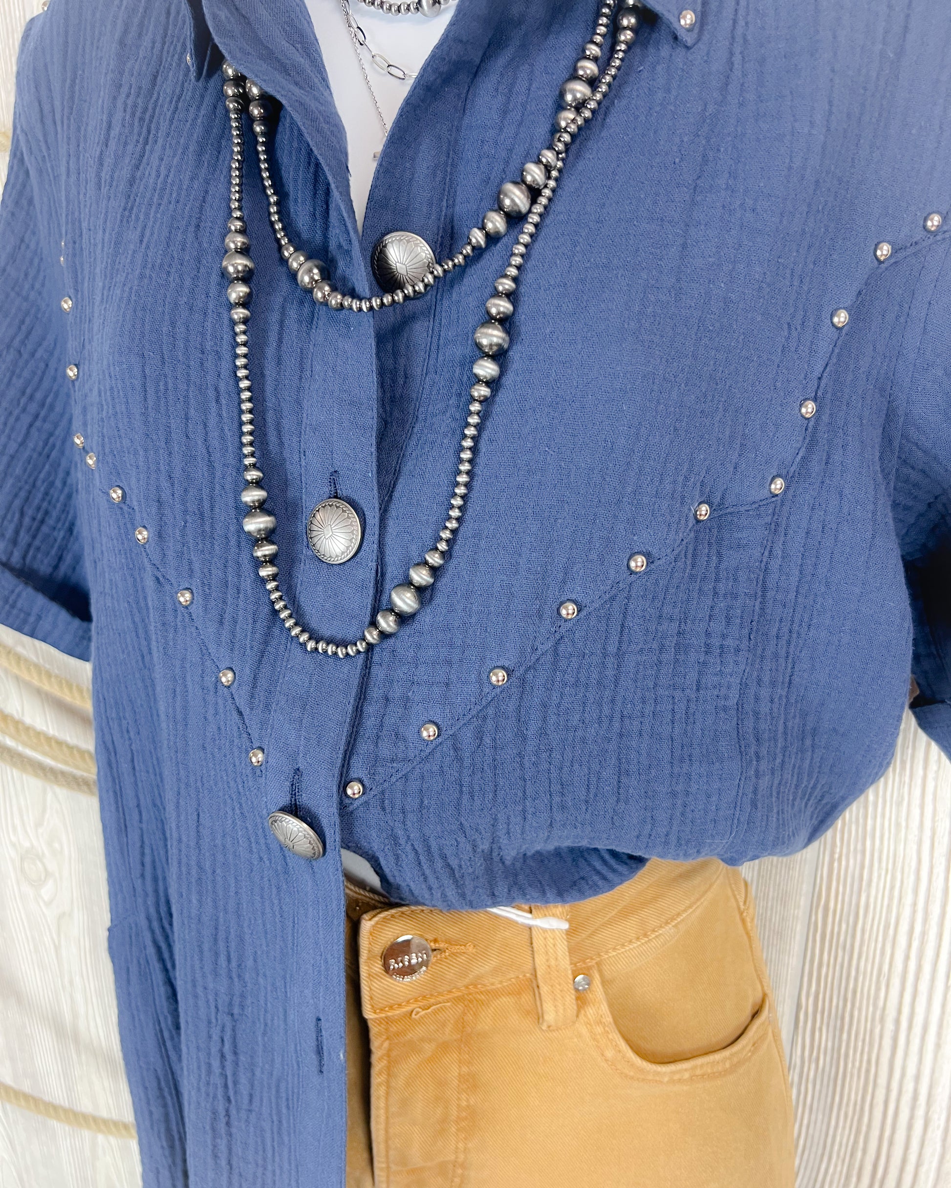 Bring the bold spirit of the wild west into your everyday look with the Midnight Rodeo Studded Button Top in a rich navy hue. This western style beauty features antique silver concho-style buttons down the front and stud detailing that adds just the right amount of edge without sacrificing comfort.