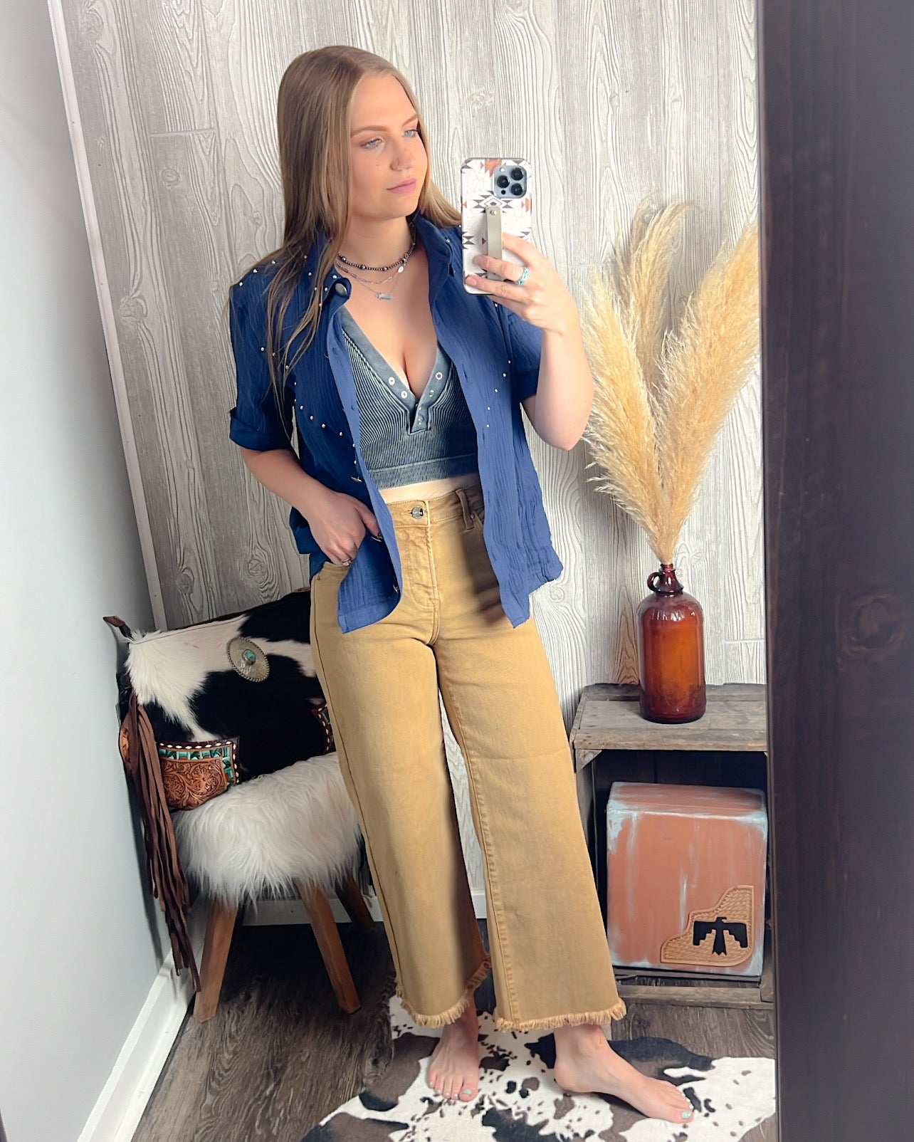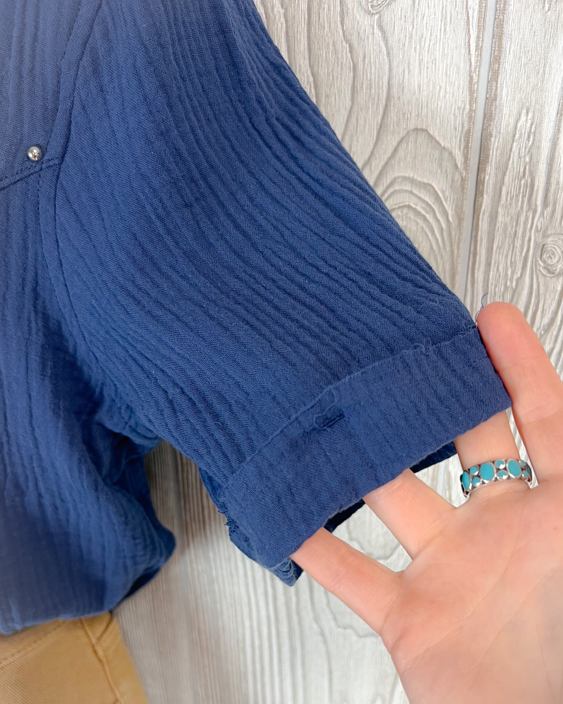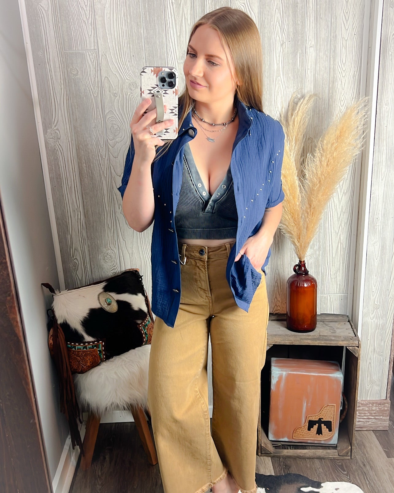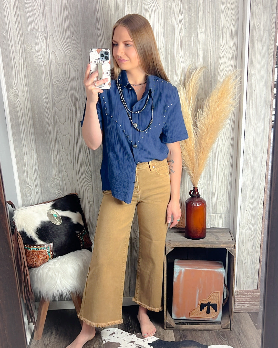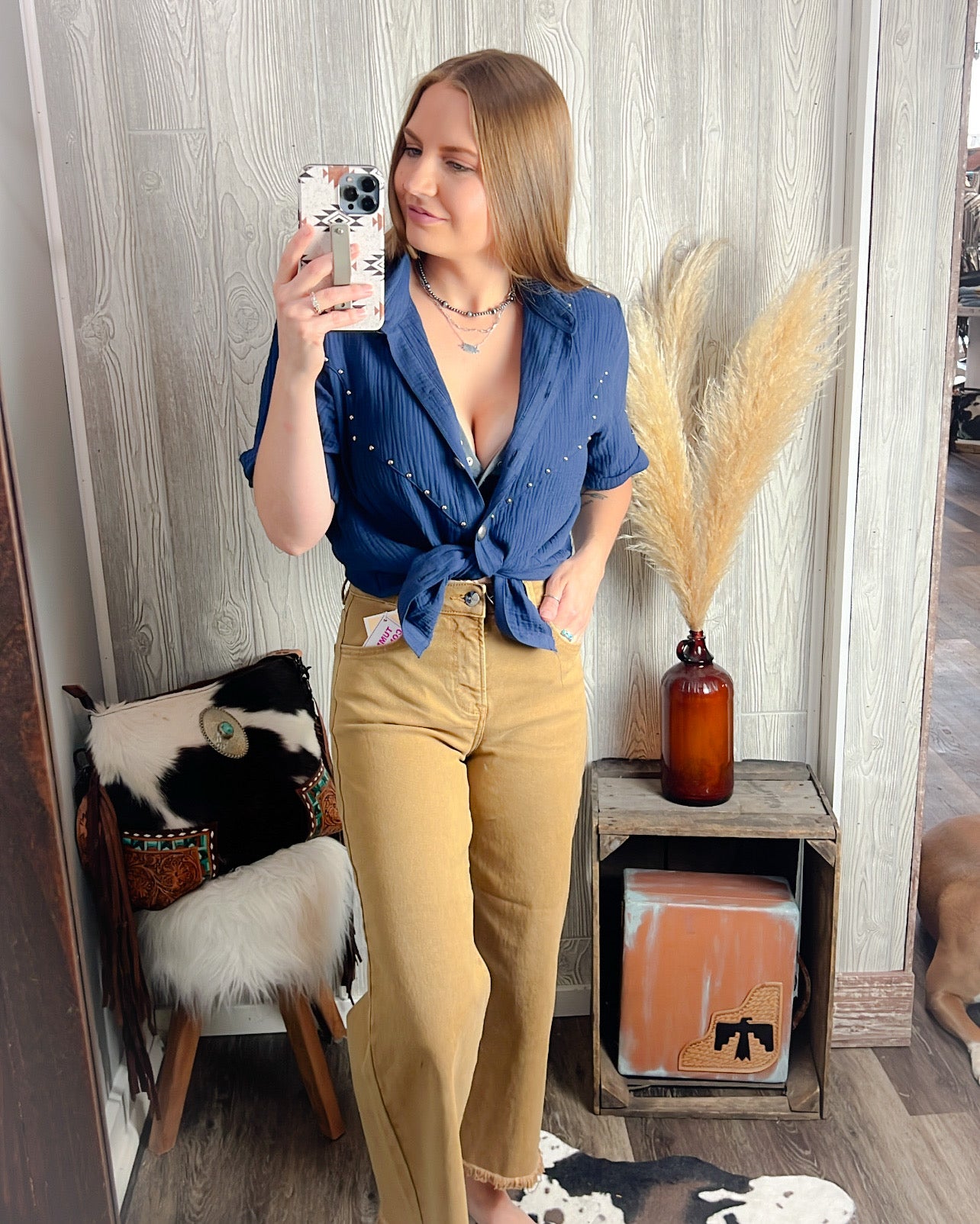 Bring the bold spirit of the wild west into your everyday look with the Midnight Rodeo Studded Button Top in a rich navy hue. This western style beauty features antique silver concho-style buttons down the front and stud detailing that adds just the right amount of edge without sacrificing comfort.