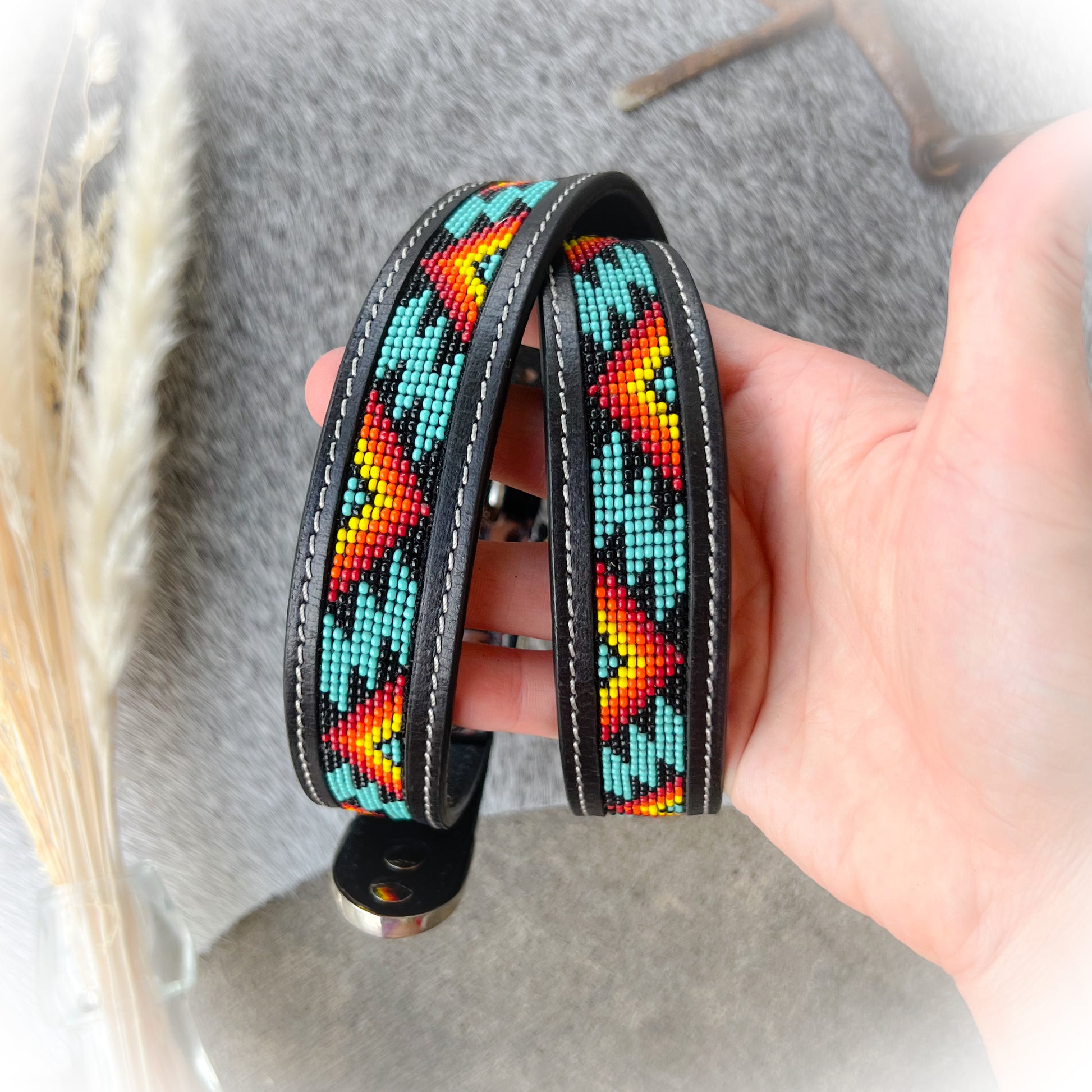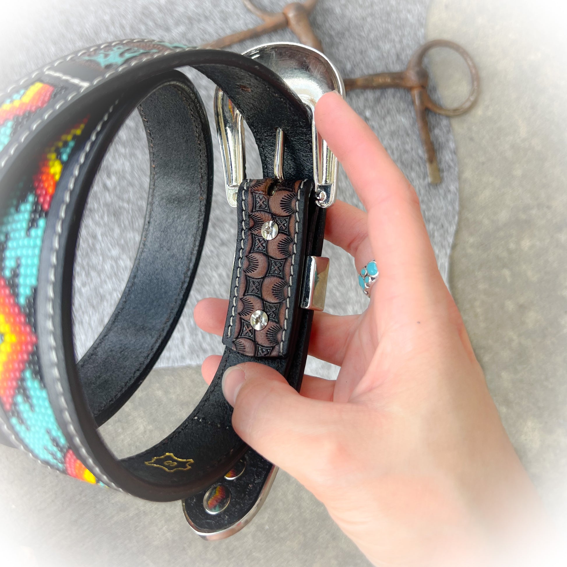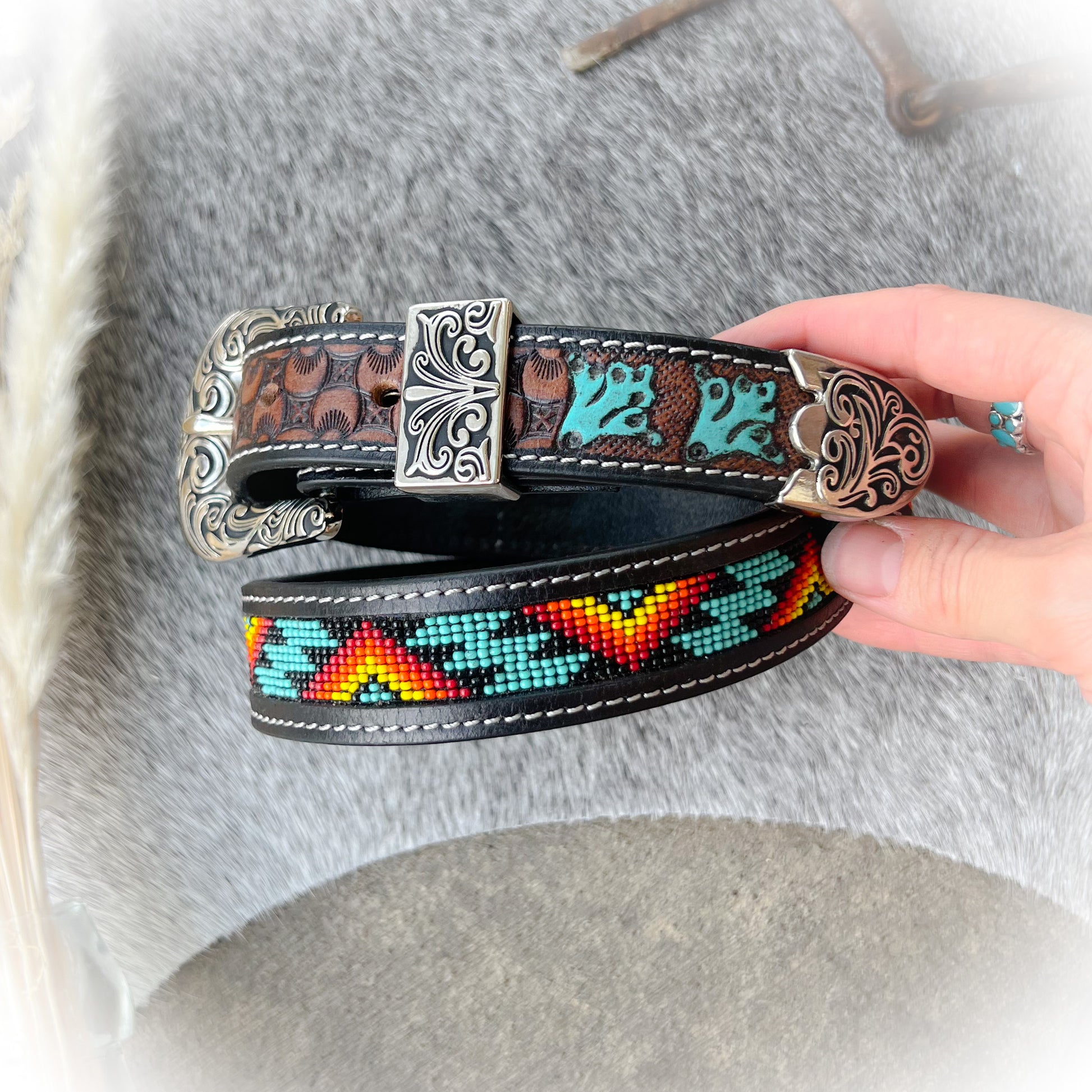 Genuine tooled leather with detailed floral designs and colorful beads