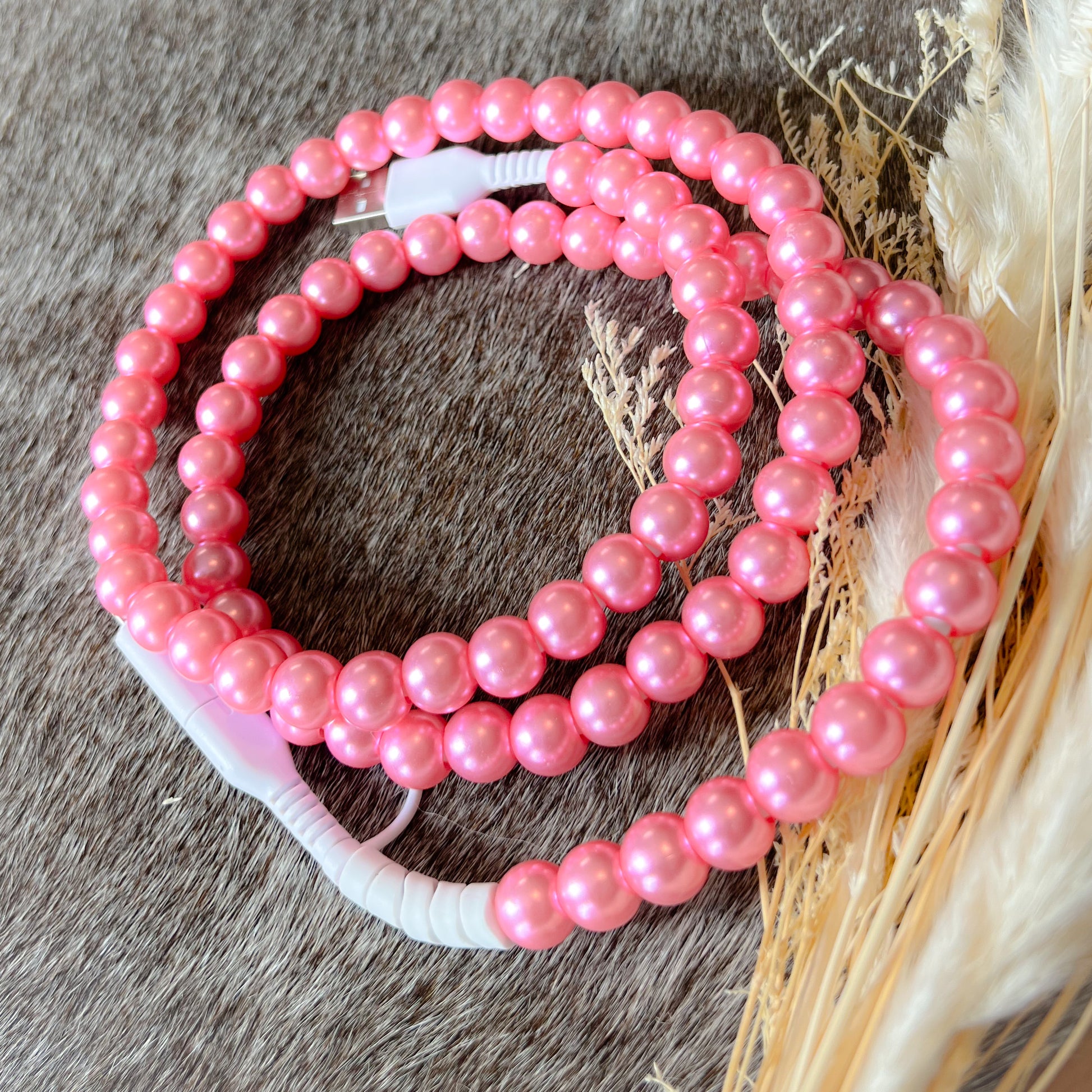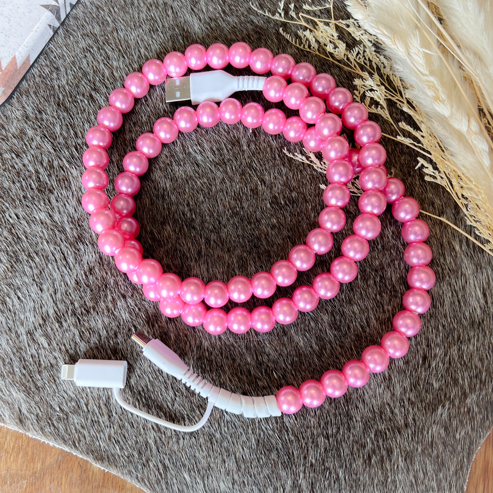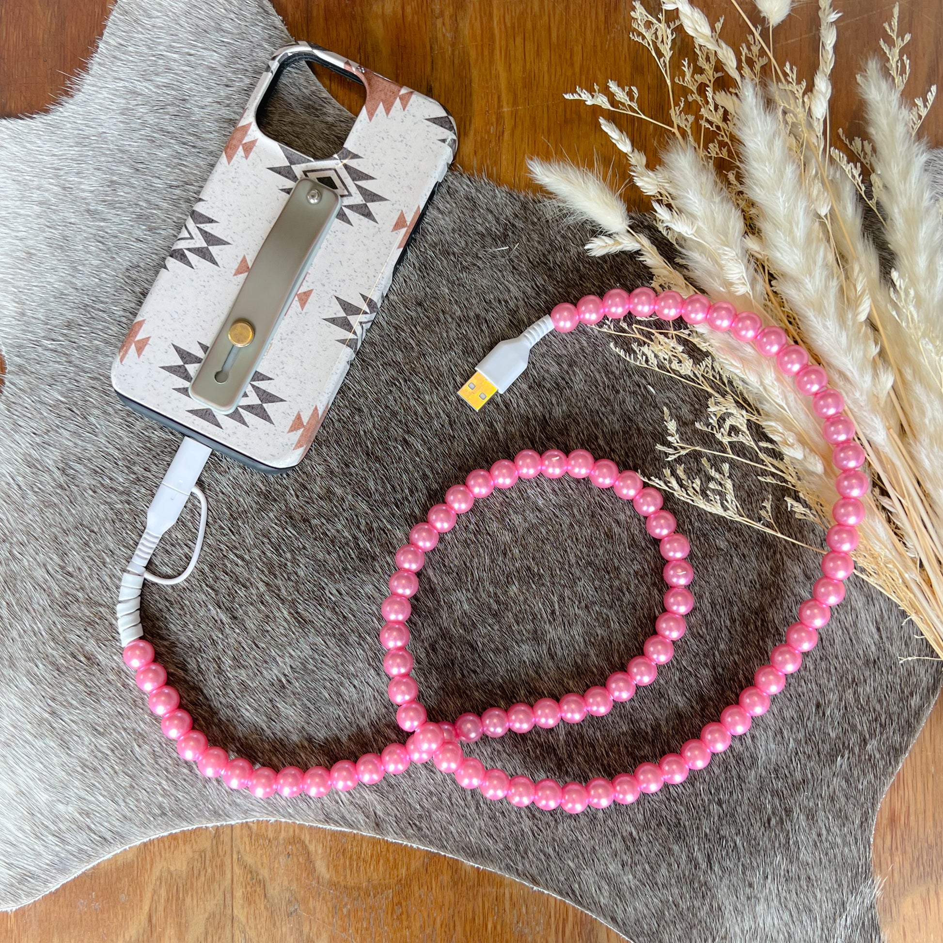 Charge in style with this Western glam twist on a tech essential! This 3-foot long pink pearl beaded charger is the perfect mix of function and fashion. Designed to look like a statement accessory.