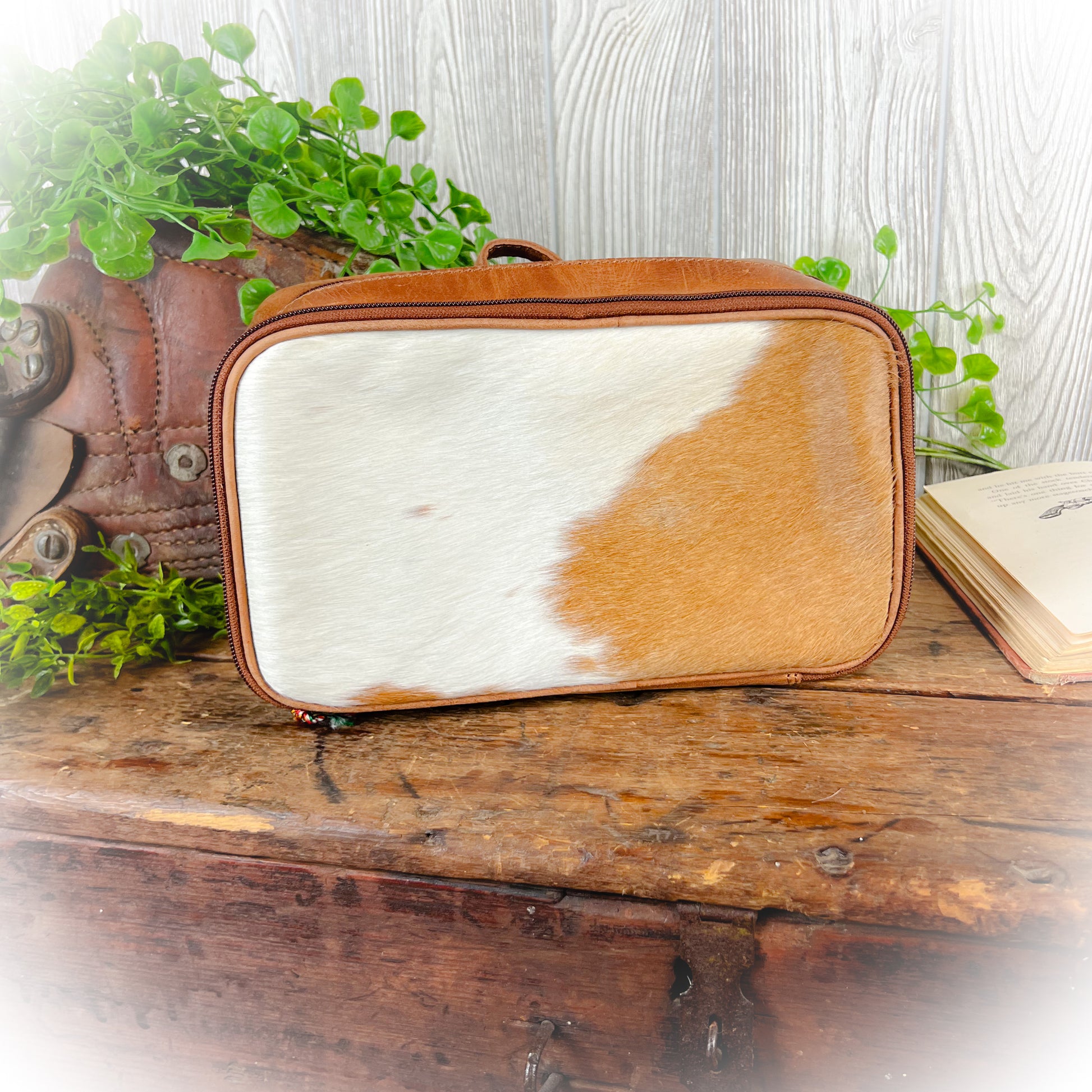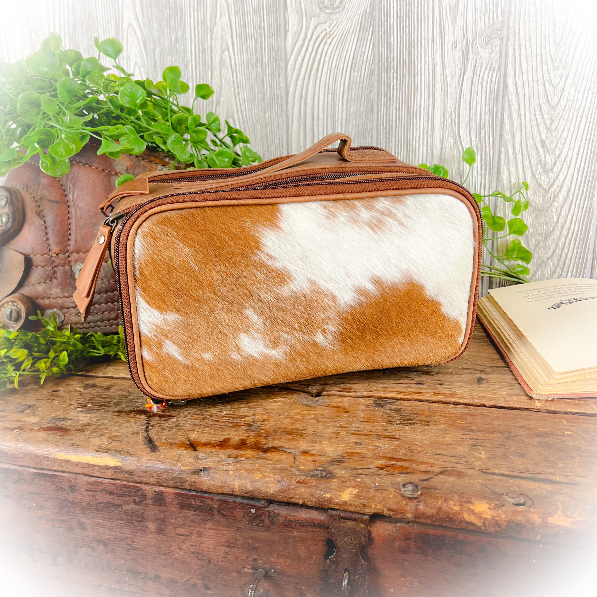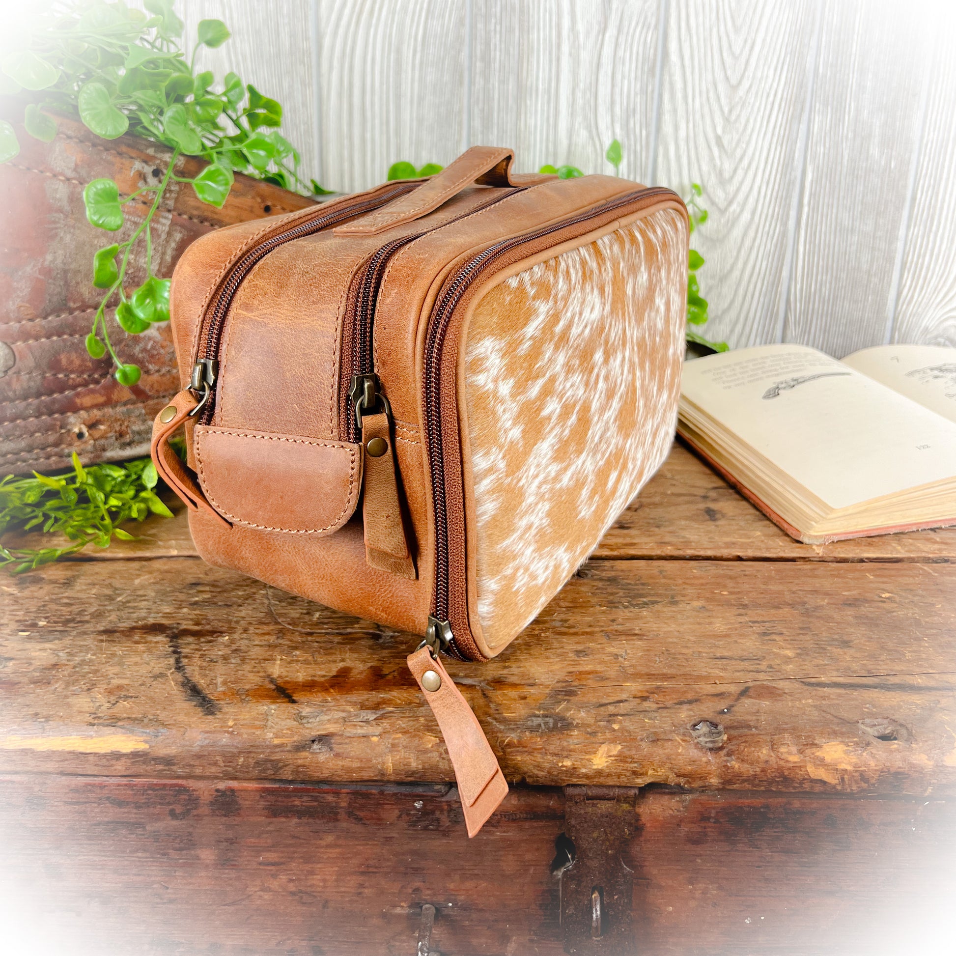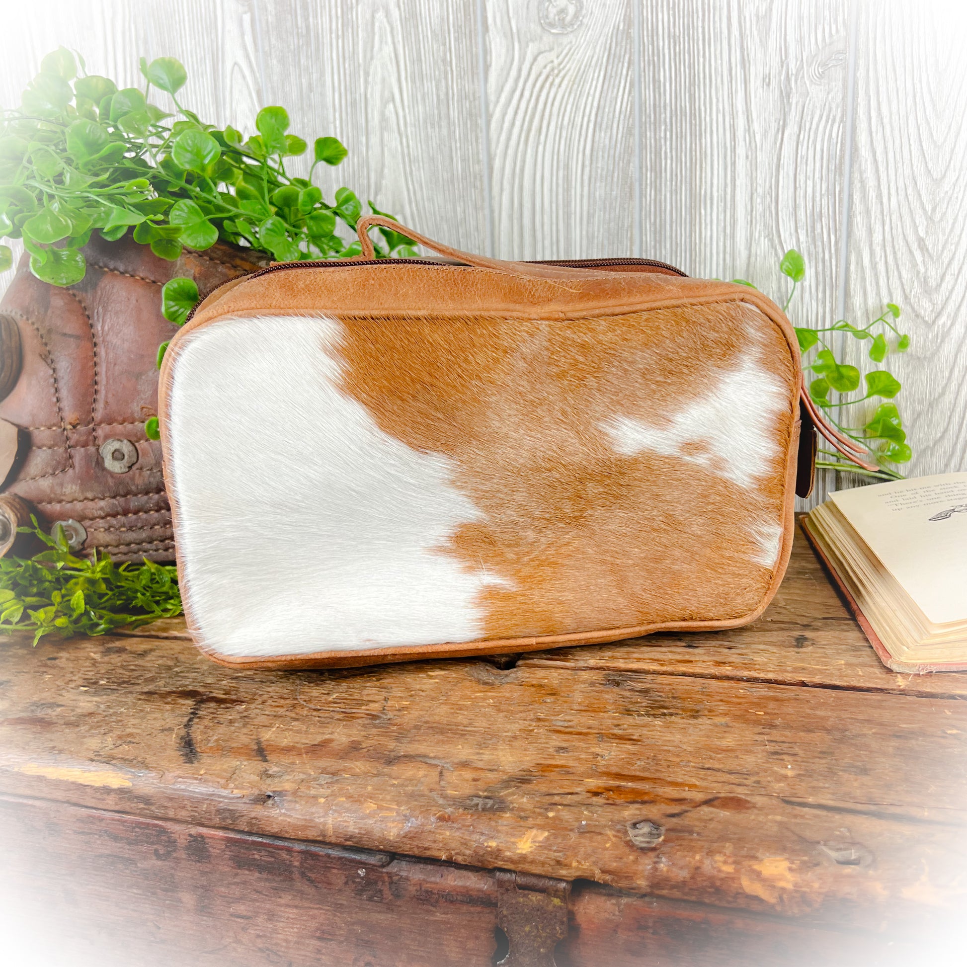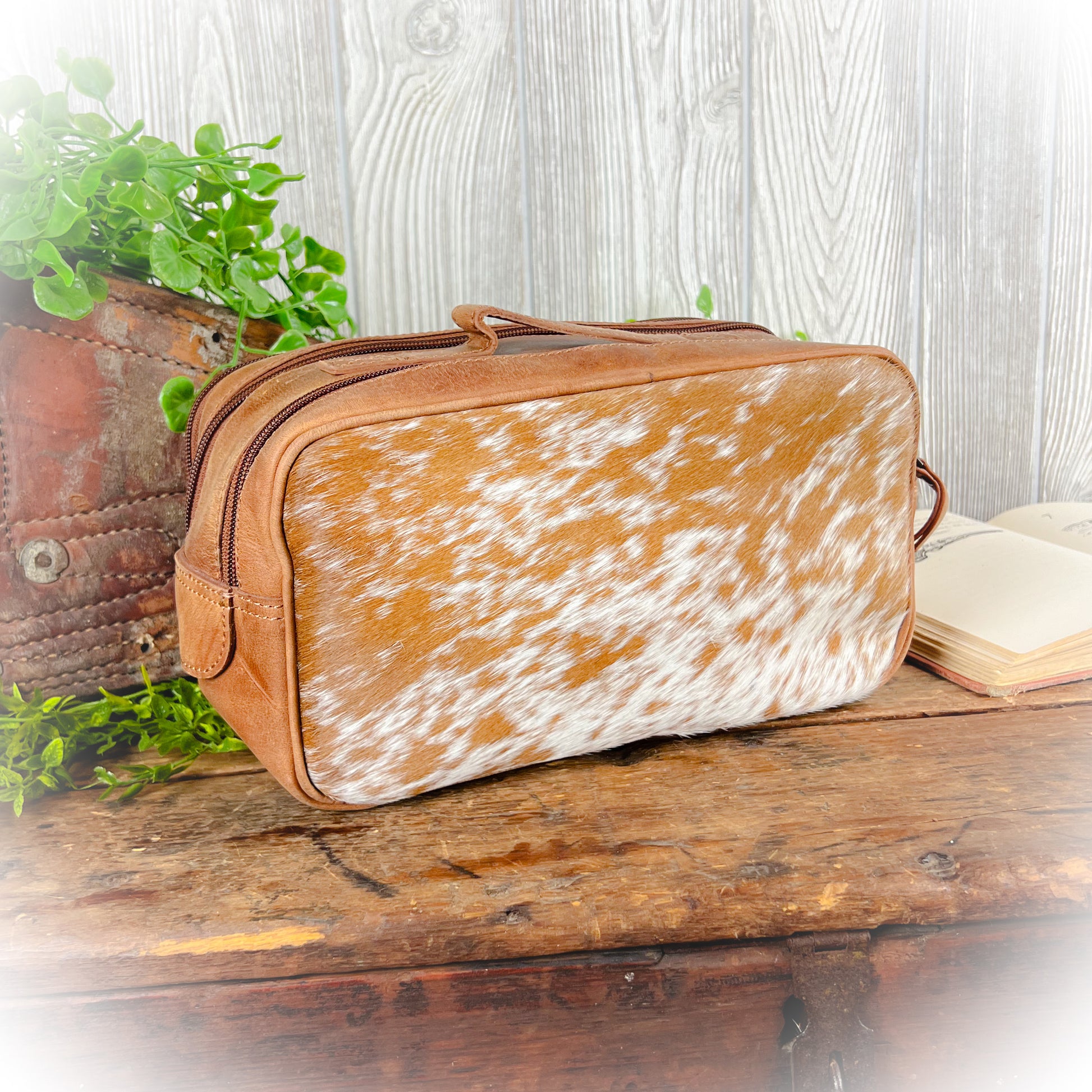 Meet your new travel essential the Ranch Hand Toiletry Bag combines rugged durability with classic western style. Crafted from genuine leather and unique cowhide, each bag features one-of-a-kind patterns that make it truly your own.
