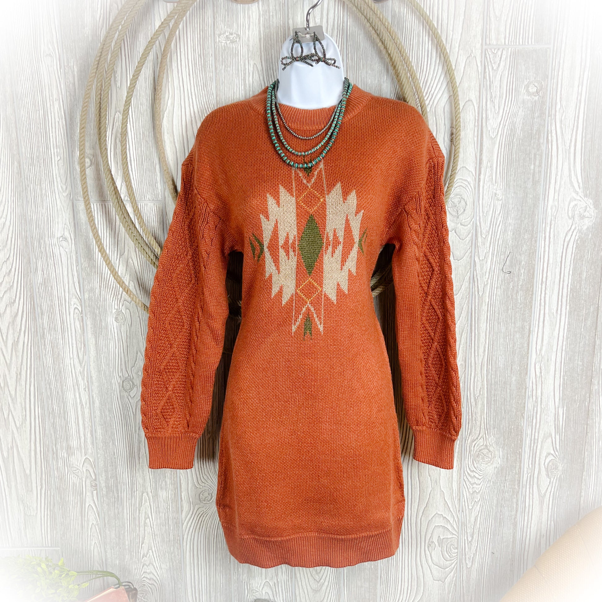 western sweater dress, Aztec sweater dress, rust sweater dress, western fall outfit, cowgirl dress outfit, boutique sweater dress, Aztec rust dress, western winter fashion, TikTok western dress, cozy western dress