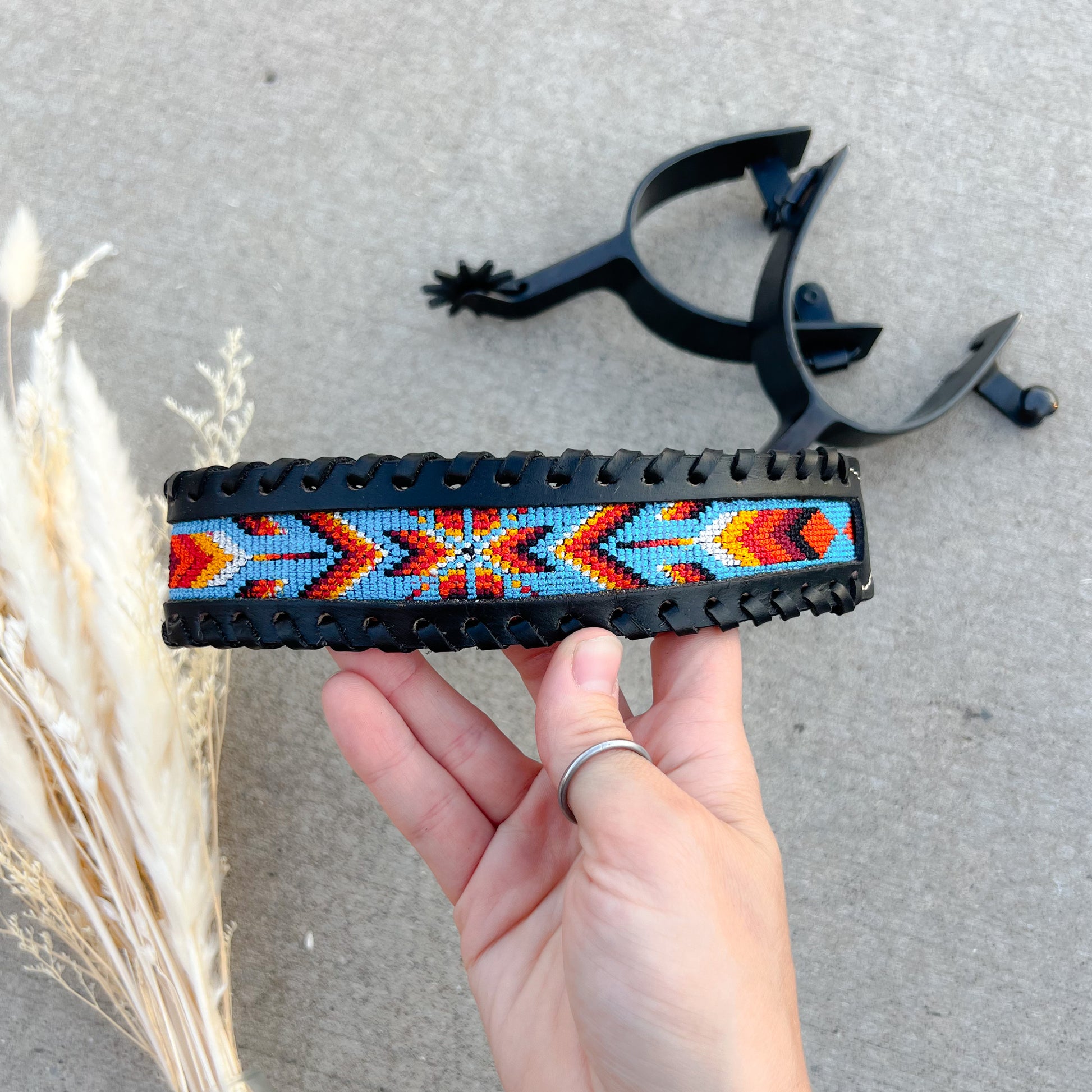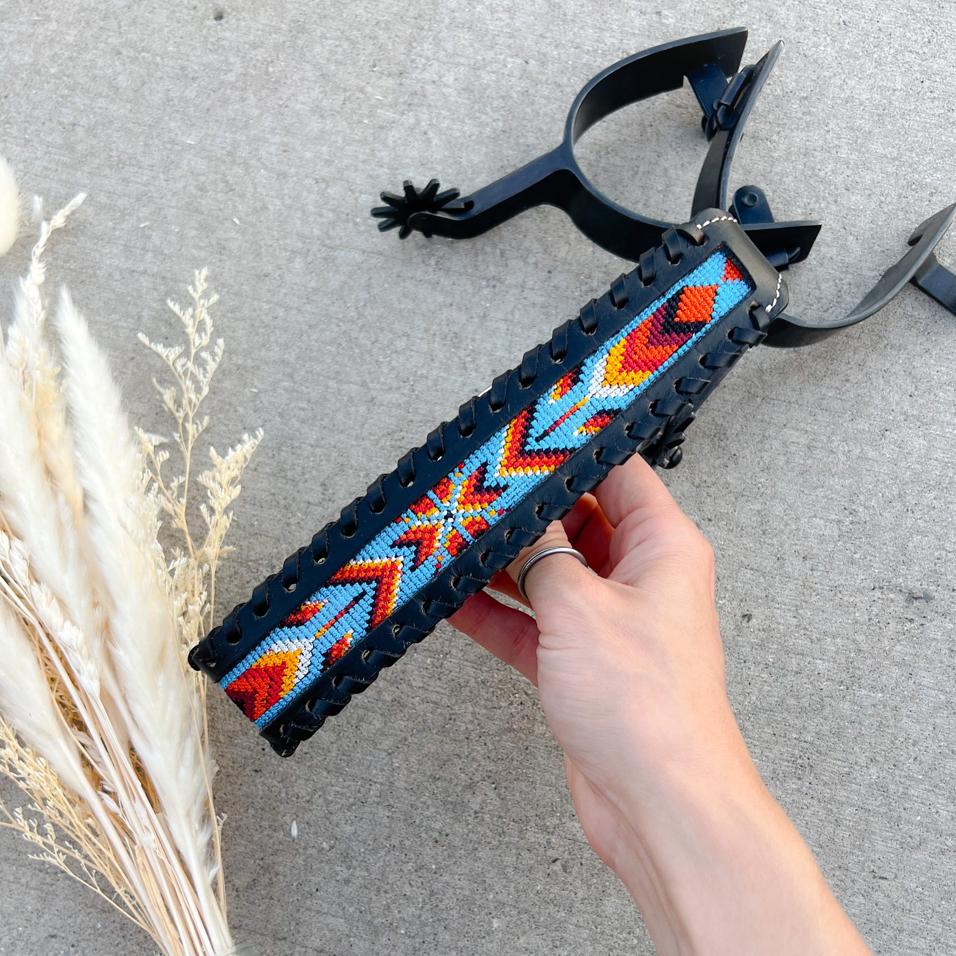 Genuine black leather with hand-beaded western pattern