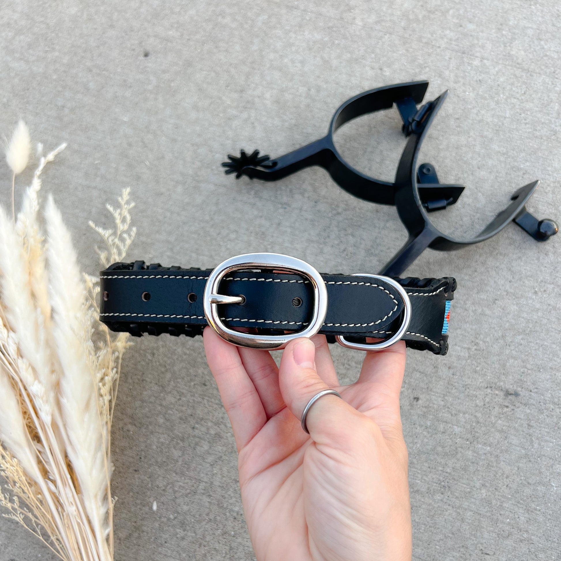 Built for everyday wear, it includes durable metal hardware, a comfortable fit, and wide 1.5" leather construction for a secure hold. Available in Small, Medium, and Large, each collar is made to handle your pup’s adventures while adding a bit of cowboy flair to every walk.