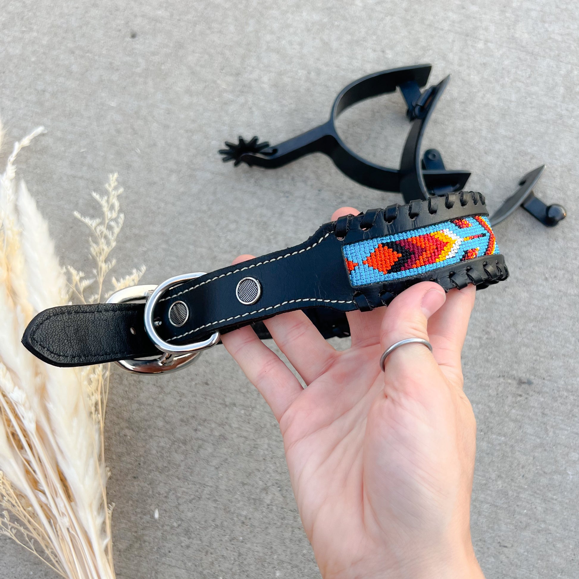 Treat your pup to top-tier western style with this Western Beaded & Black Leather Dog Collar a crafted blend of rugged durability and detailed design. Featuring a bold, colorful beaded pattern stitched into smooth black leather, this collar is as sturdy as it is stylish.
