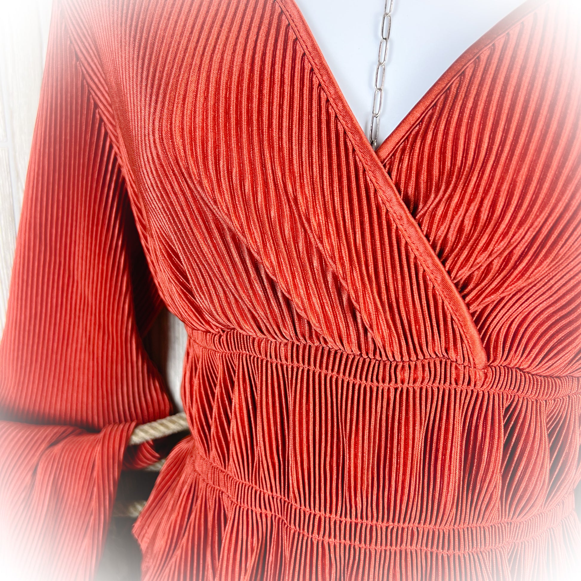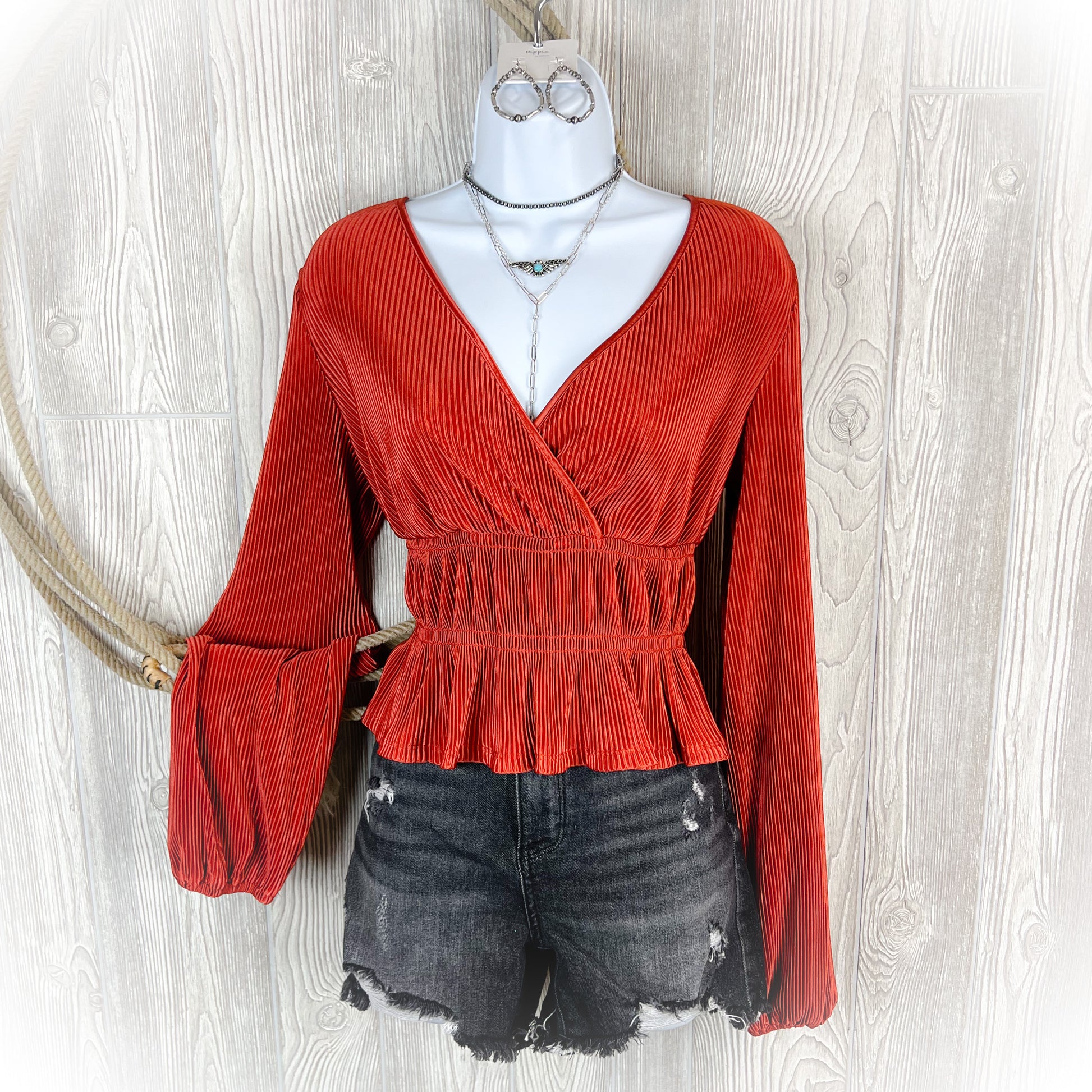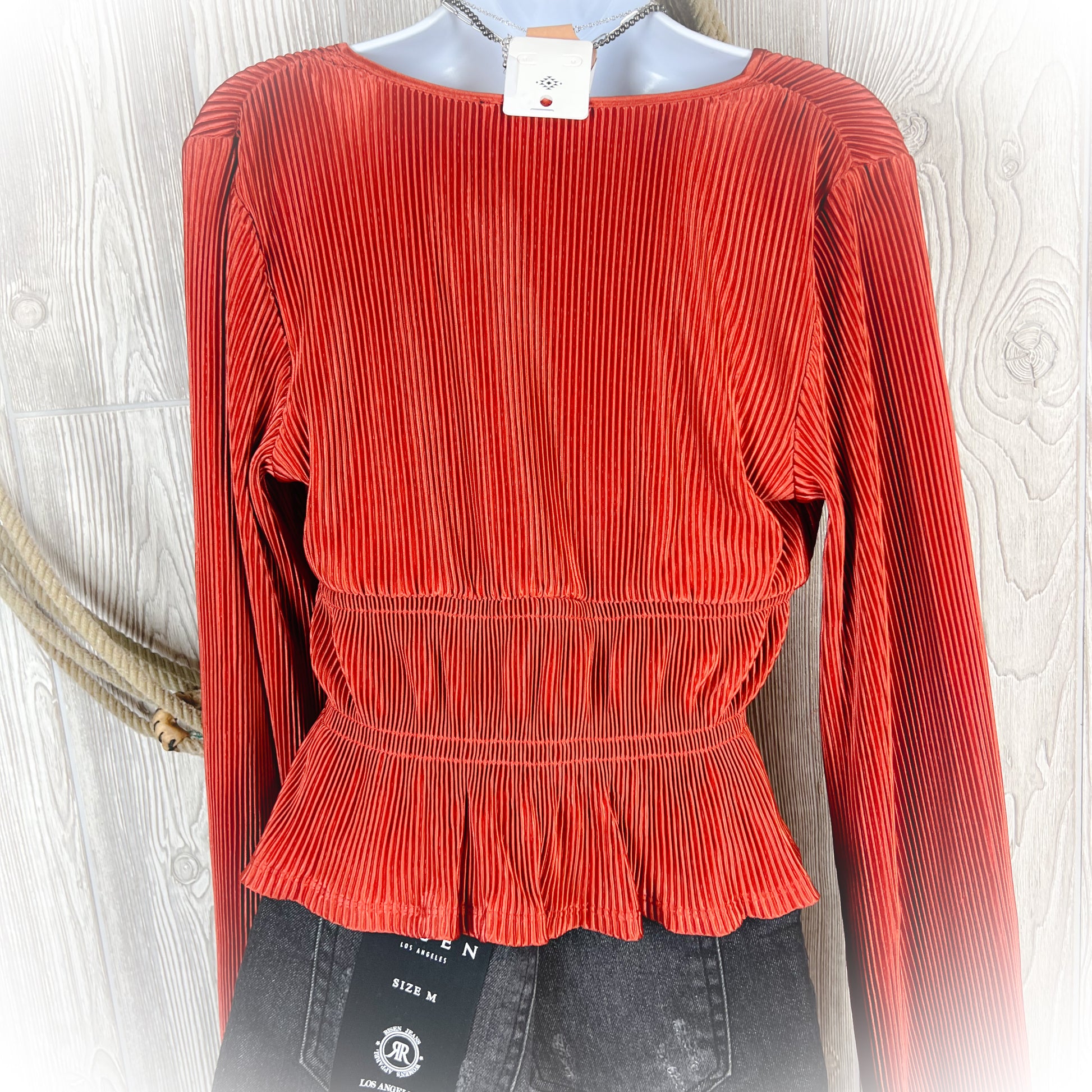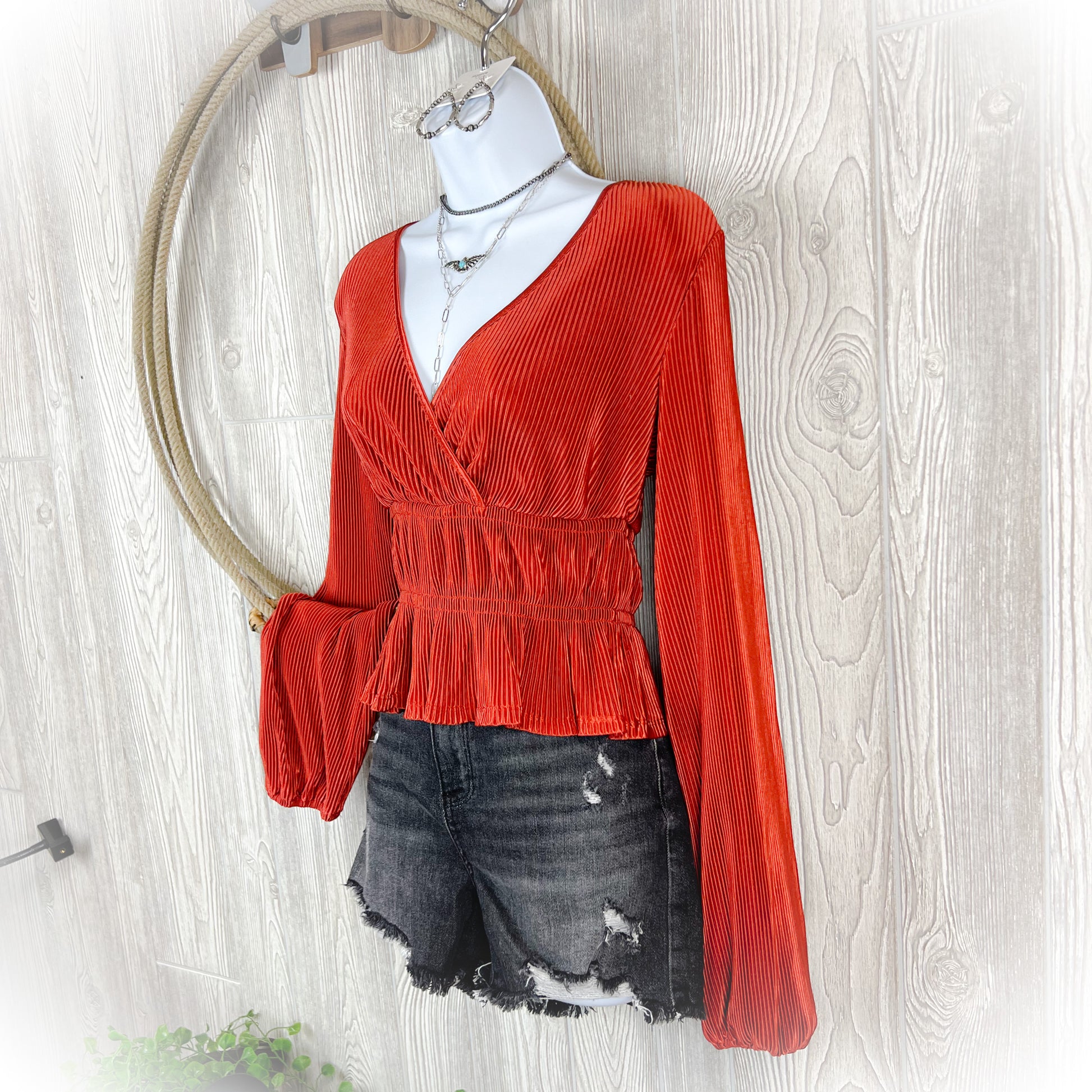 Bring autumn vibes to your wardrobe with the Rusty Fall Western V-Neck Blouse, a perfect mix of comfort, stretch, and western charm. Crafted from 100% polyester, this gorgeous rusty orange top features a flattering v-neckline, soft stretchy fabric for all-day wear, and playful scrunched ruffles along the bottom for a touch of feminine flair. Ideal for pairing with denim, boots, and turquoise accessories, it’s your new go-to for fall rodeos, pumpkin patch trips, and casual western nights out.