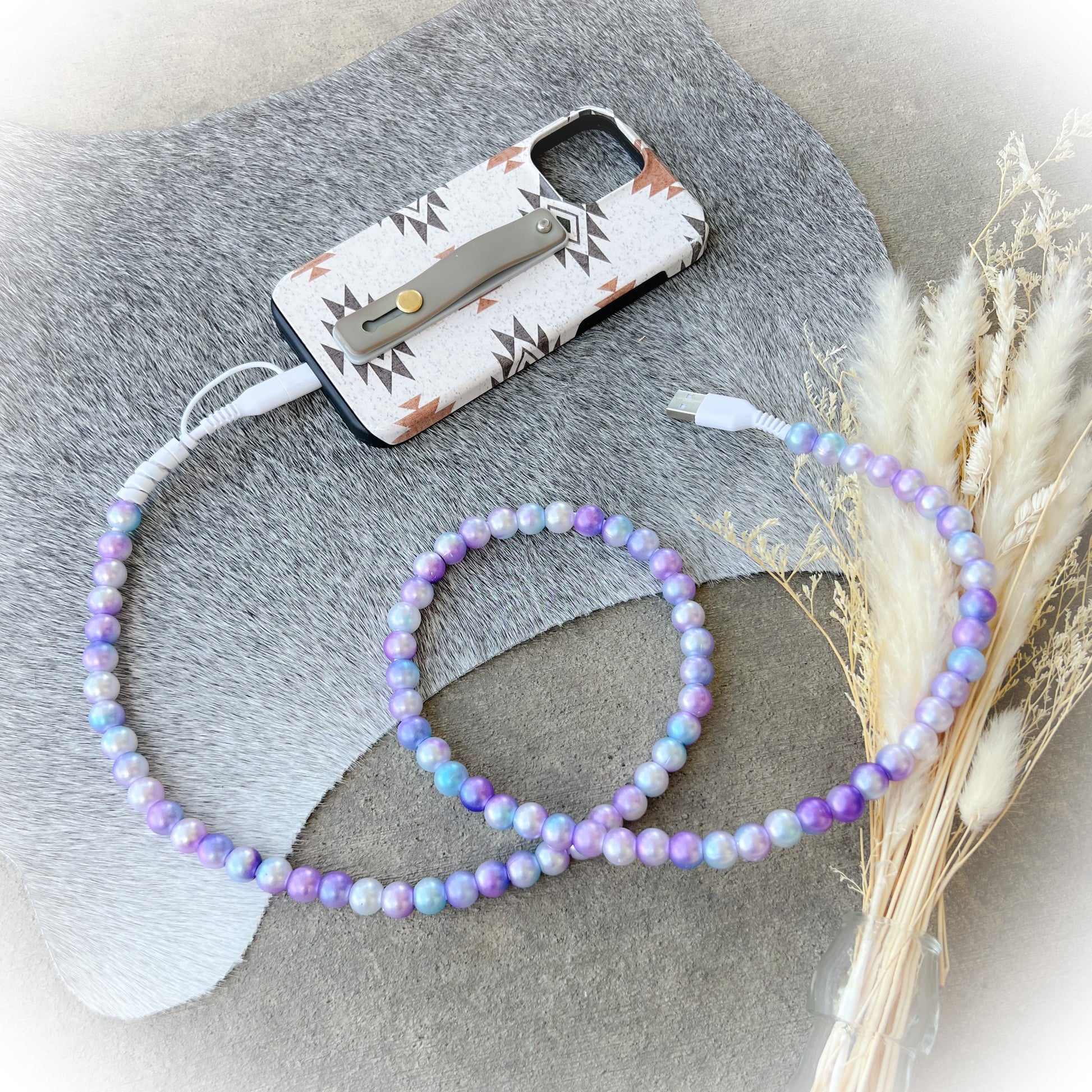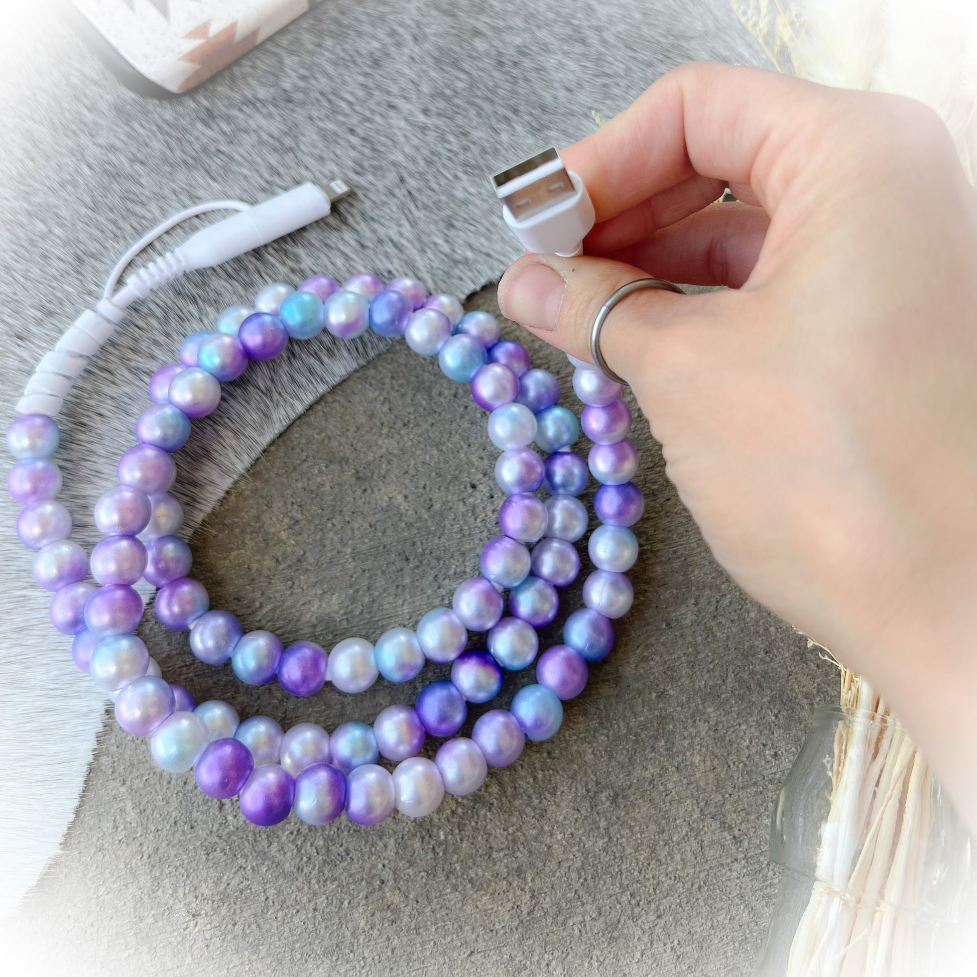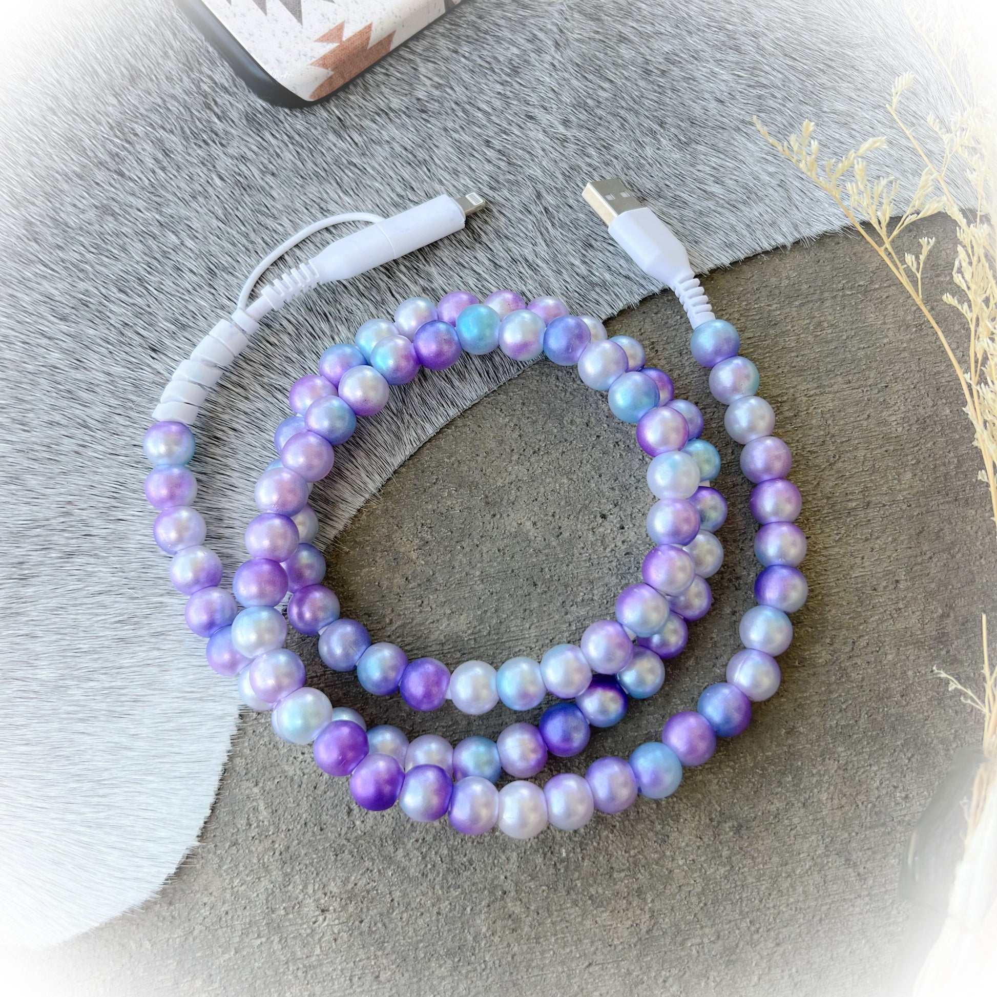 Charge in style with this Western glam twist on a tech essential! This 3-foot long Purple-Blue pearl beaded charger is the perfect mix of function and fashion. Designed to look like a statement accessory.