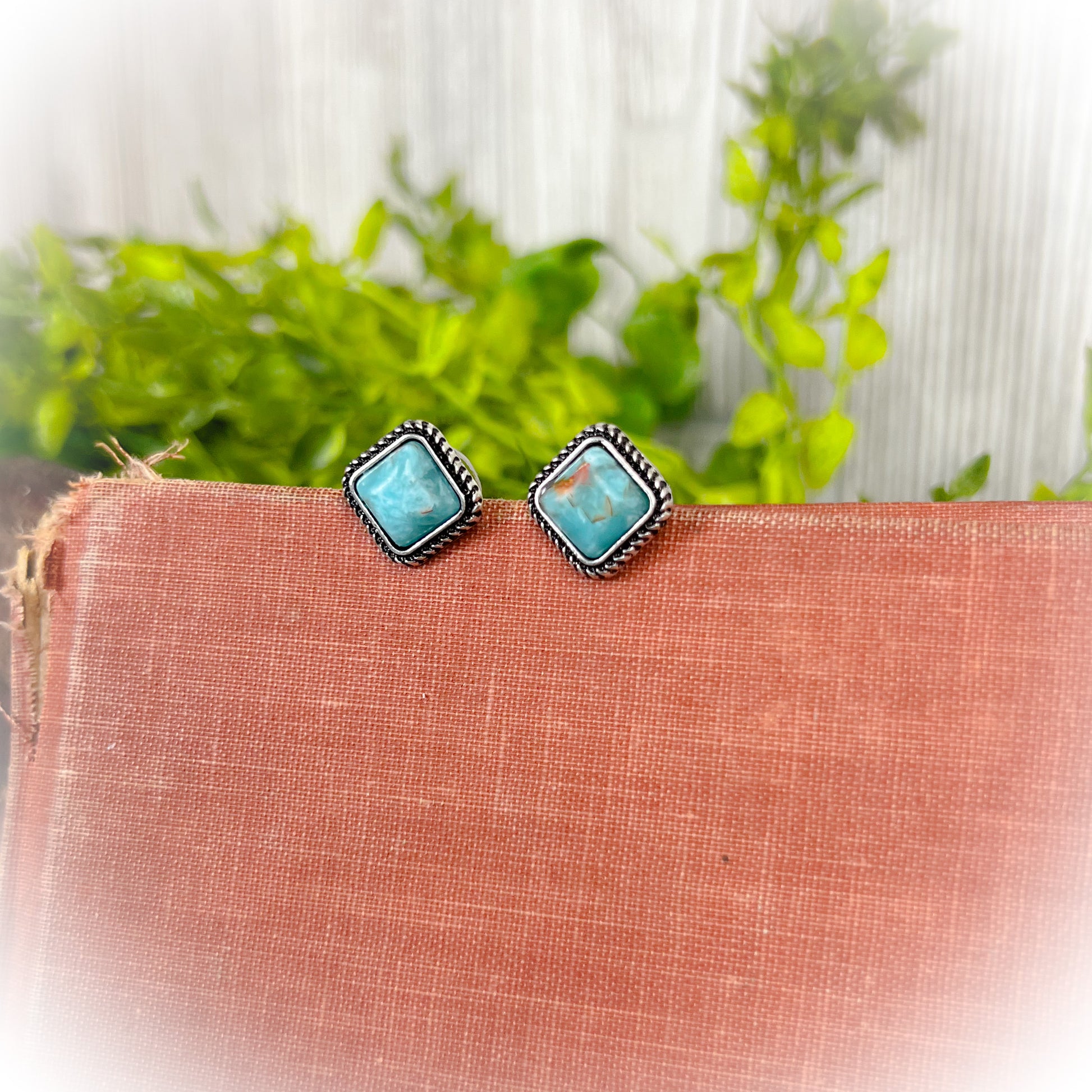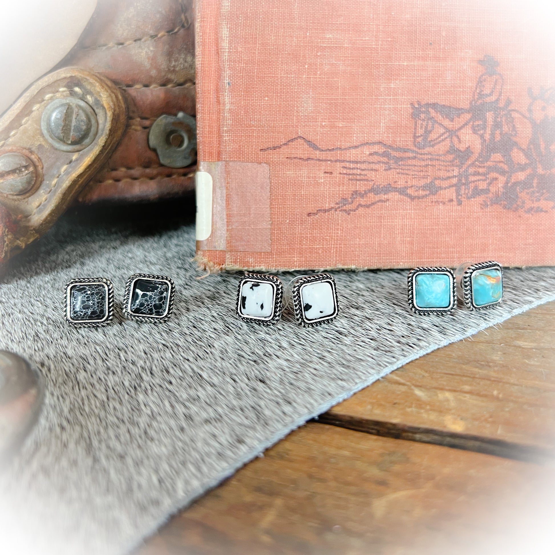 These classic square stone studs feature a subtle western design that pairs beautifully with any outfit — from jeans and a graphic tee to a night out at the rodeo.