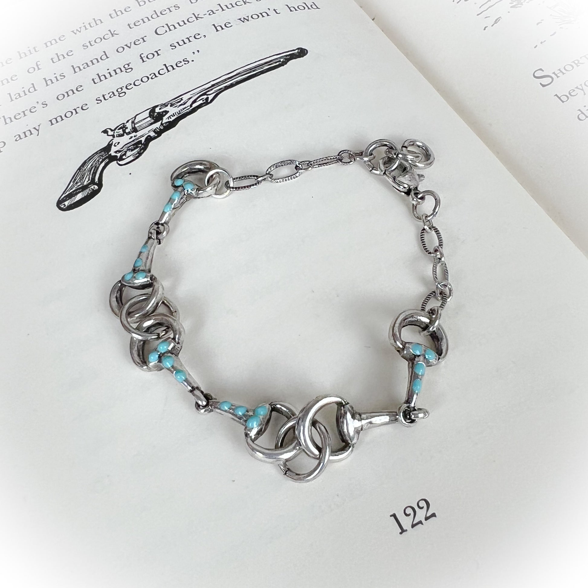 This silver link bracelet features detailed horse bit links accented with beautiful turquoise stones, capturing that authentic cowgirl spirit in every detail.