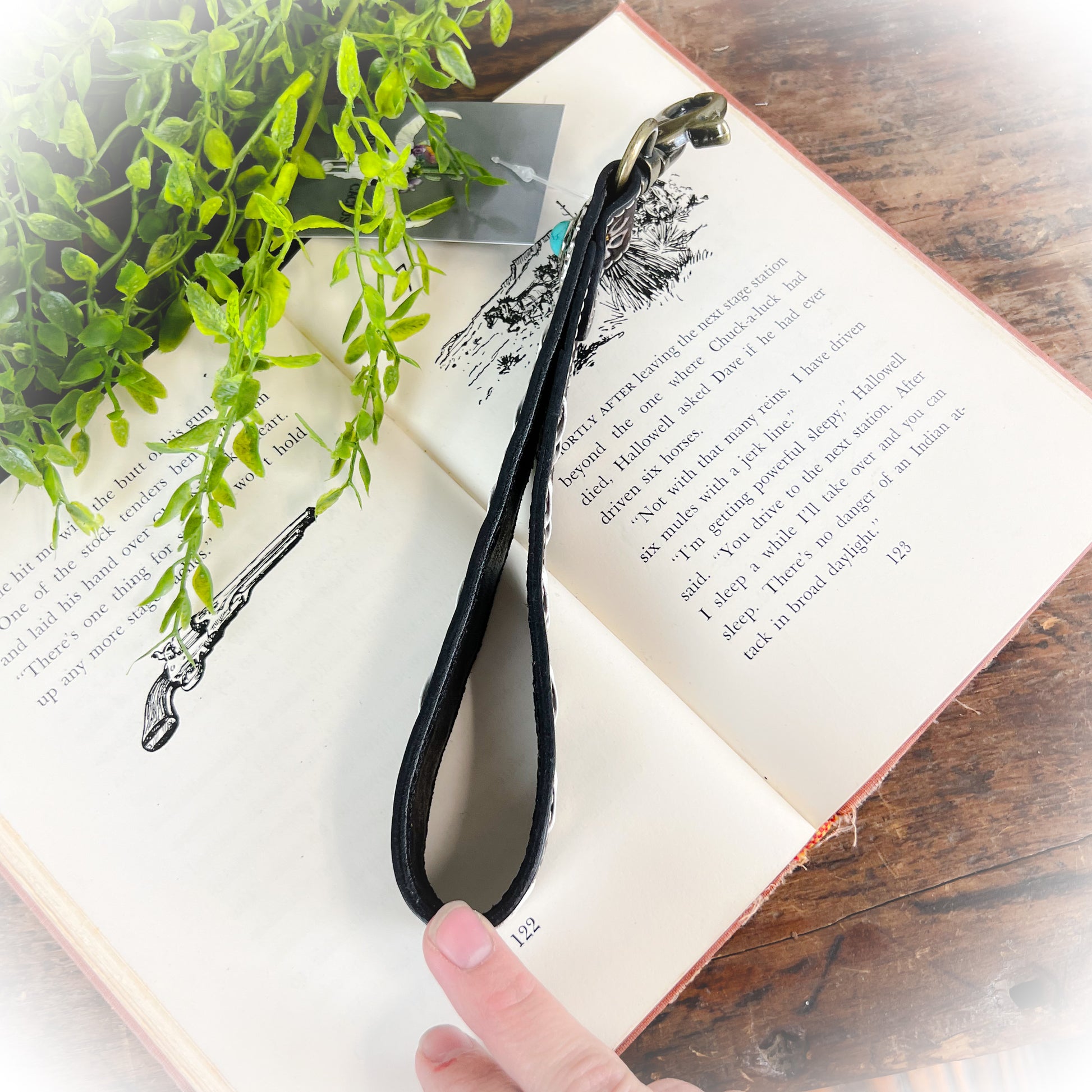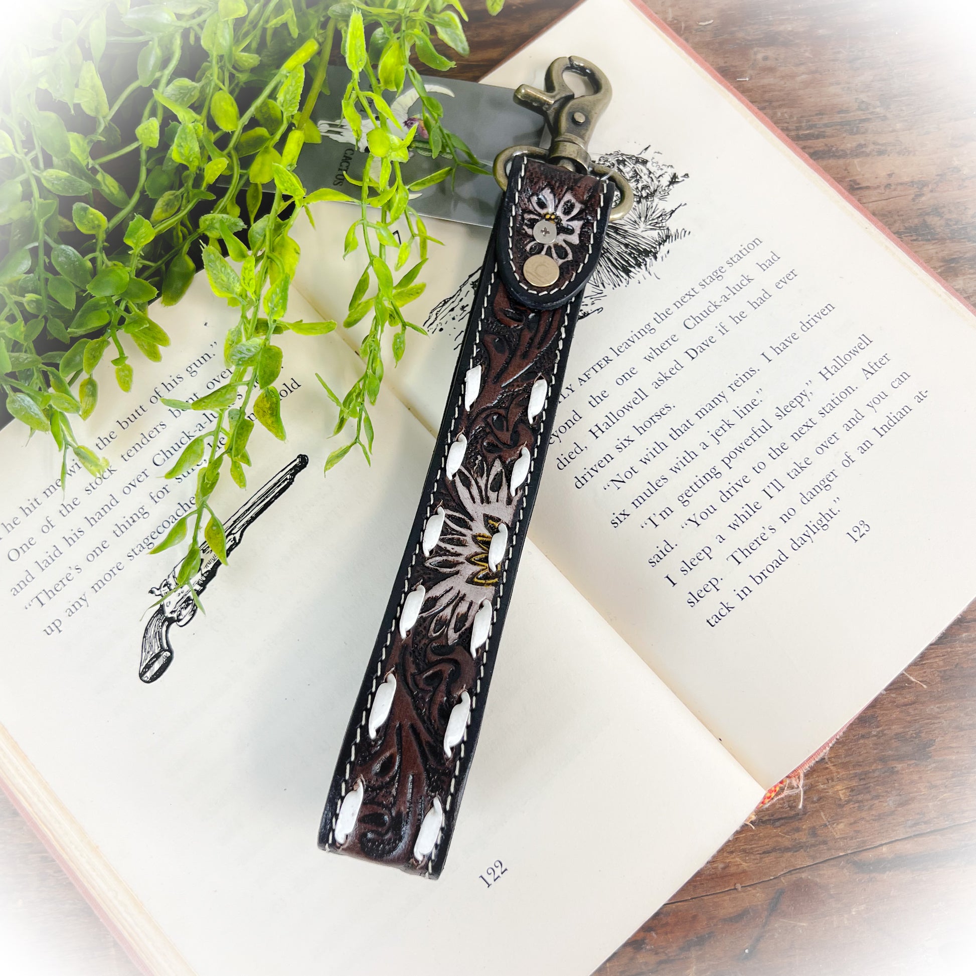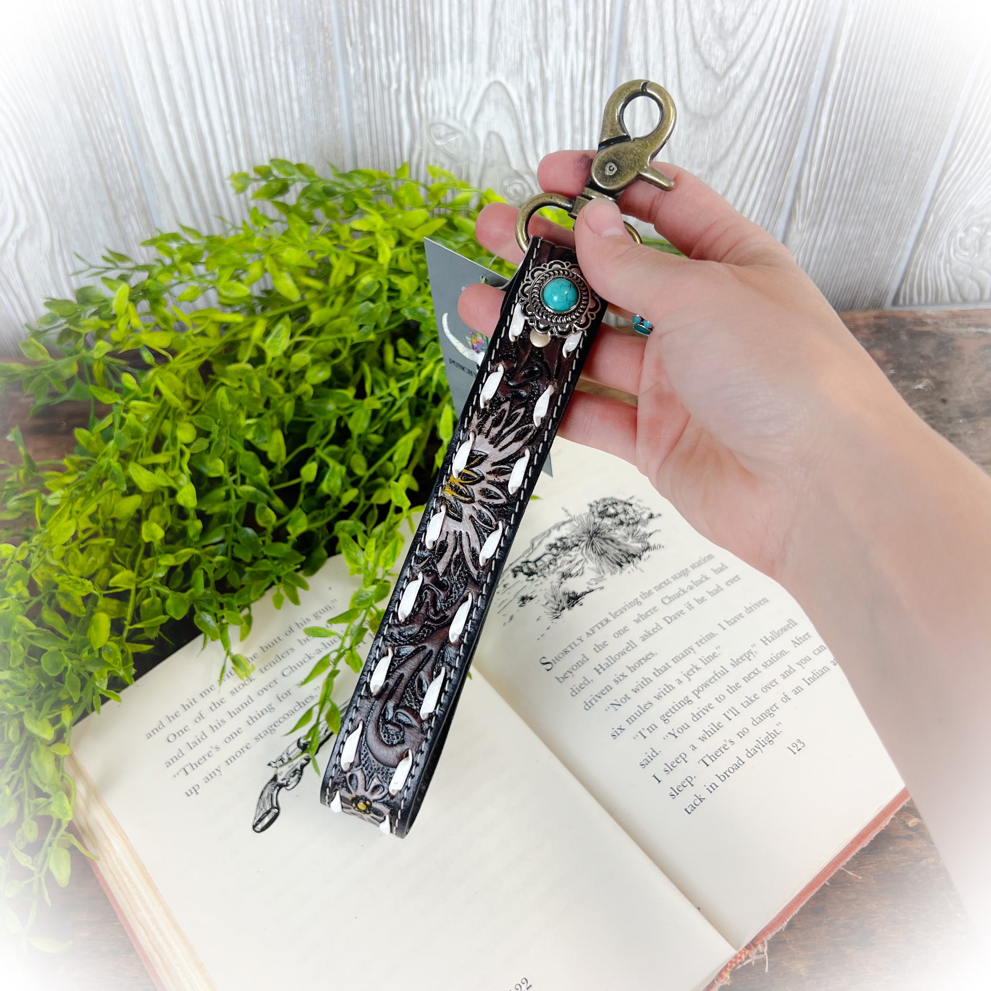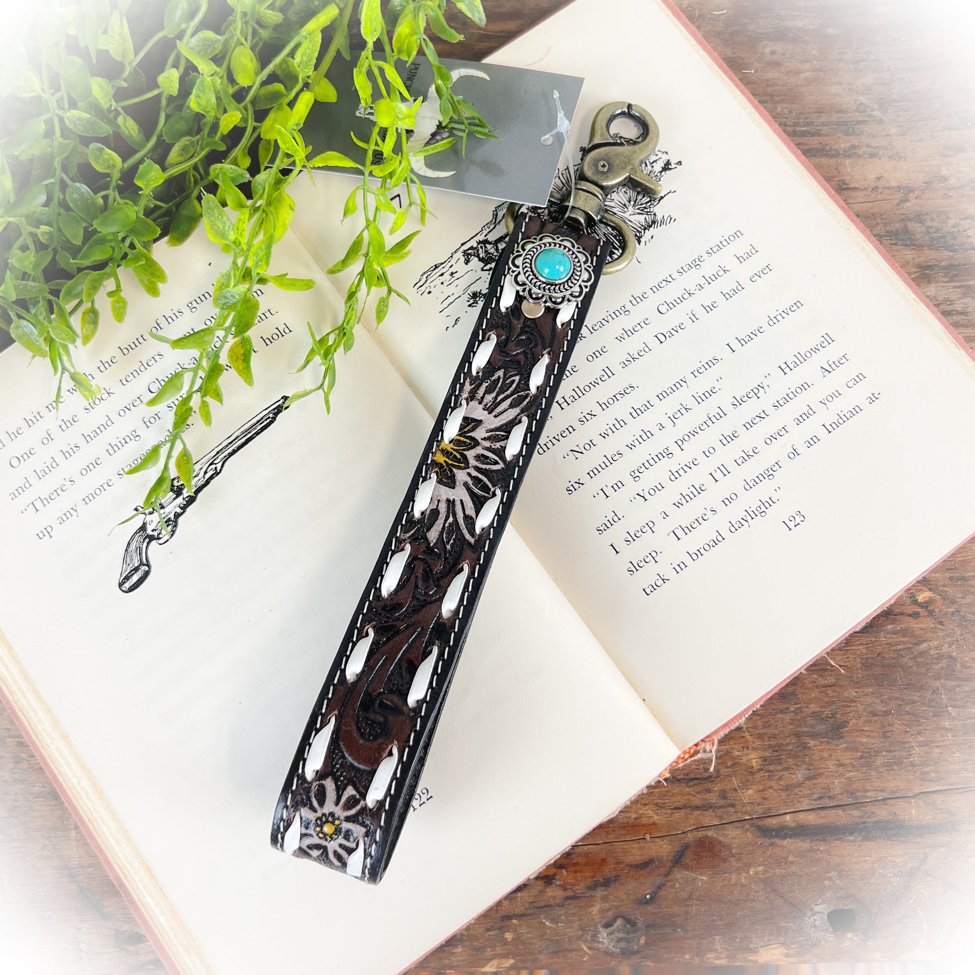 Turn your everyday grab-and-go into a bold western statement with the Western Daisy Tooled Leather Keychain. Crafted with rich dark brown and black leather, this beauty features hand-tooled white floral designs, crisp white buckstitching, and a stunning turquoise stone concho for that perfect pop of color.