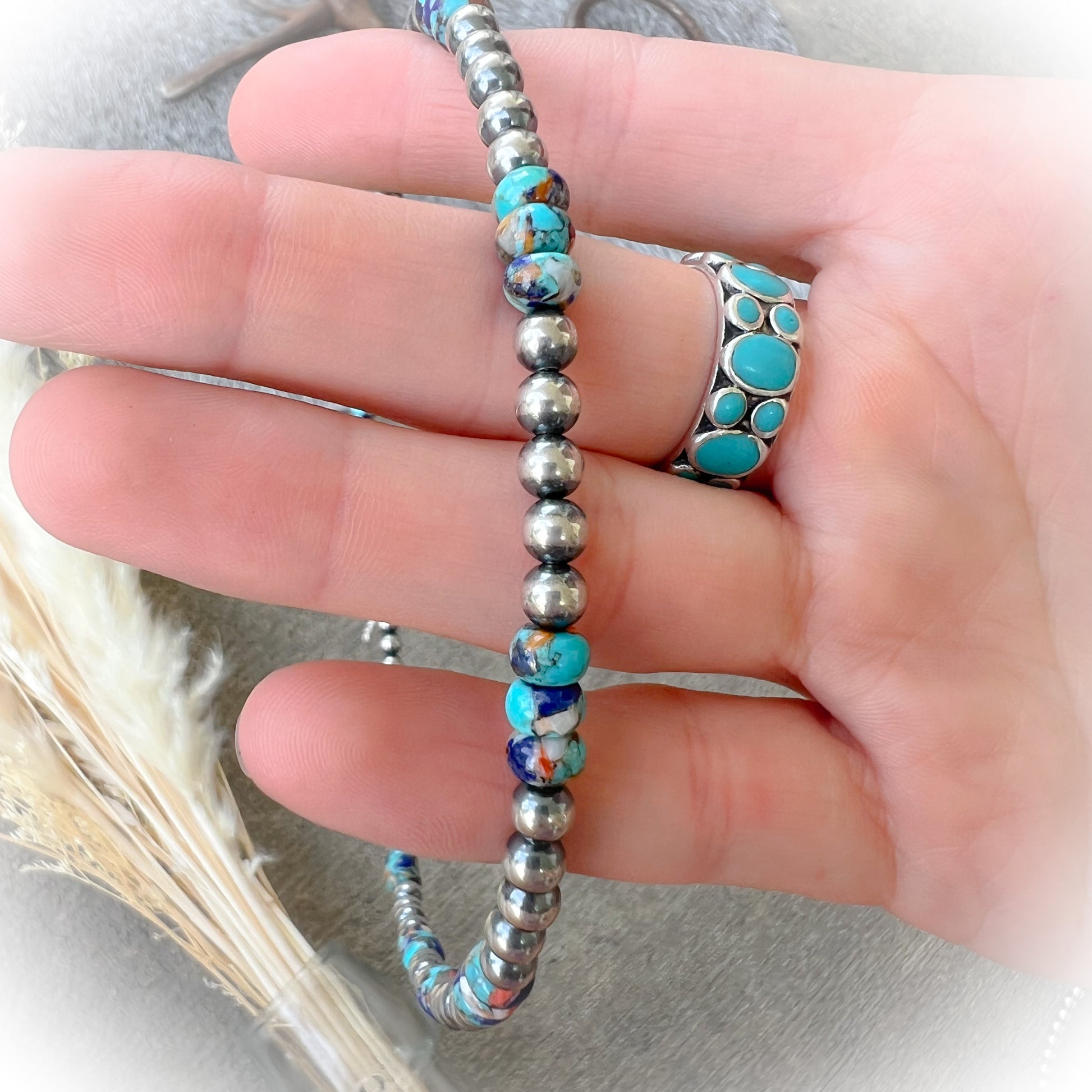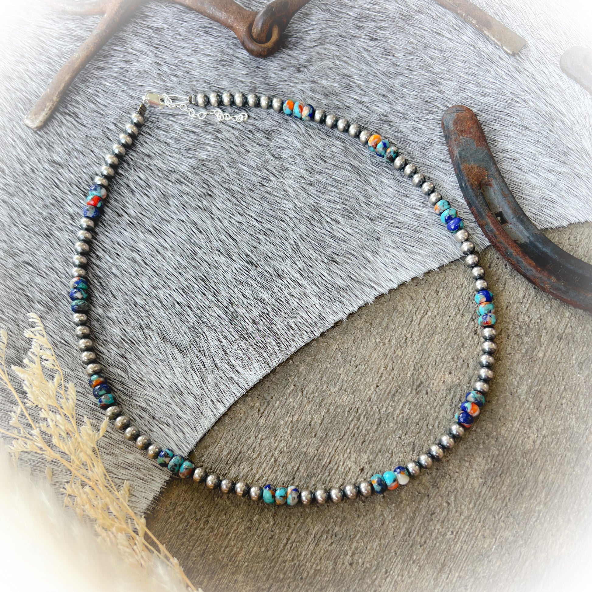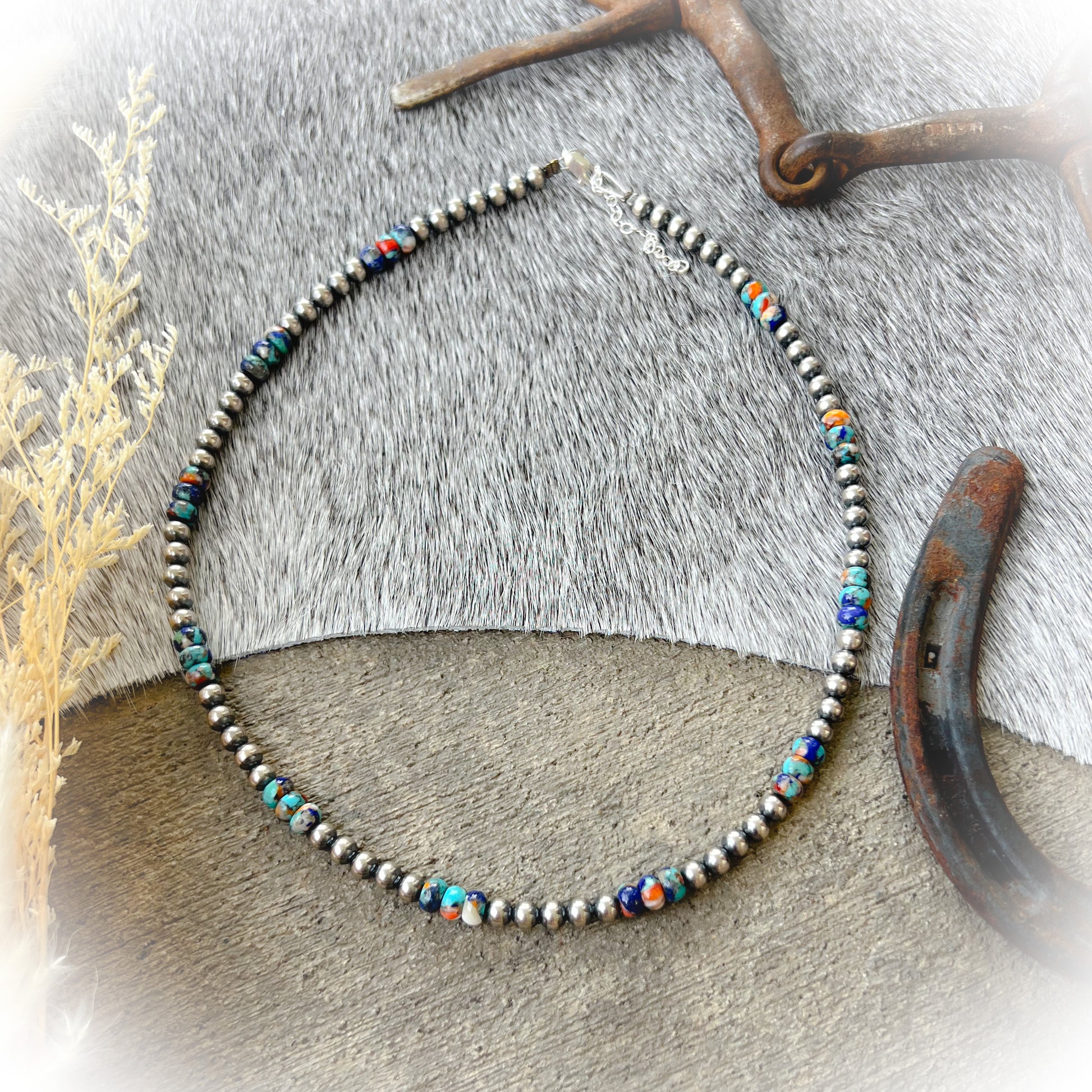 dd a one-of-a-kind statement to your western jewelry collection with this 18-inch Sterling Silver Pearl Necklace, beautifully accented with rare lapis, vibrant spiny oyster, and turquoise rondelle beads. The 5mm machine-made sterling silver pearls are hand-strung in the USA by a small business, blending artisan craftsmanship with lasting quality. A 3-inch extension allows for adjustable length, while the 6mm rondelle beads and naturally varied pink conch accents ensure each piece is truly unique.