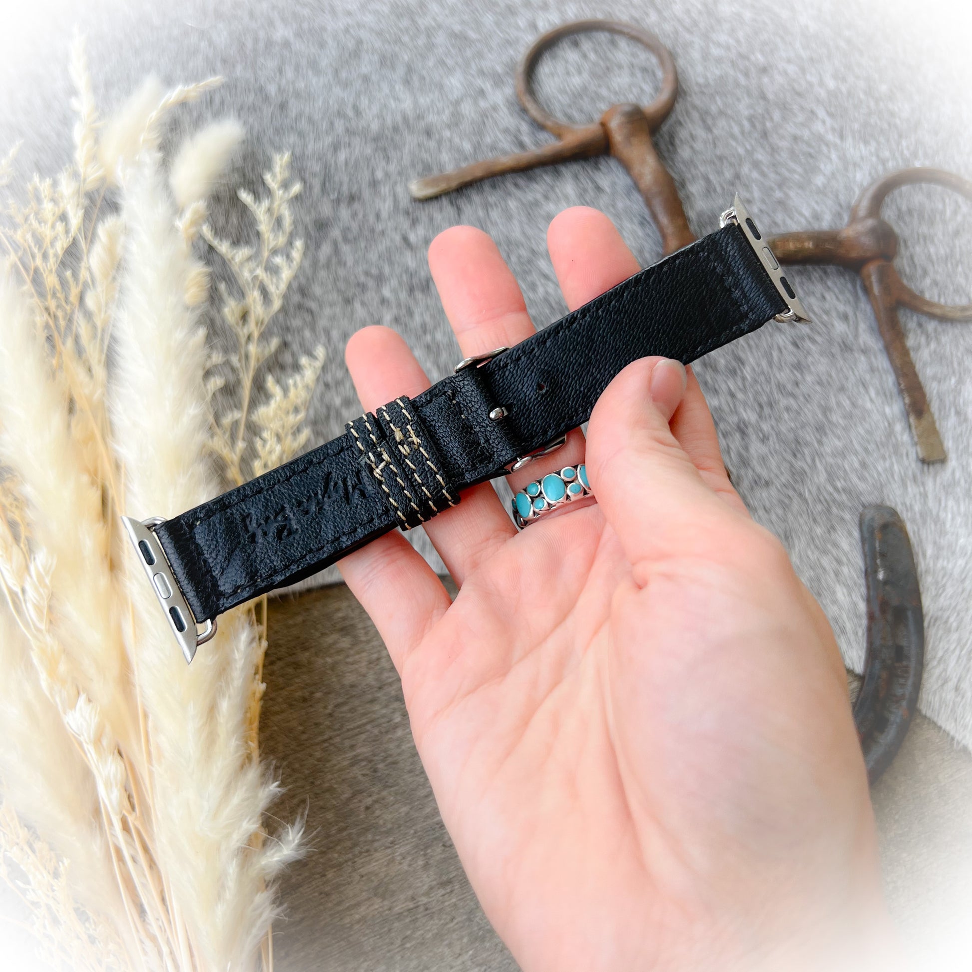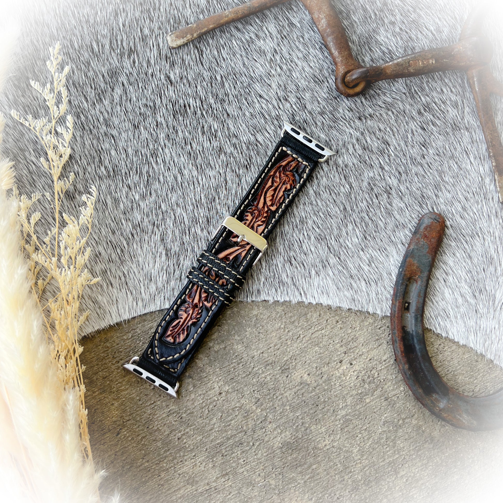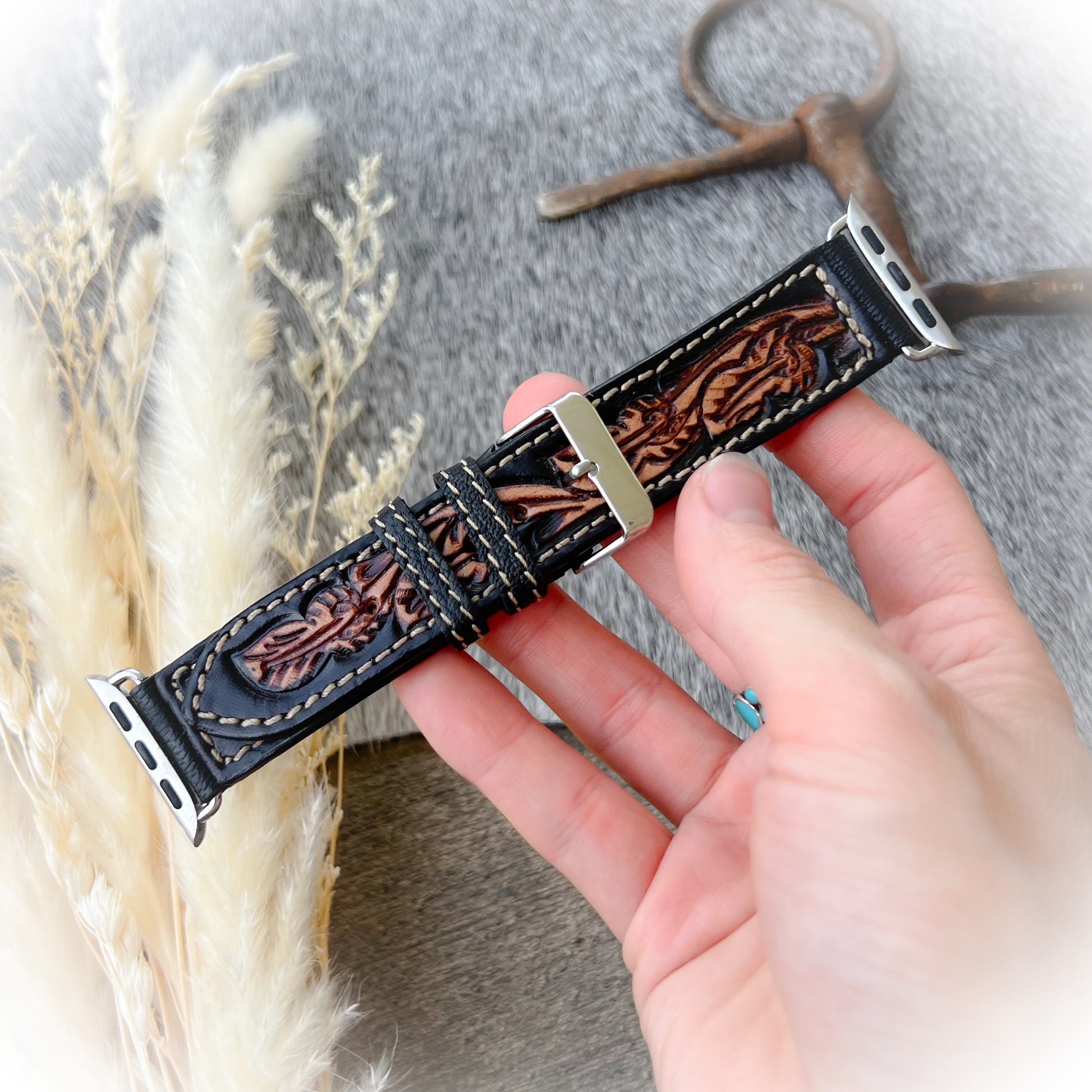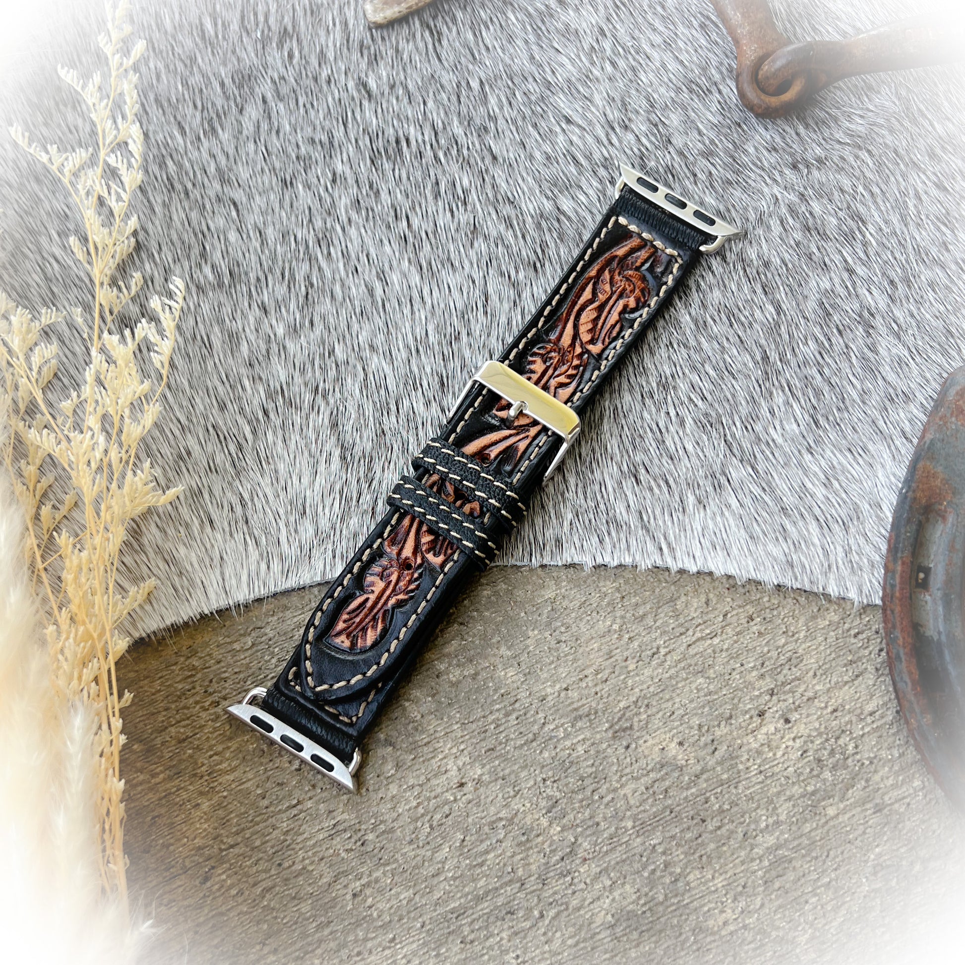 Western Tooled Leather Watch Band – Black & Brown (38mm–40mm)*