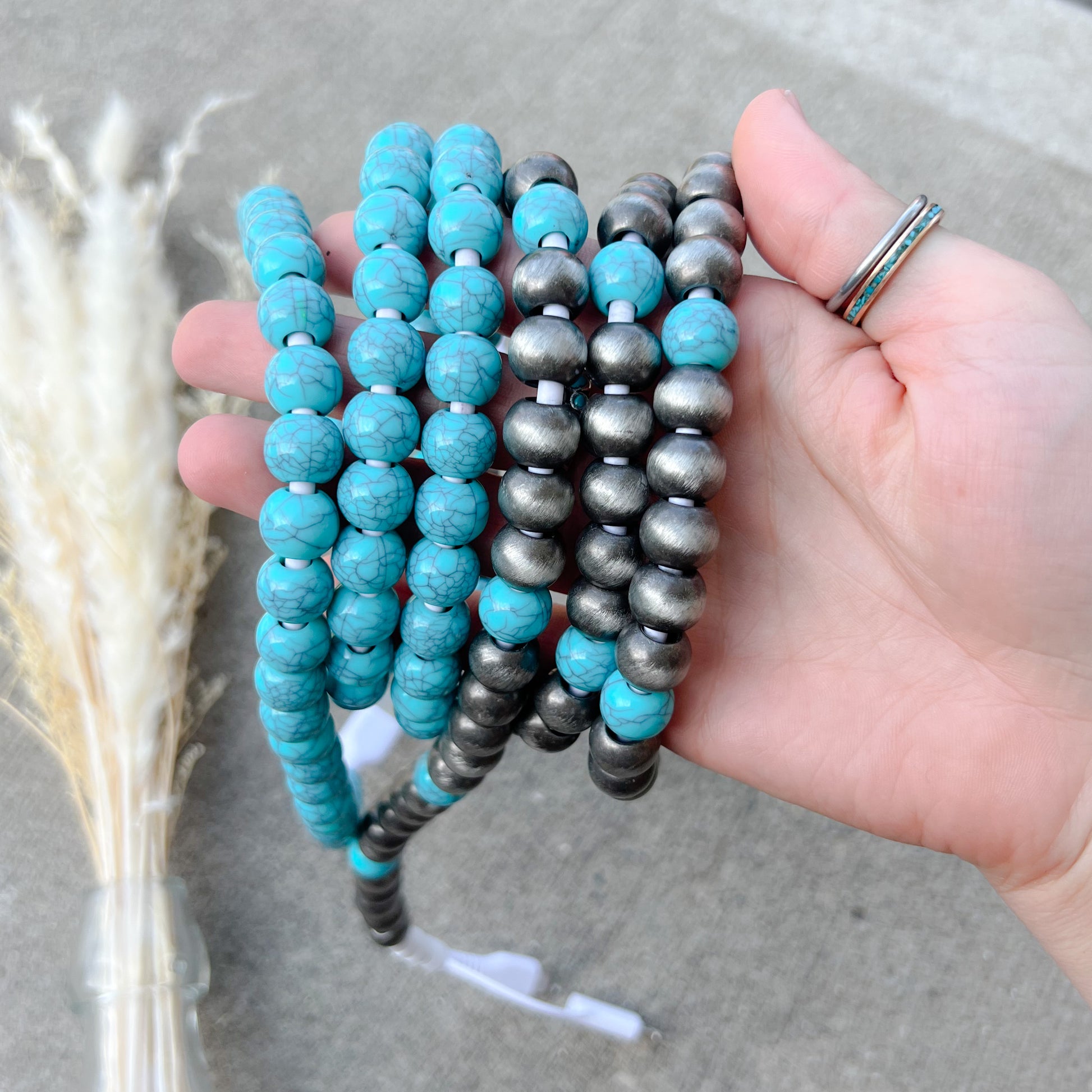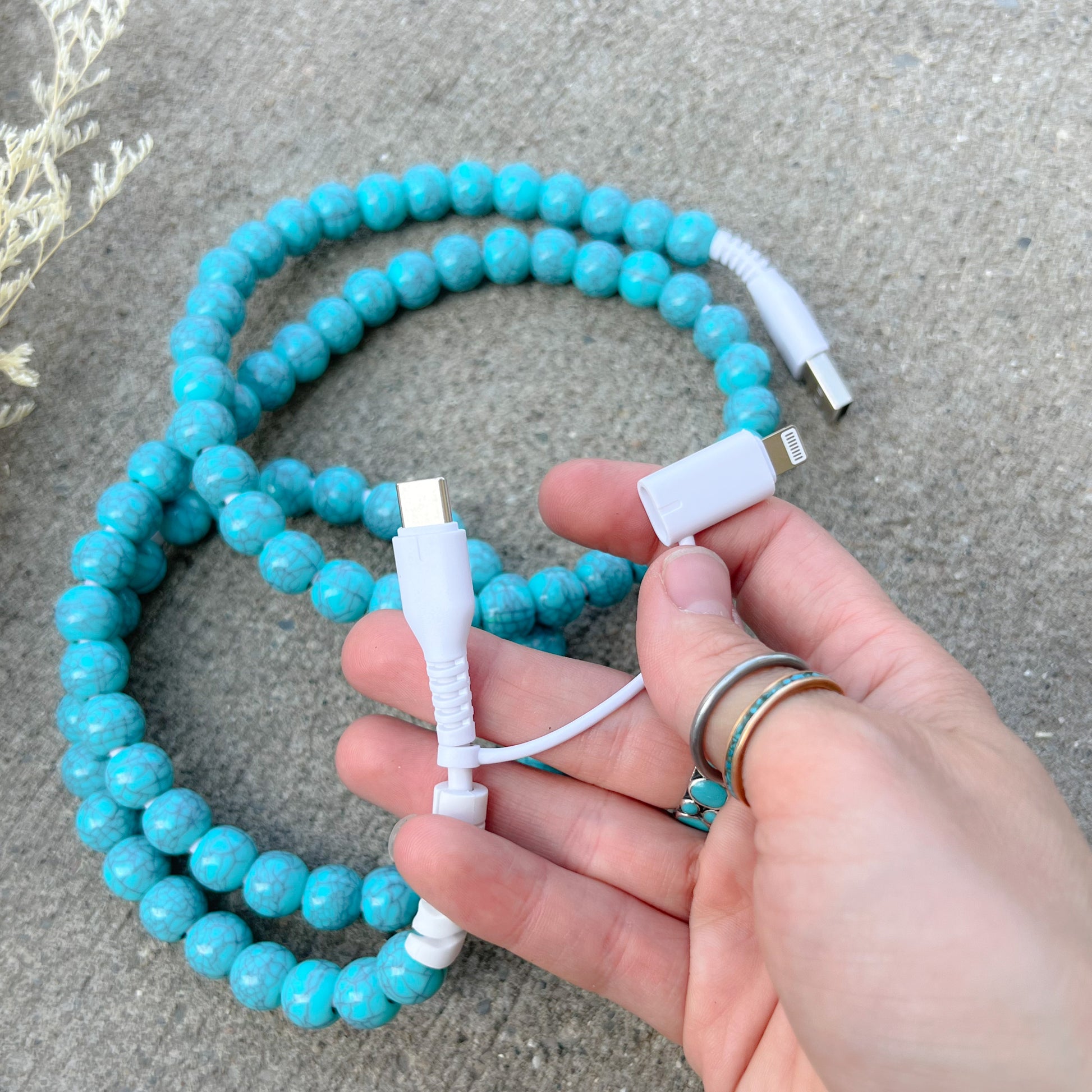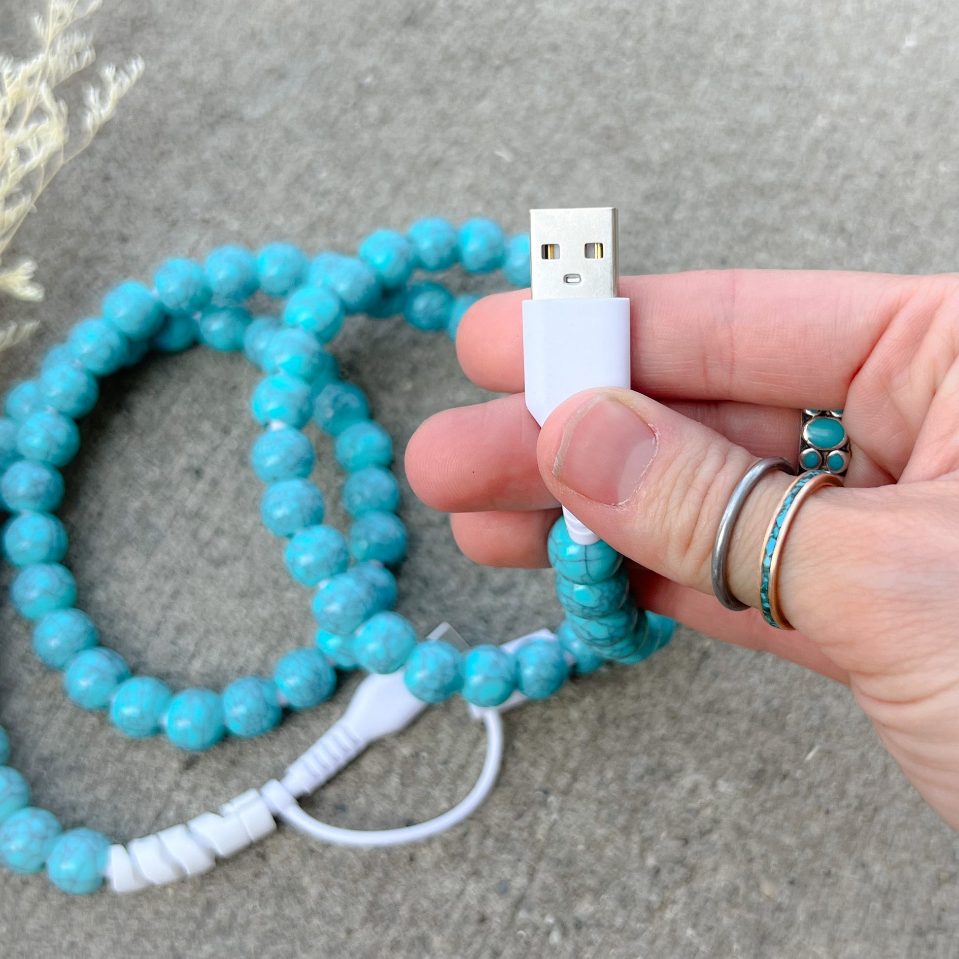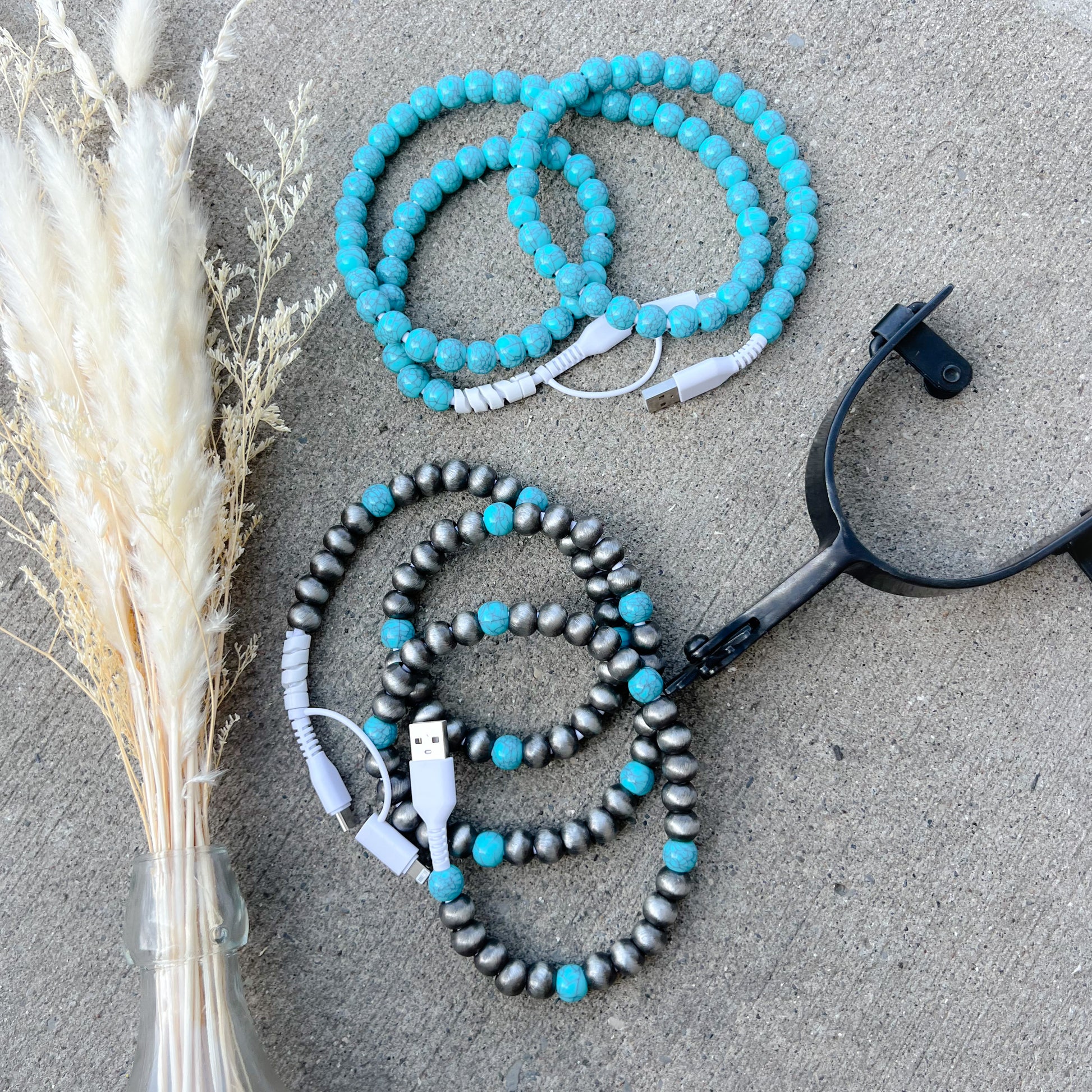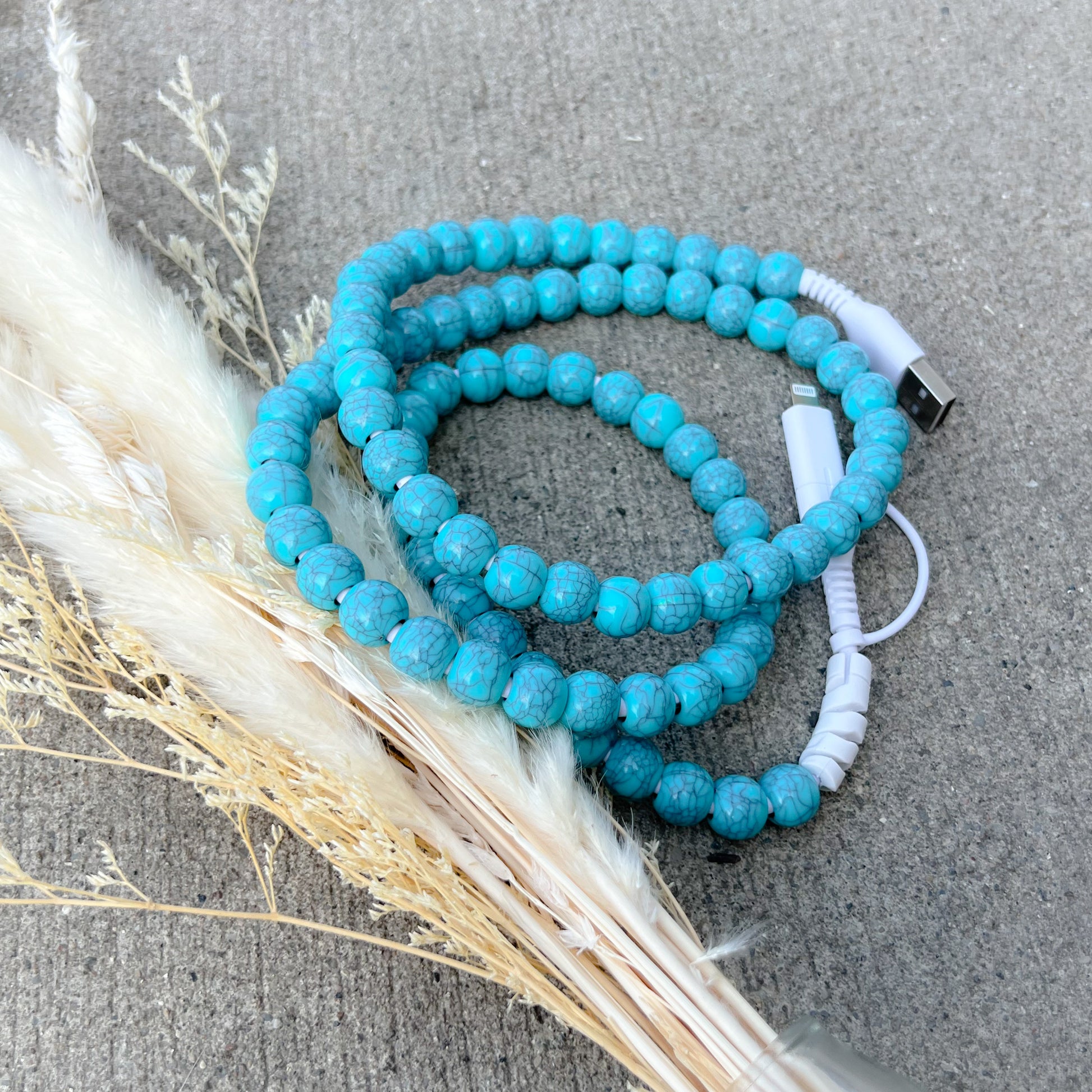 Charge your phone in true western style with our Western Beaded Charging Cord, featuring a stunning strand of faux turquoise beads that give your everyday tech a bold, boho edge.