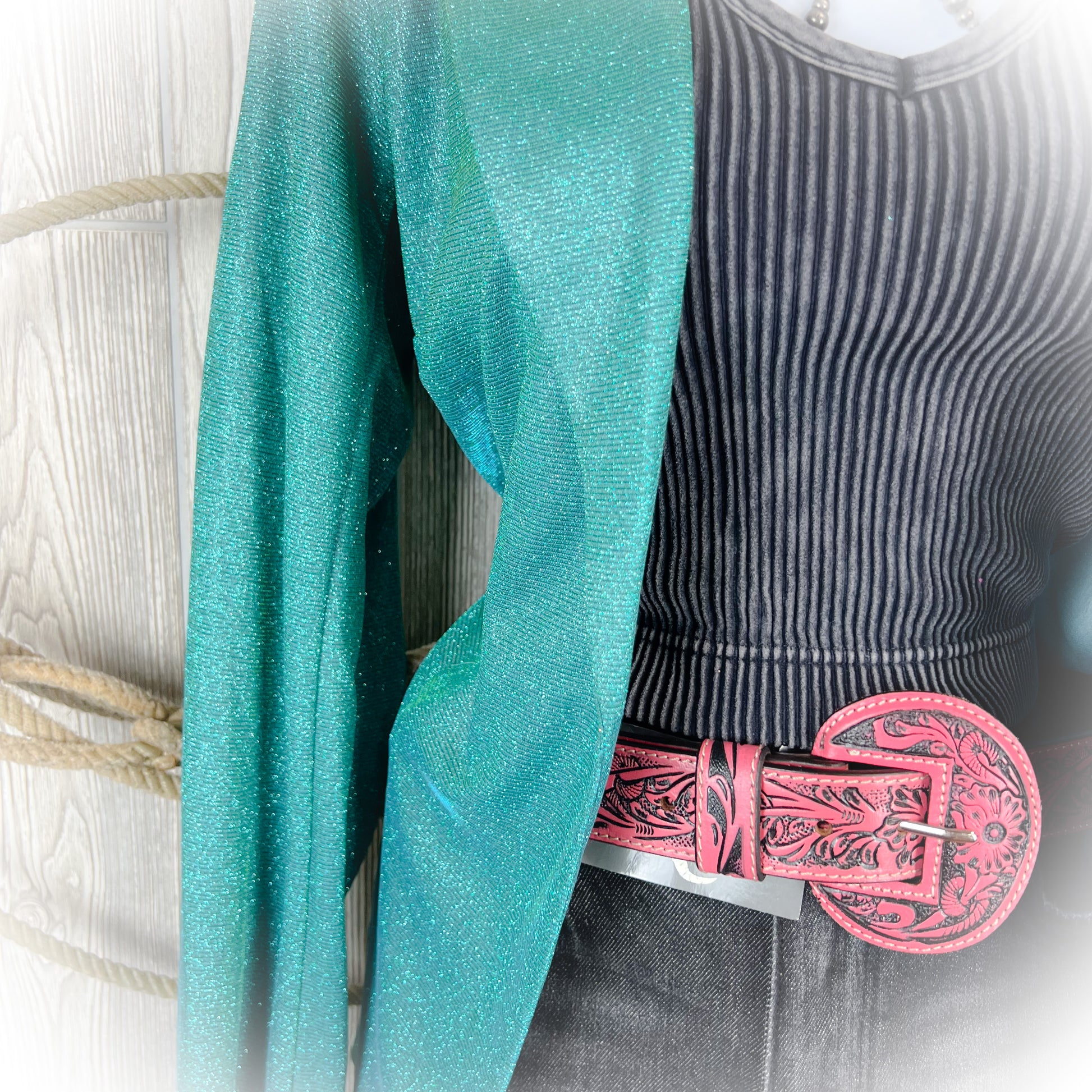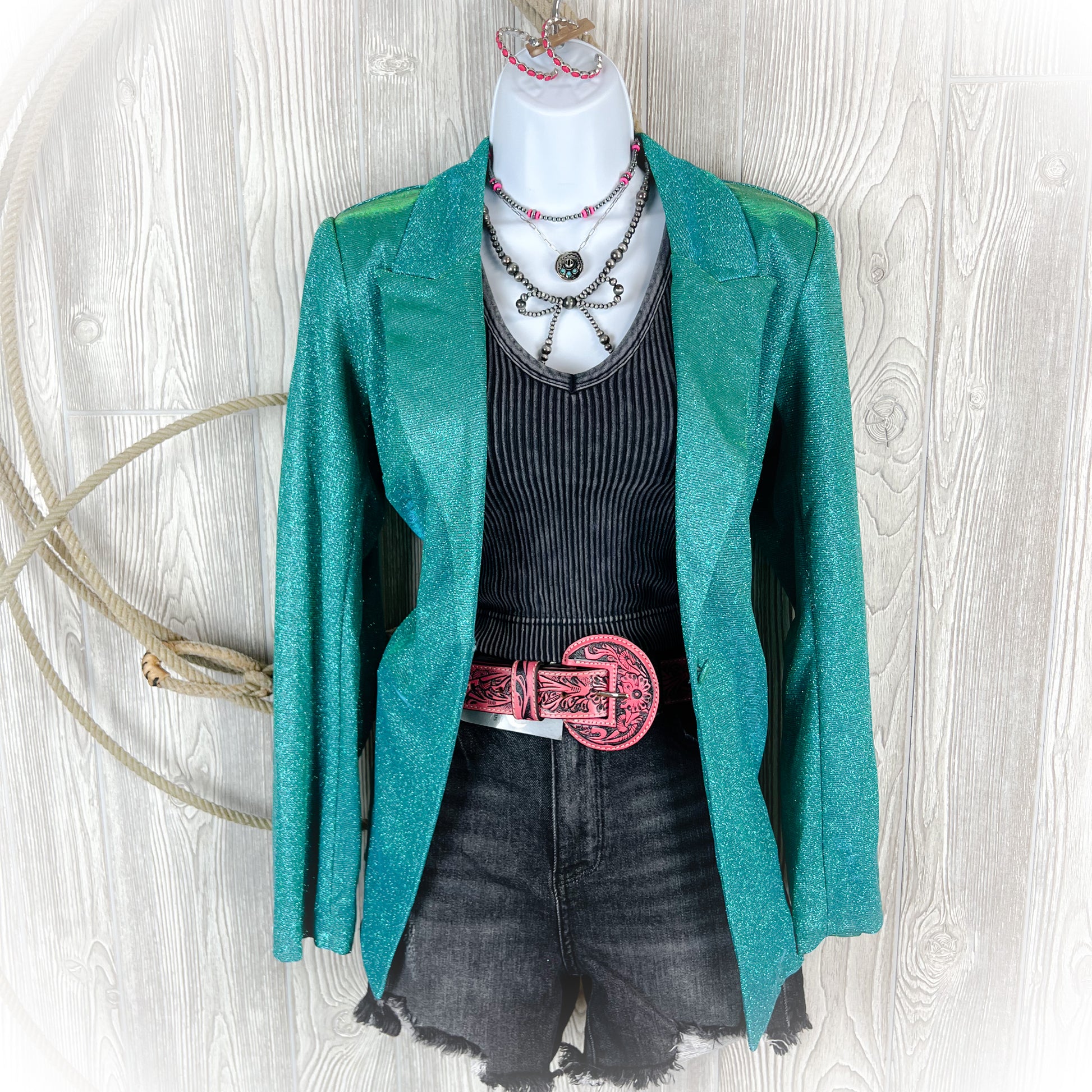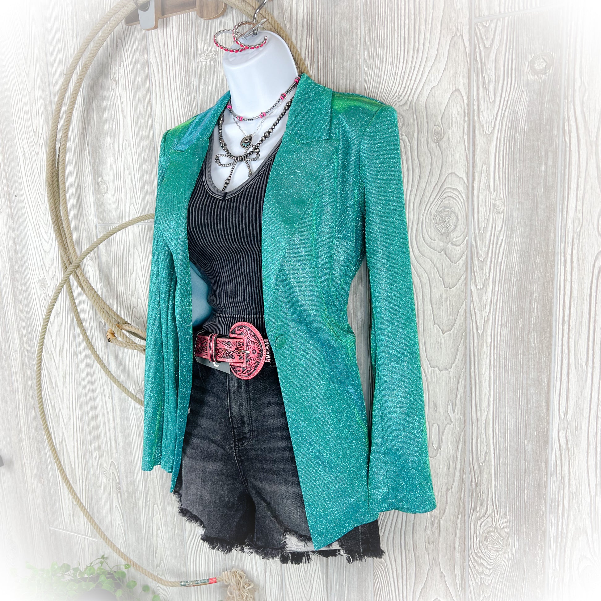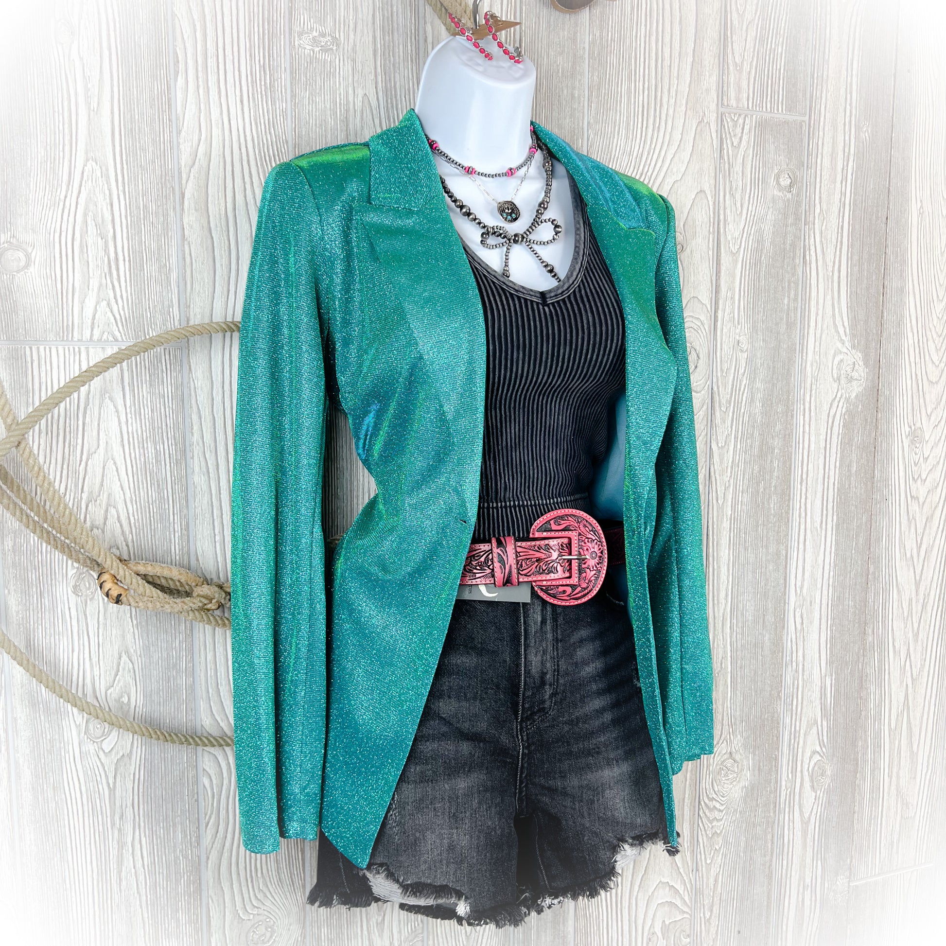 Turn heads and shine bright with the Western Turquoise Sparkly Iridescent Blazer, the perfect statement piece for rodeo nights, NFR events, and holiday parties. Crafted from 100% polyester, this blazer features a vibrant turquoise hue with a dazzling iridescent sparkle that catches the light from every angle. Designed to fit true to size, it’s tailored for a flattering silhouette while keeping comfort in mind. Pair it with denim for a bold western edge or dress pants for a chic holiday look.