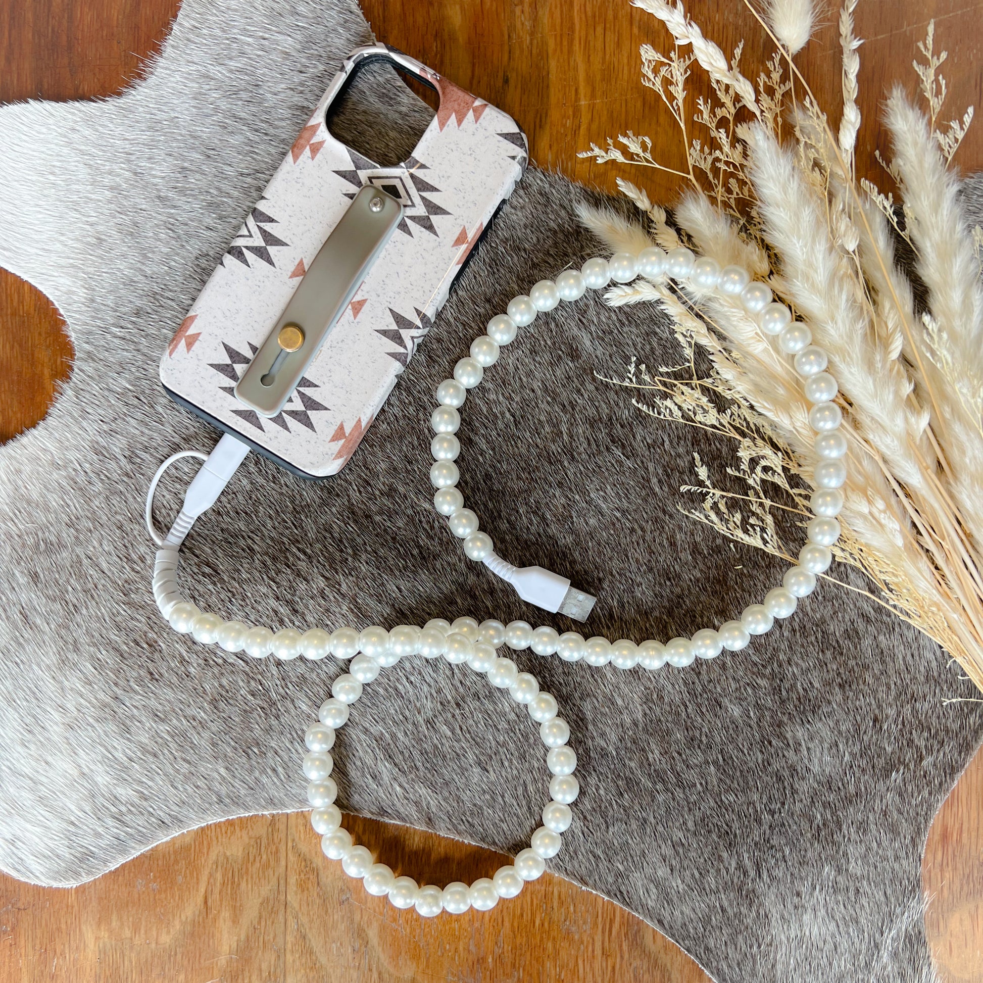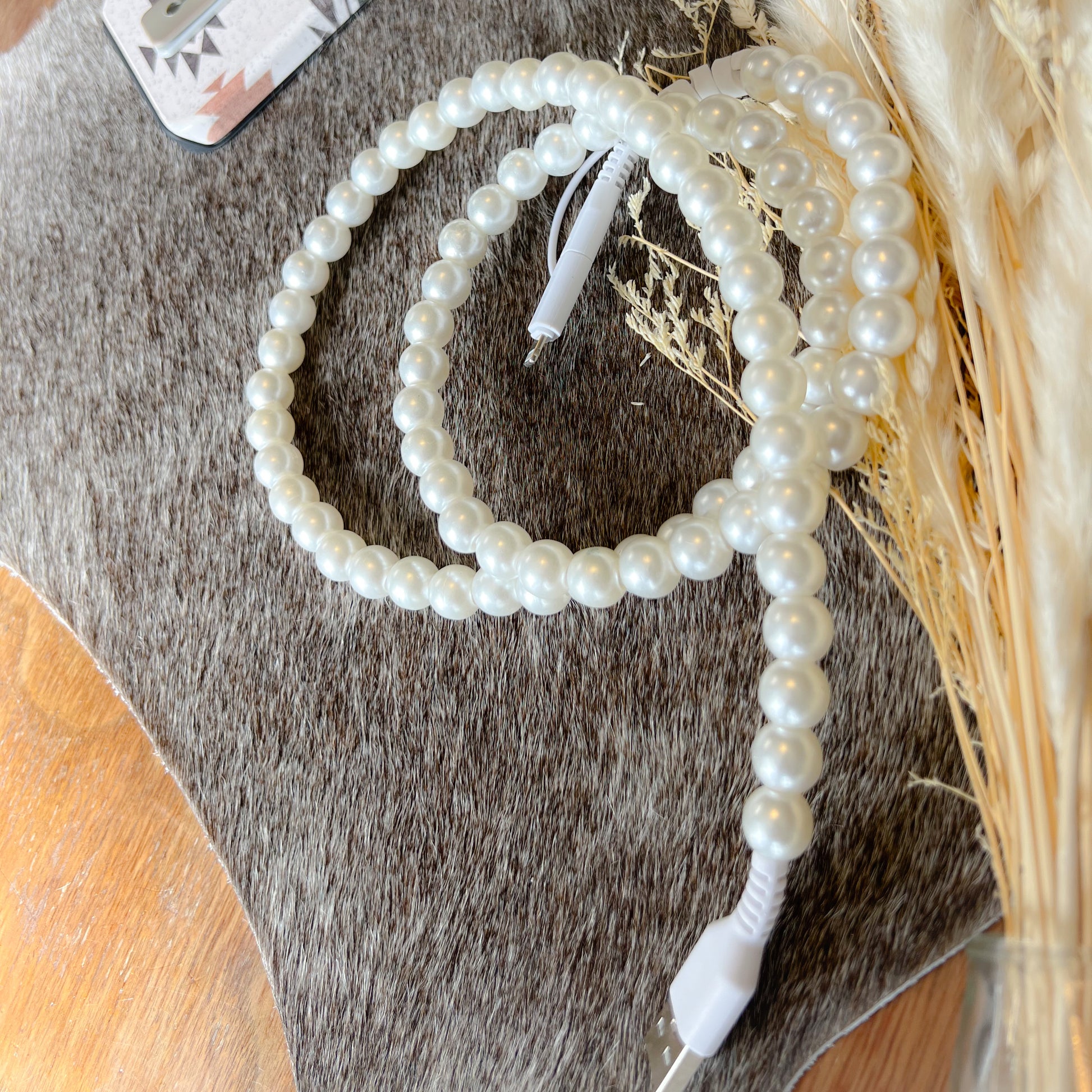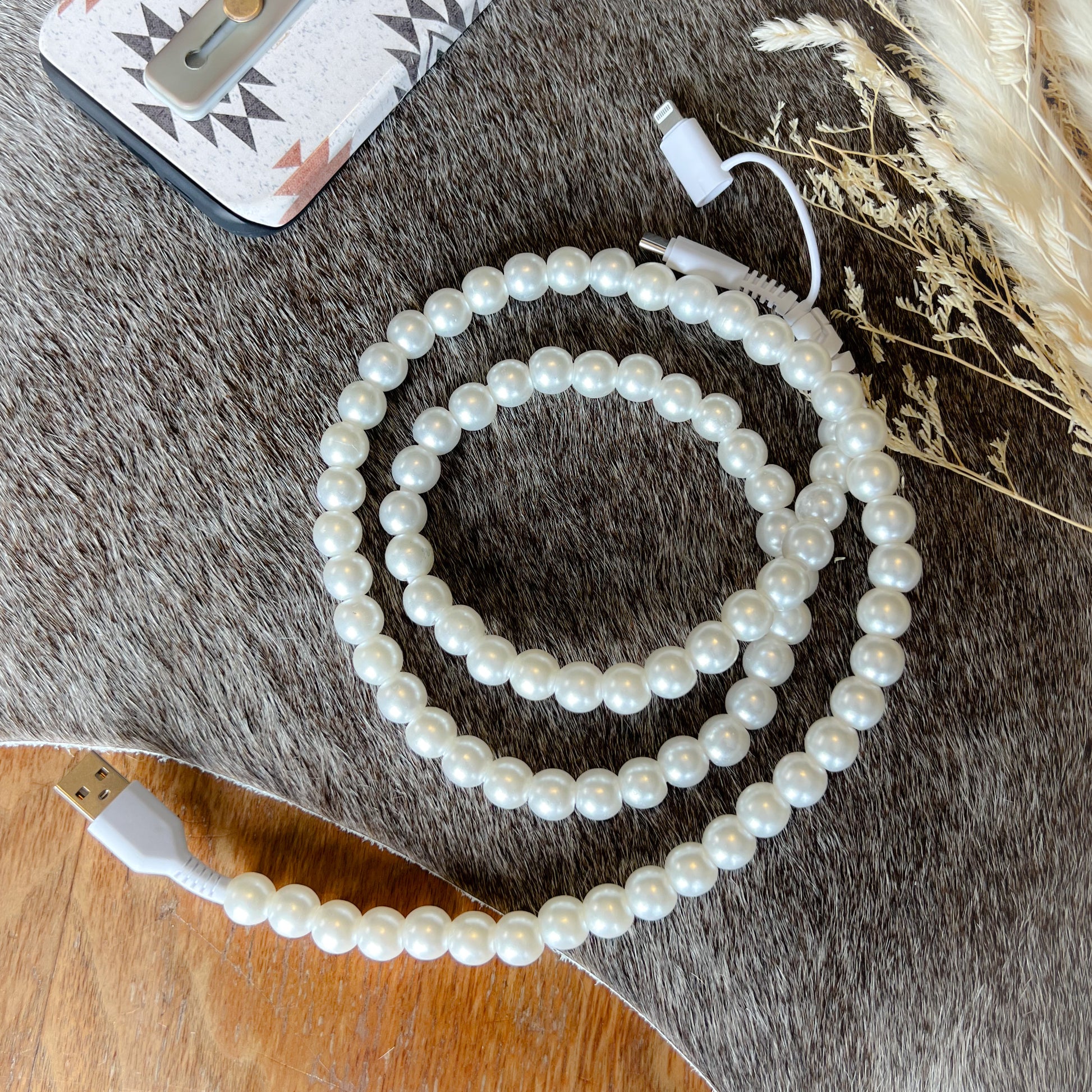 Charge in style with this Western glam twist on a tech essential! This 3-foot long white pearl beaded charger is the perfect mix of function and fashion. Designed to look like a statement accessory.