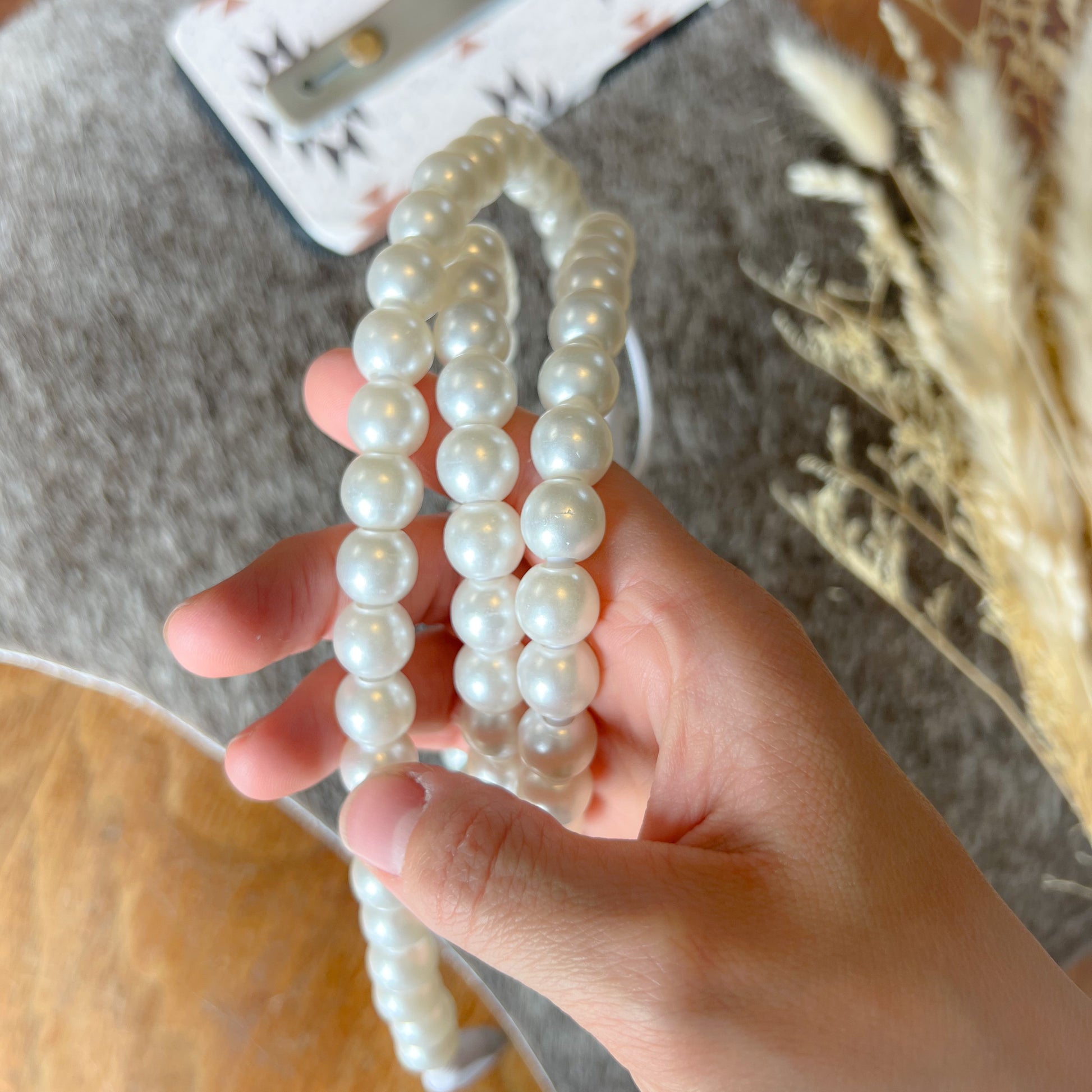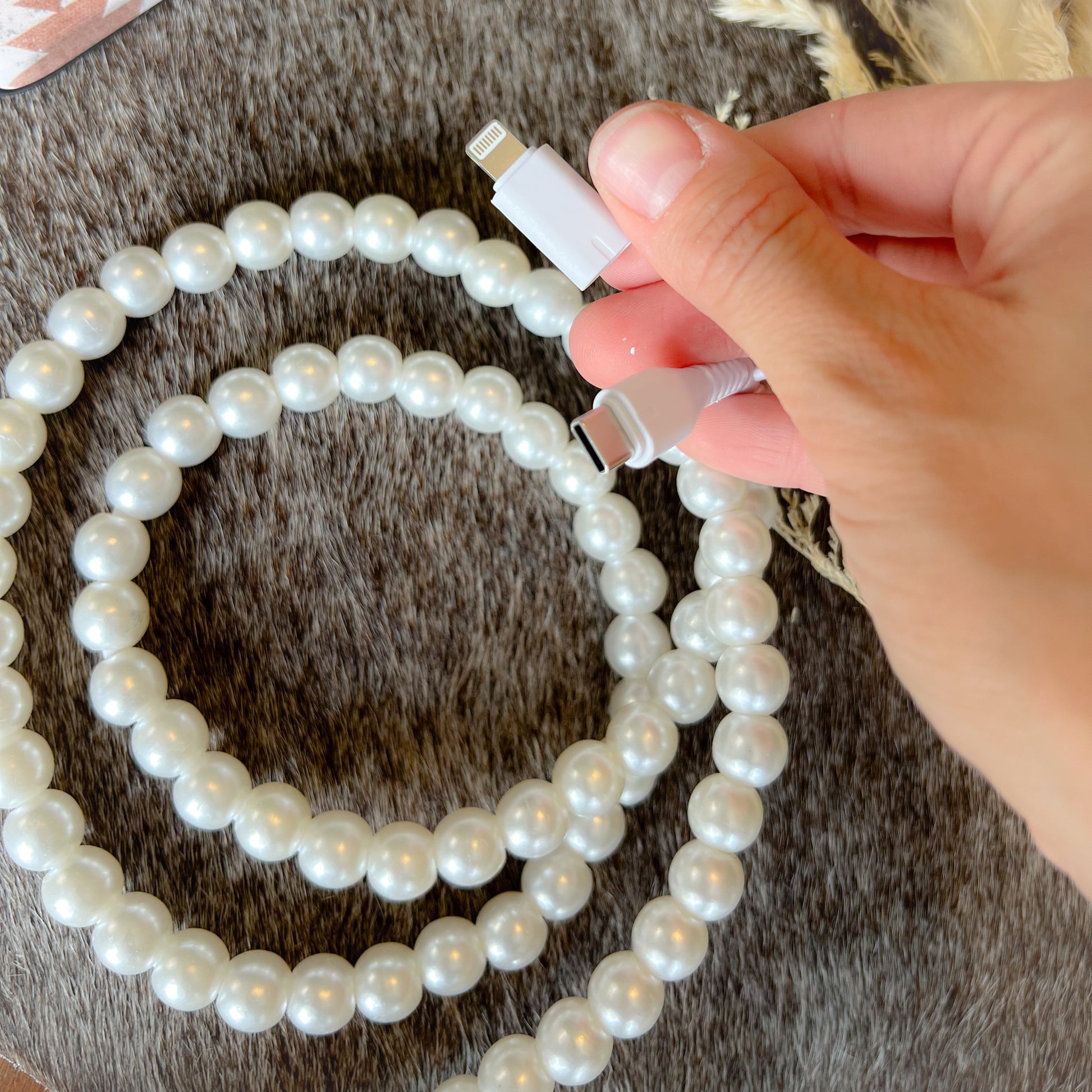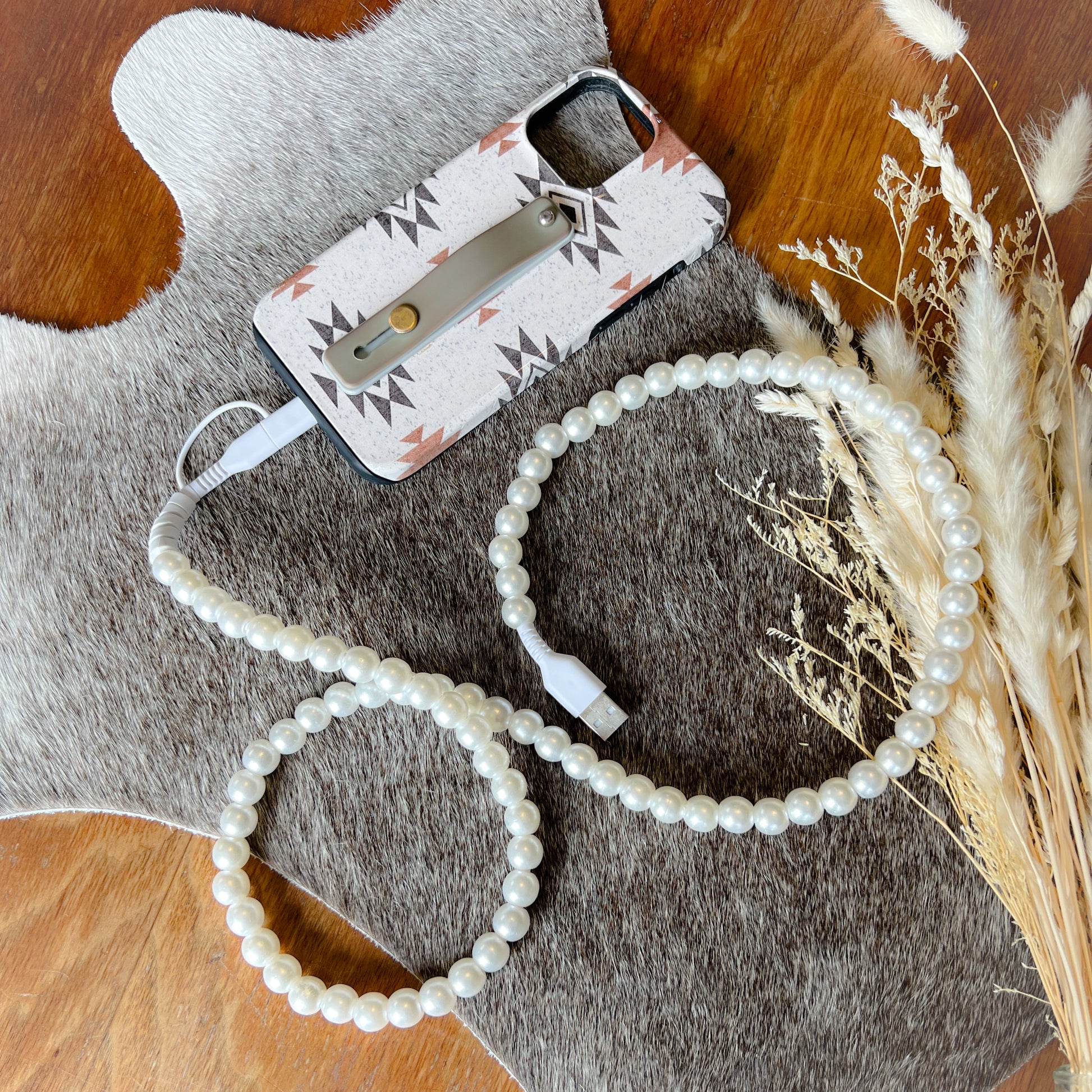 Charge in style with this Western glam twist on a tech essential! This 3-foot long white pearl beaded charger is the perfect mix of function and fashion. Designed to look like a statement accessory.