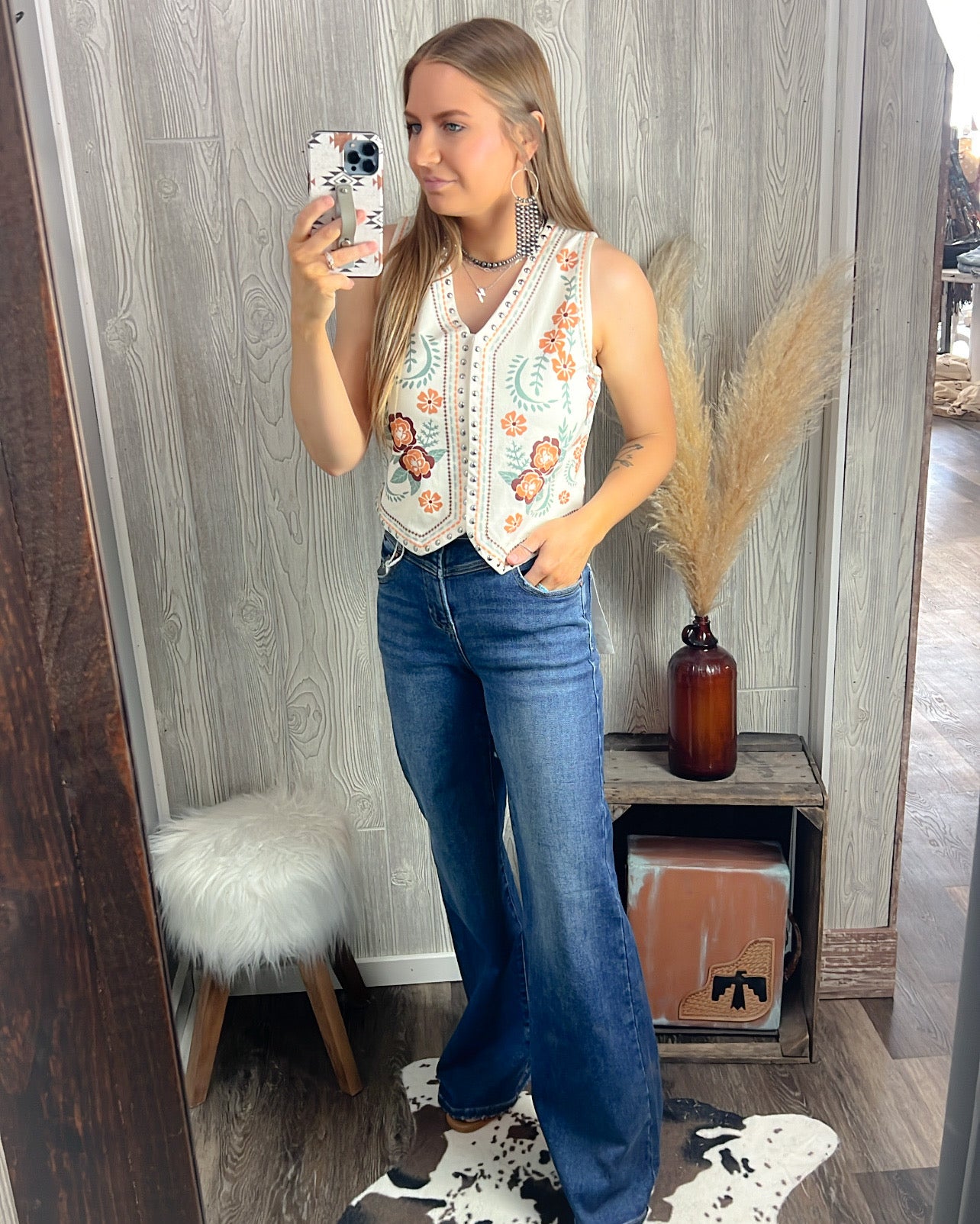 Meet the statement piece you didn’t know your western wardrobe was missing. The Wildflower Ridge Vest brings together boho floral charm and cowgirl edge with an off-white cotton base, delicate floral print, and silver stud detailing along the border for that perfect pop of western attitude.