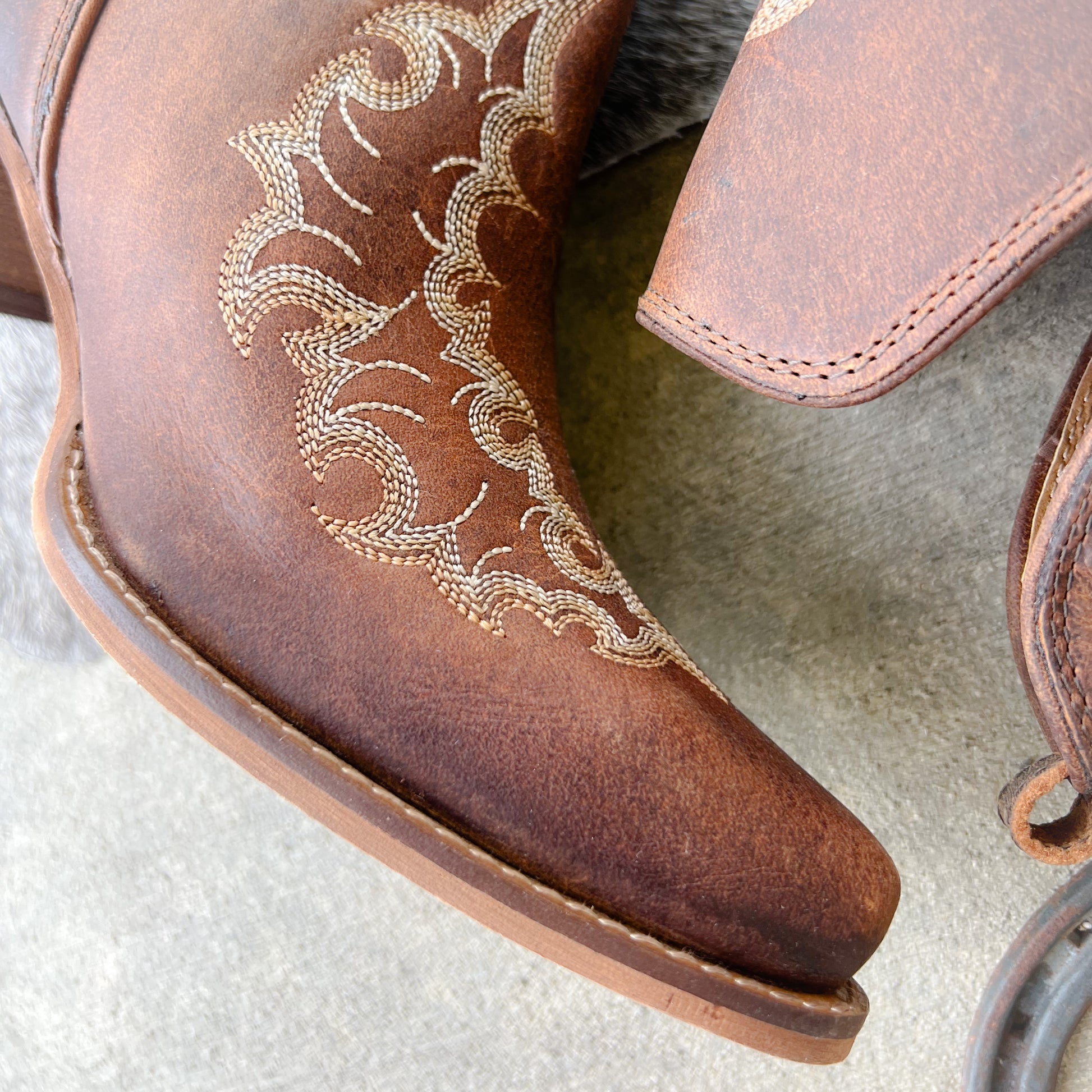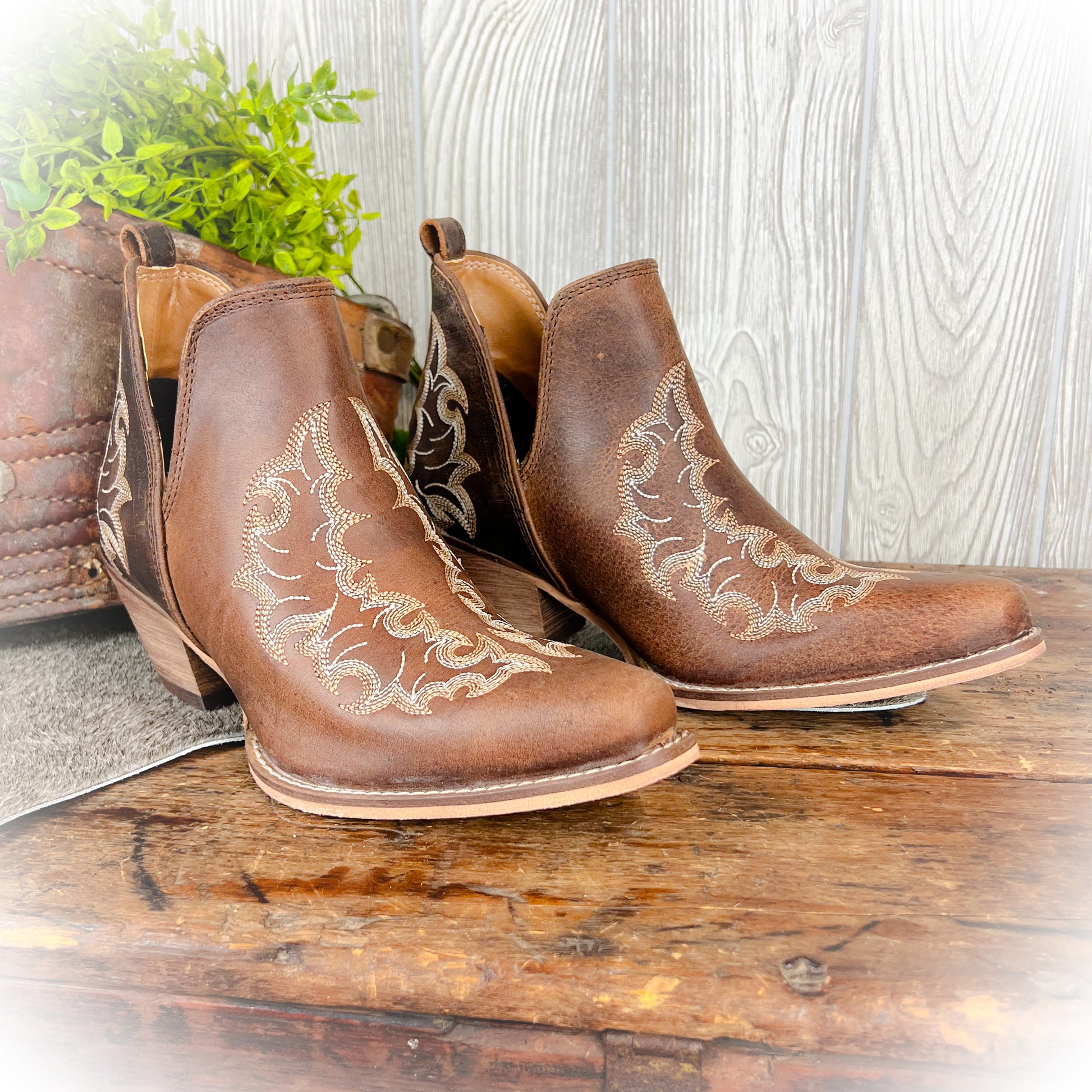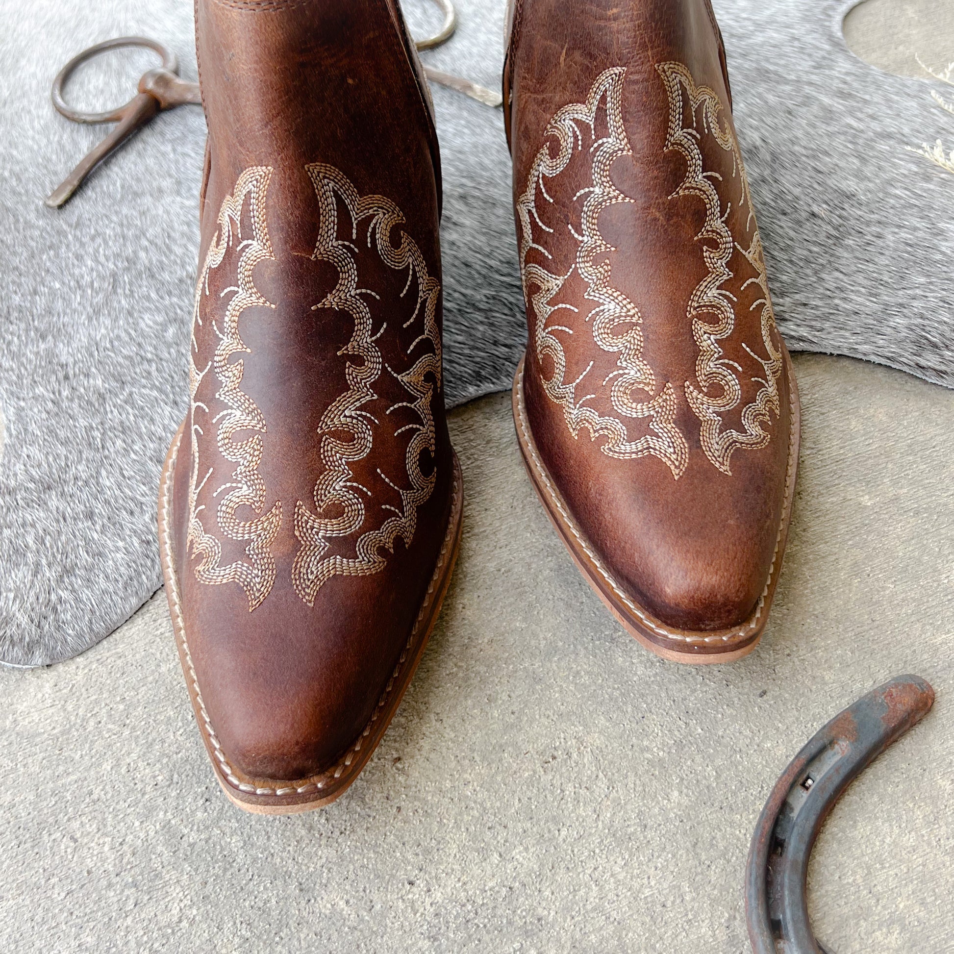 Meet your new go-to booties, the Willow Leather Booties blend rustic charm with refined western style. Made from genuine leather in a rich cognac hue, these booties feature delicate scroll embroidery that adds just the right touch of femininity and detail.