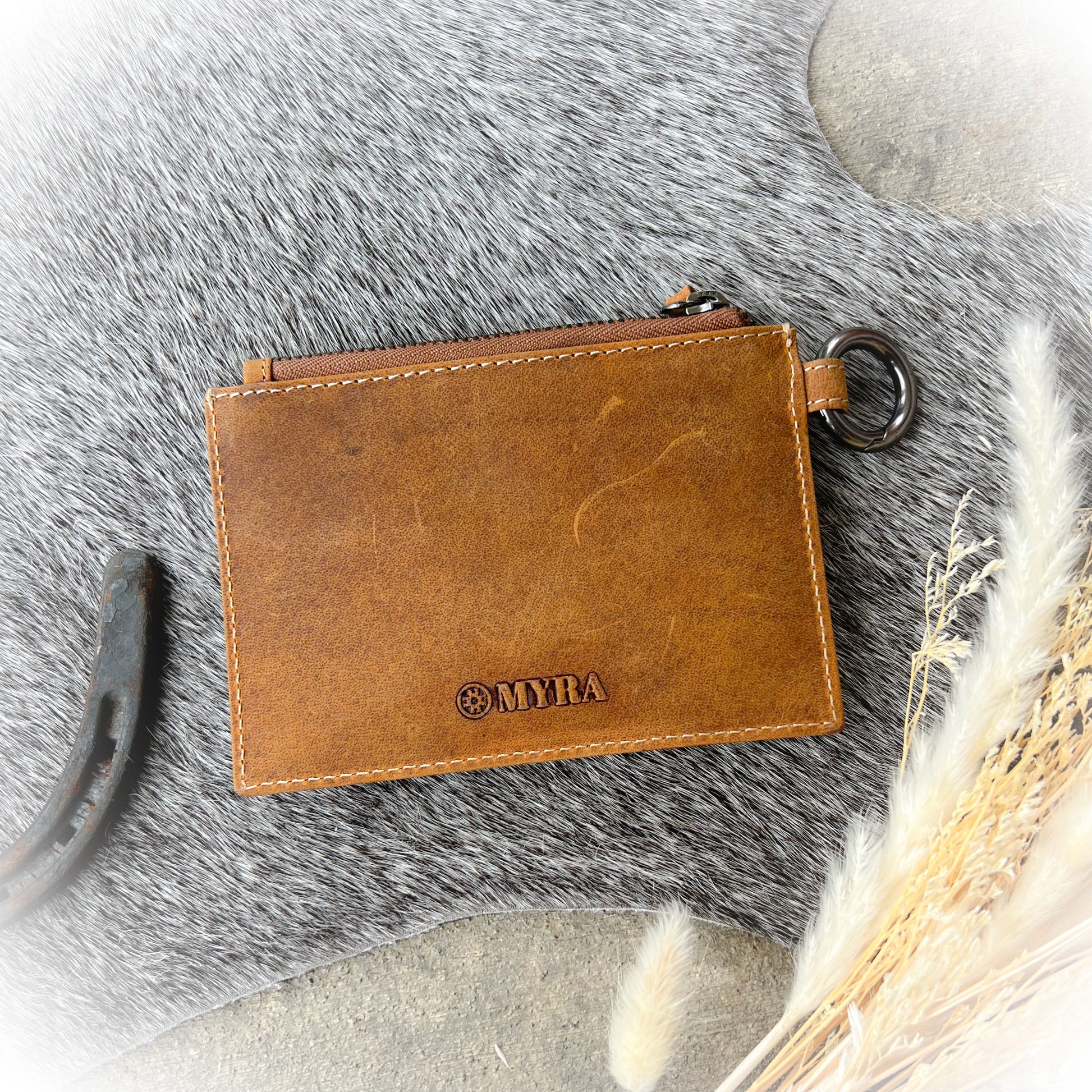 Embrace minimalist Western style with this compact card keeper, featuring authentic hair-on hide framed by desert-worn leather. Perfect for the modern trail blazer, this mini-wallet combines ranch-inspired design with city sophistication. The secure snap closure and handy key ring keep your essentials close at hand.